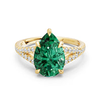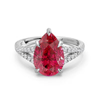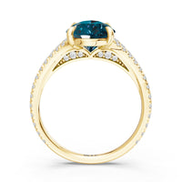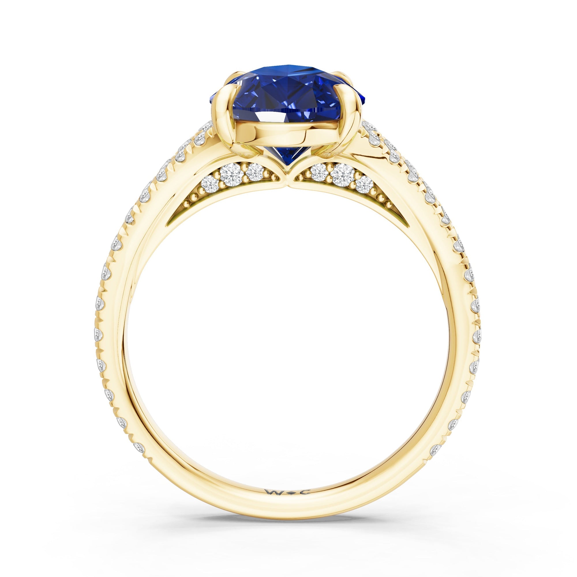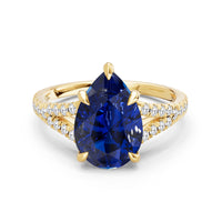 A pear-shaped Blue Sapphire rises at the tip of a split shank, its deep hue evoking the night sky. A single row of diamonds traces each arm of the band, leading the eye upward. The curved, rounded bridge is also dusted with diamonds, reflecting the quiet grace of a starry night.
