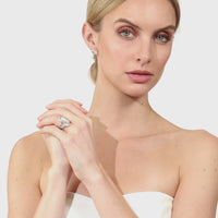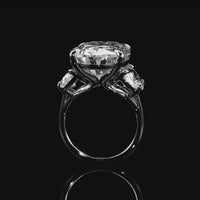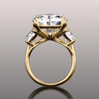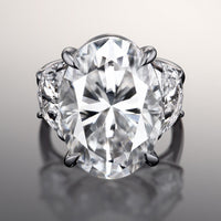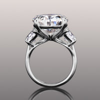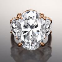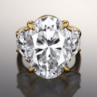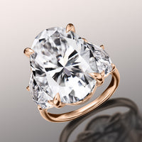 A clean and cultivated aesthetic that leaves an impression of an enduring love. It ignites envy with its curving contours, sculptural look, and show-stealing brilliance. This sophisticated three-stone ring features a massive oval diamond center stone flanked by two half-moon diamond side stones on claw prongs. The side stones in half-moon or demilune-cut enhance the glow of the oval diamond centerpiece while giving the ring an extraordinary flair.