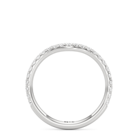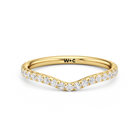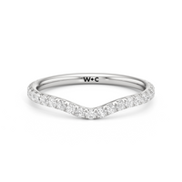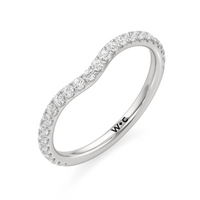 This curved diamond set wedding band is perfectly contoured to complement our the charlotte three stone engagement ring for a simple and sophisticated look.