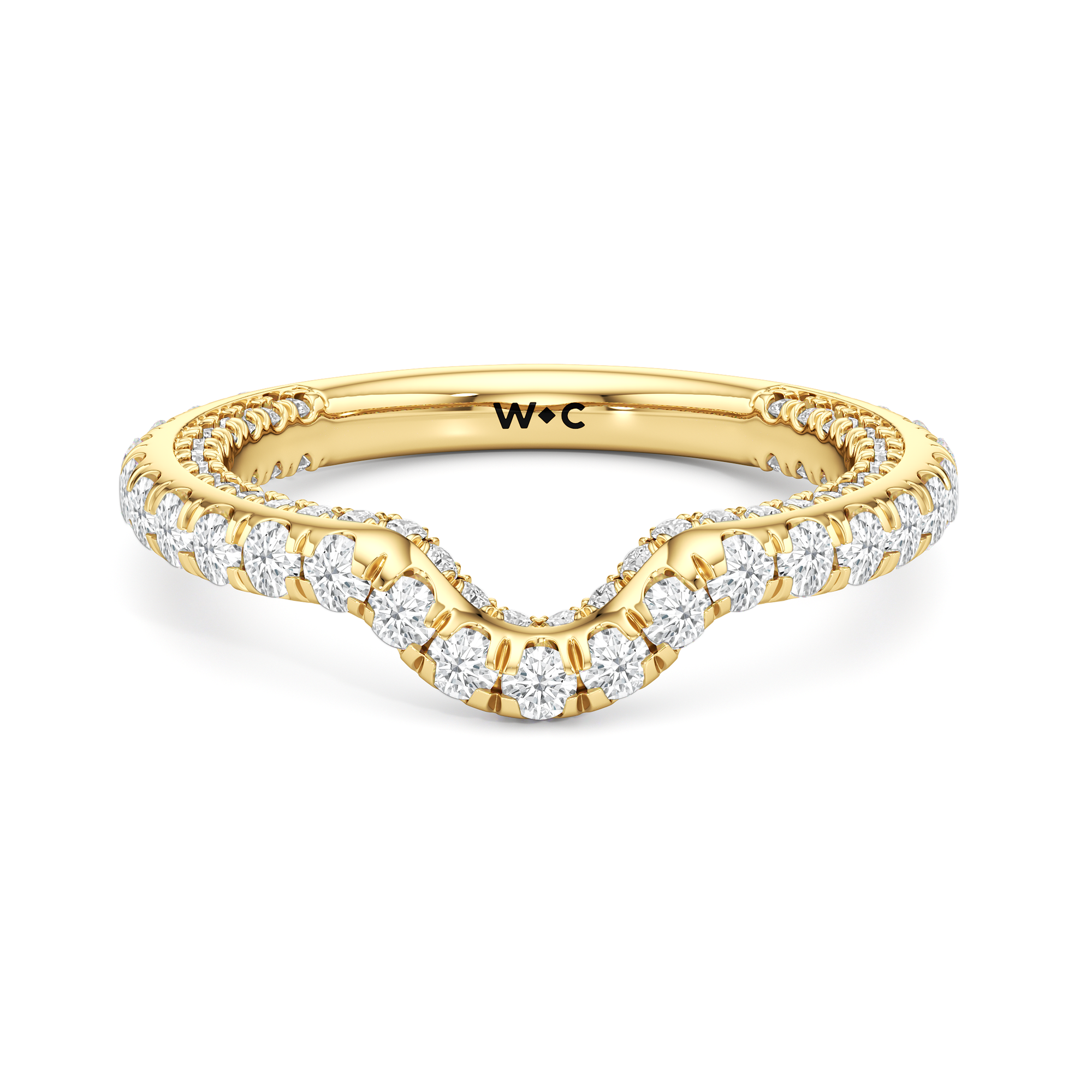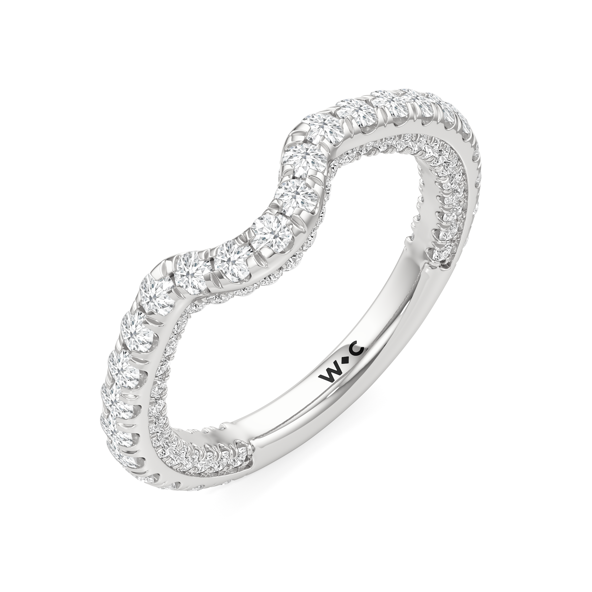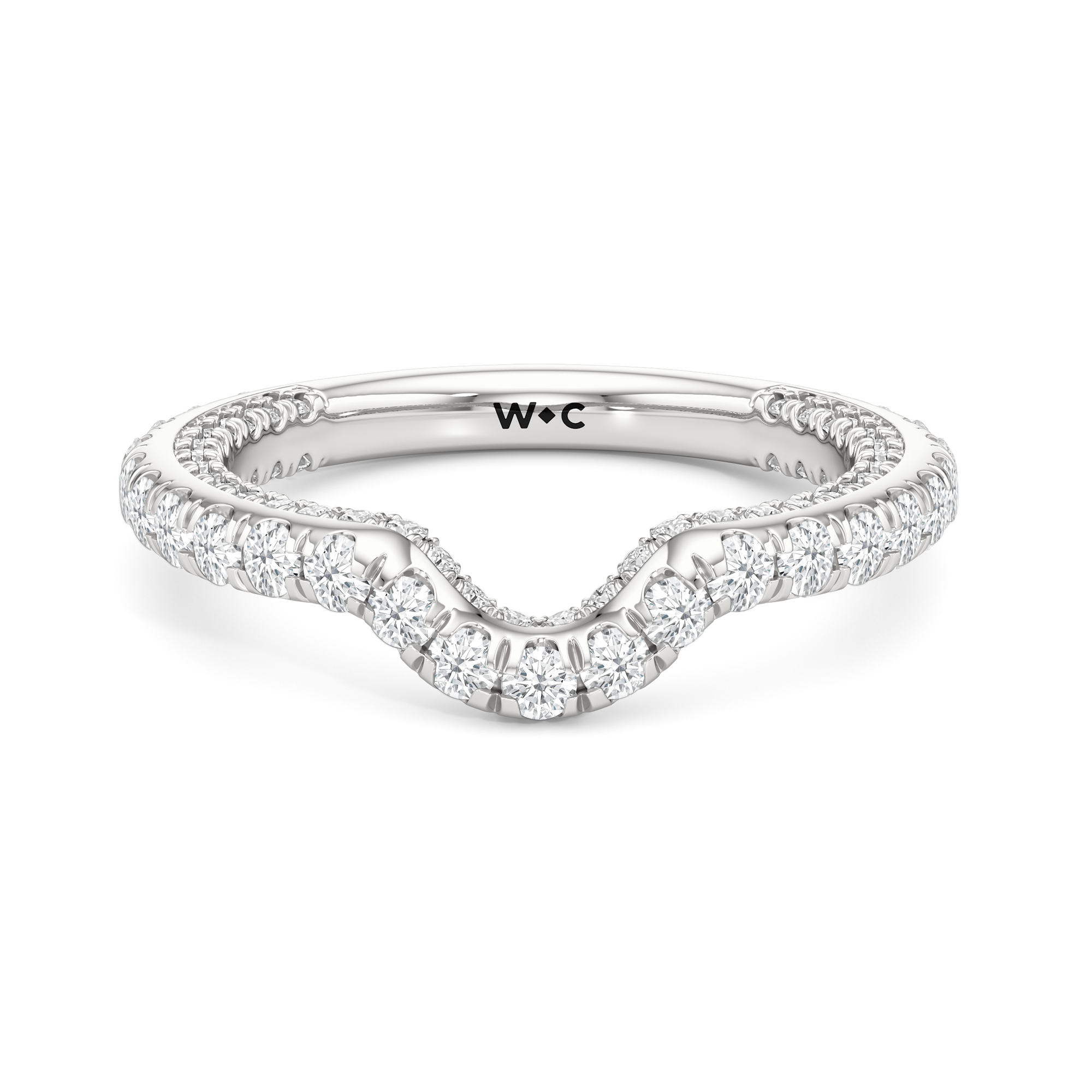 This curved diamond set wedding band is perfectly contoured to complement our the chrysler pavé ring for a simple and sophisticated look.