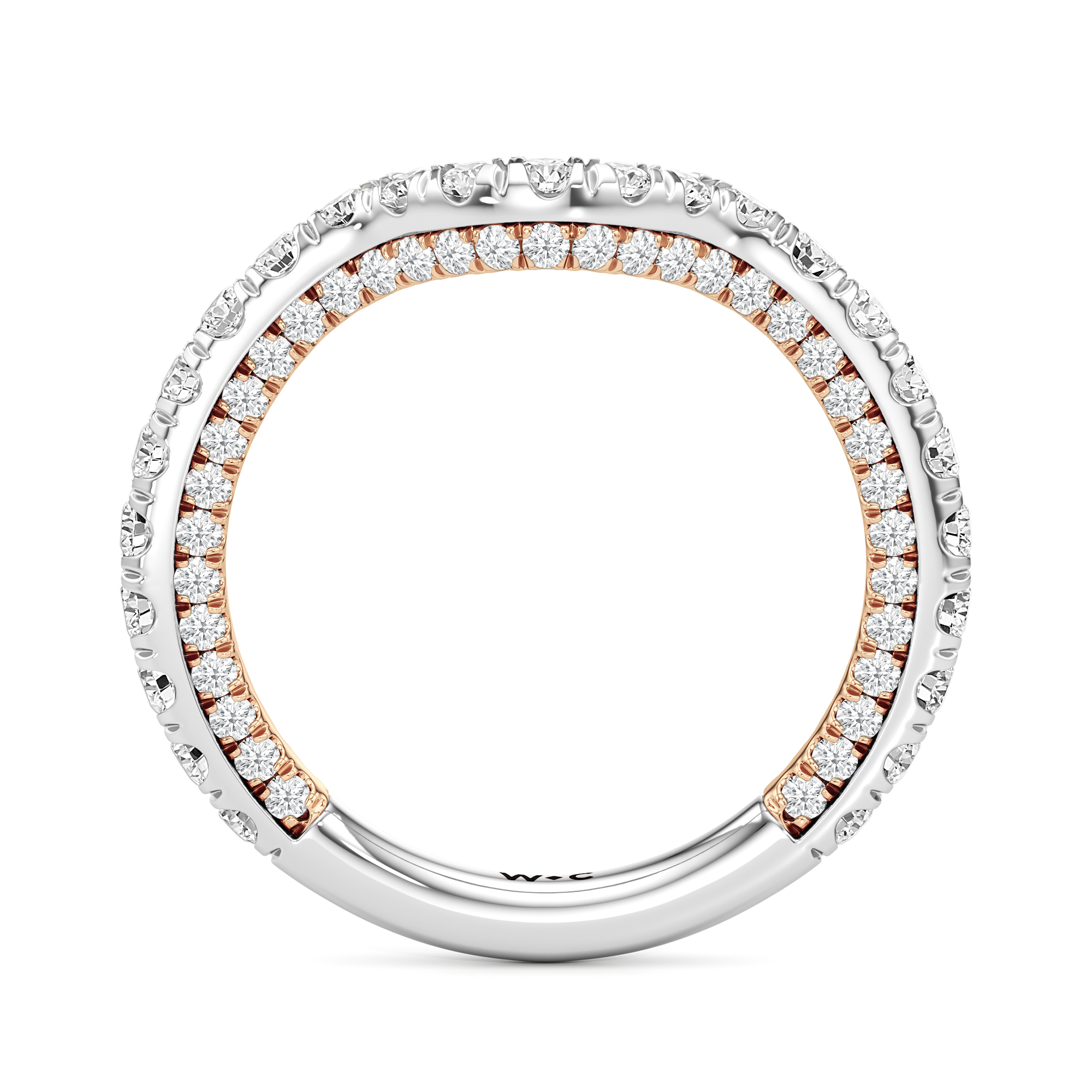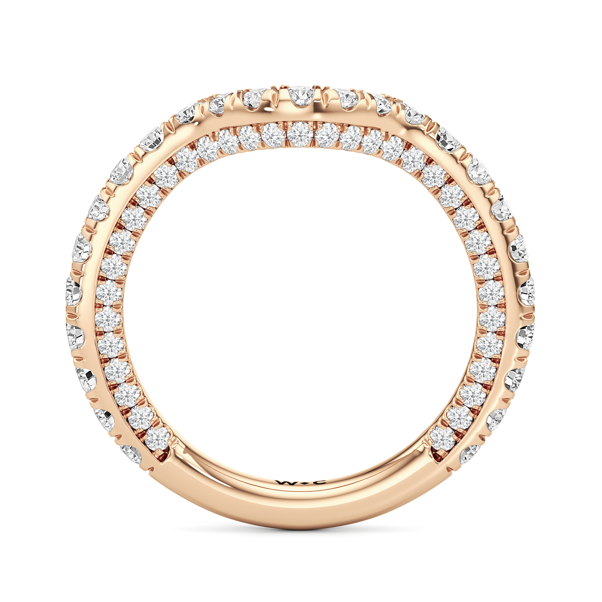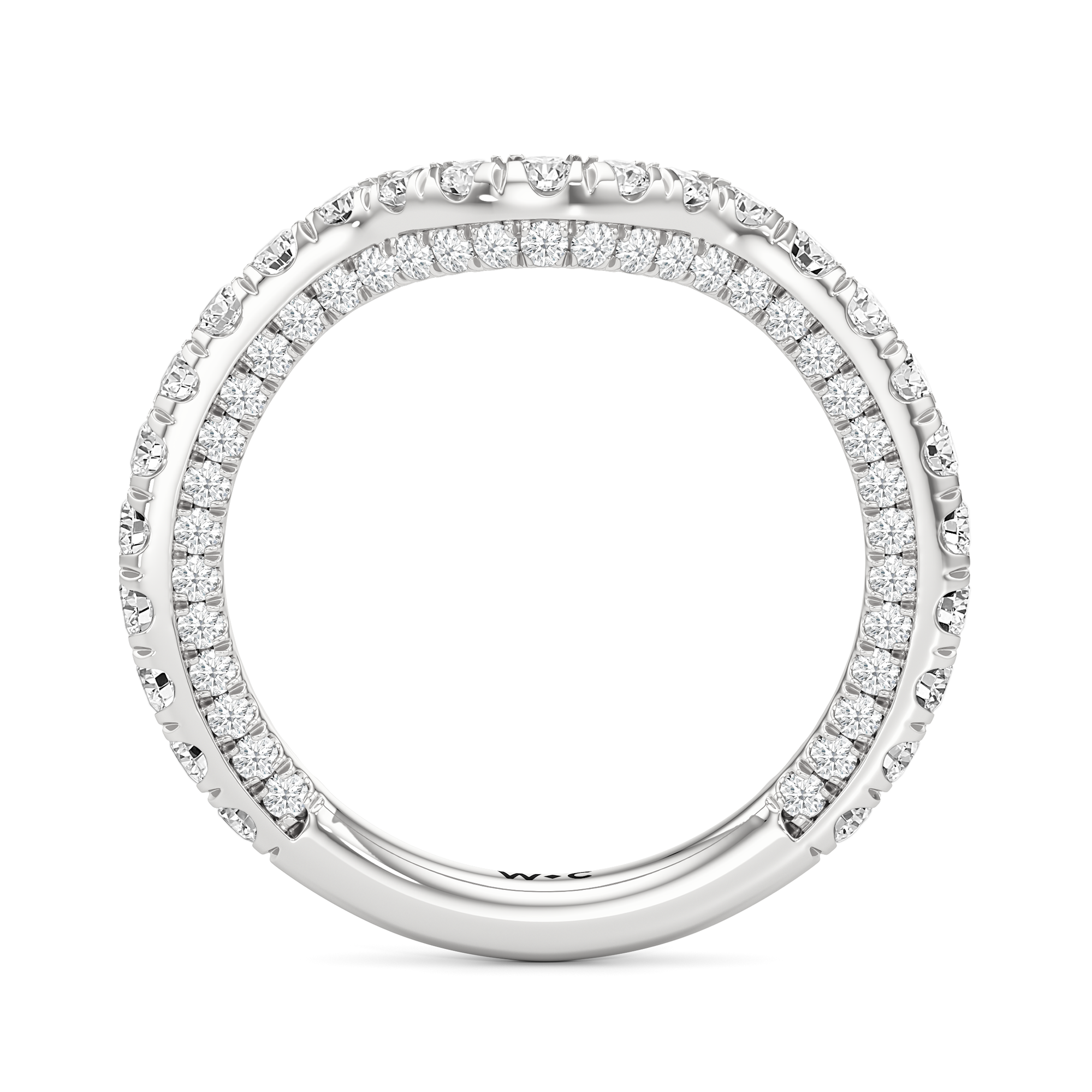This curved diamond set wedding band is perfectly contoured to complement our the chrysler pavé ring for a simple and sophisticated look.