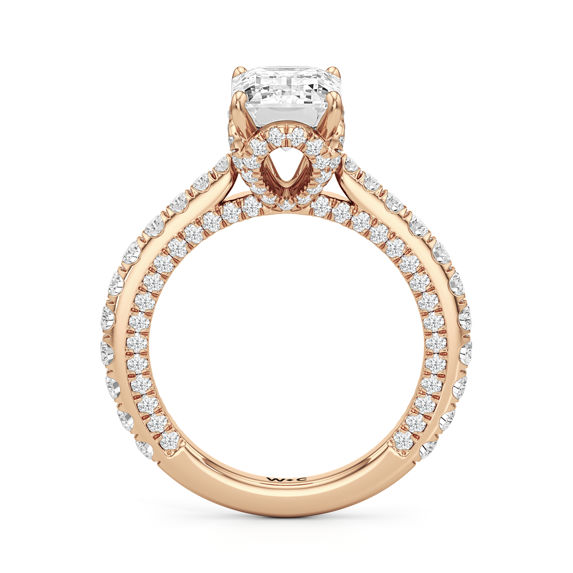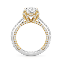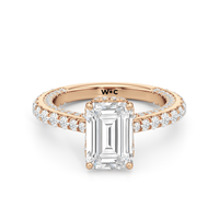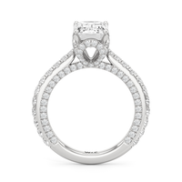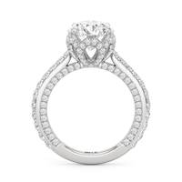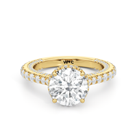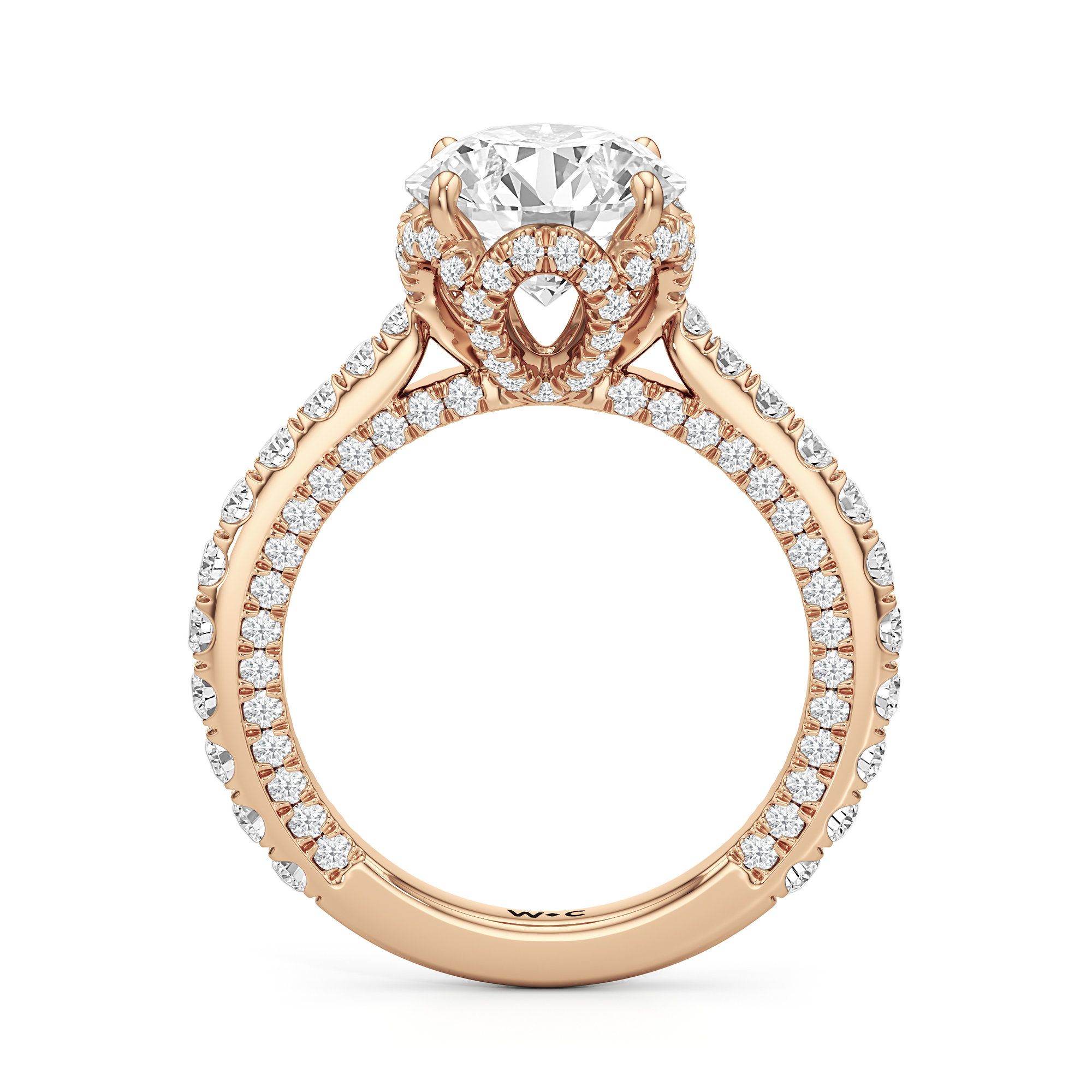 The Chrysler Pavé Ring features a center diamond set in a floral-shaped basket with subtle petal edges. The band is lined with pavé diamonds in U-shaped prongs and finished with fine milgrain detailing for added texture and refinement.