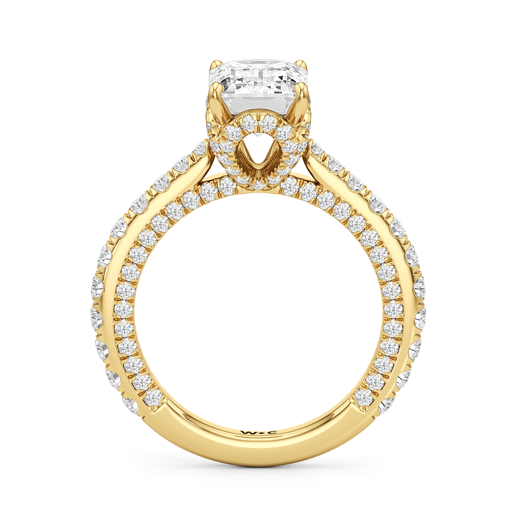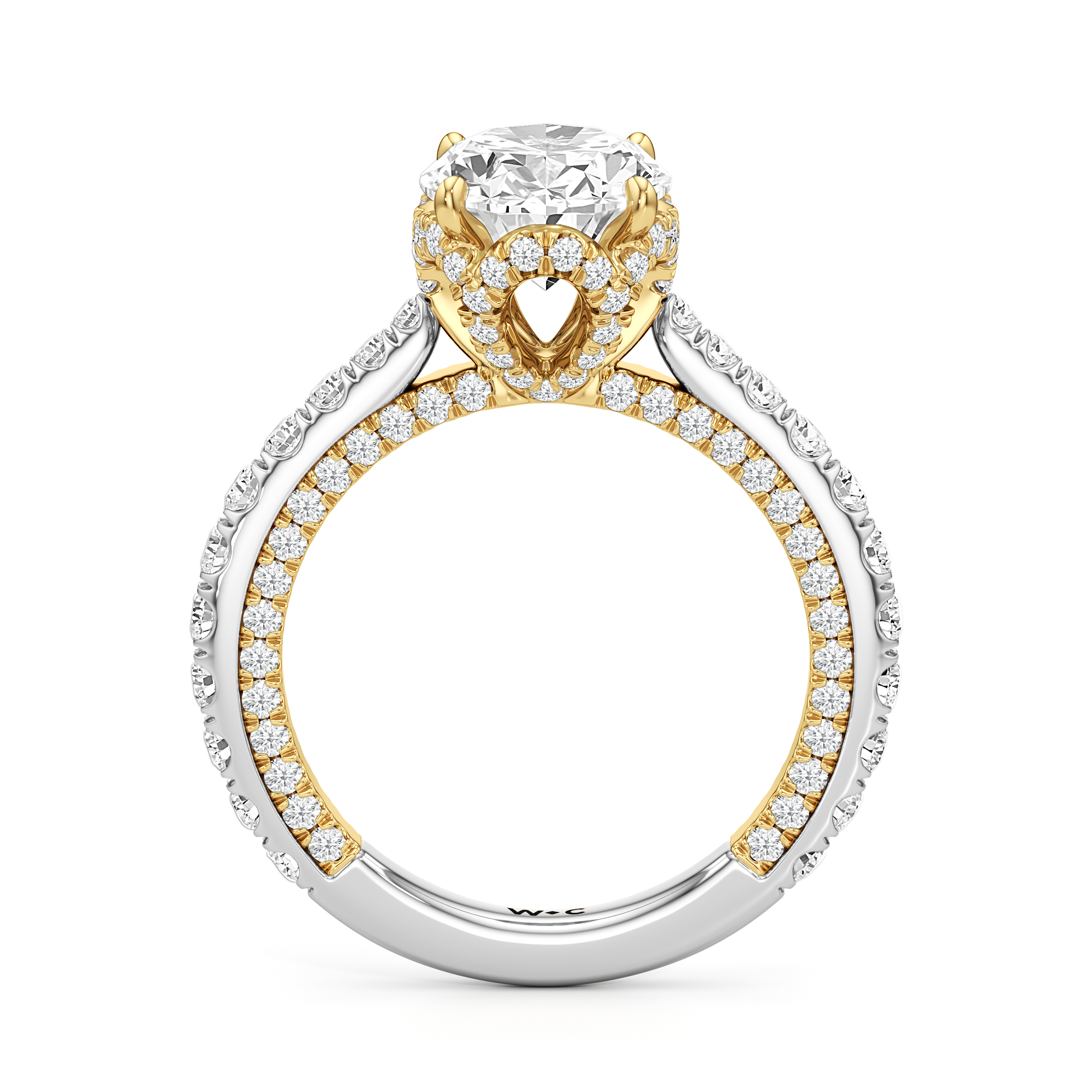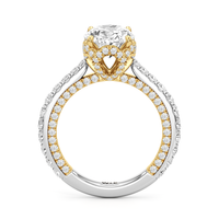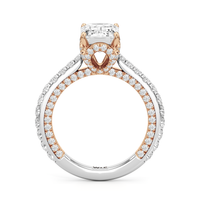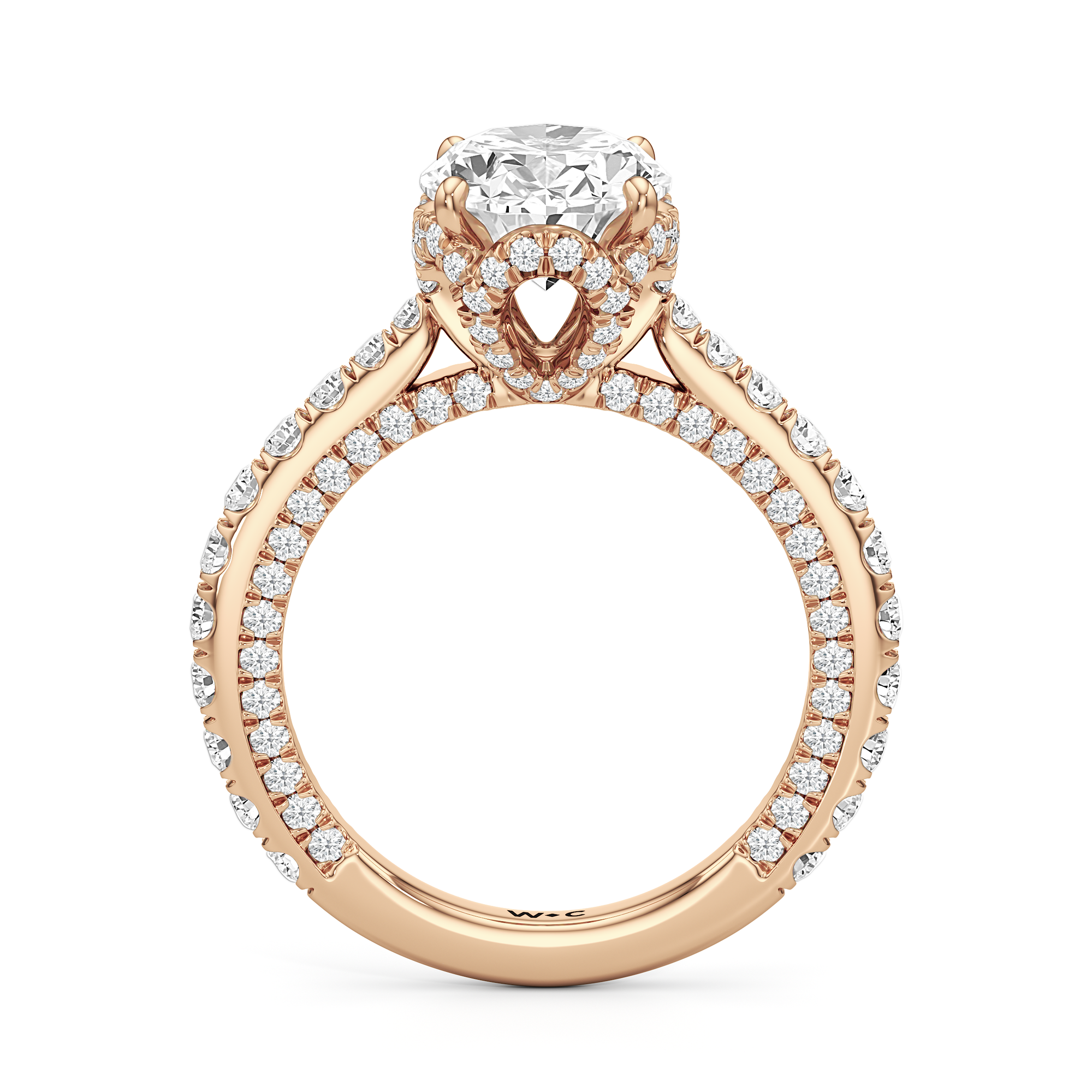 The Chrysler Pavé Ring features a center diamond set in a floral-shaped basket with subtle petal edges. The band is lined with pavé diamonds in U-shaped prongs and finished with fine milgrain detailing for added texture and refinement.