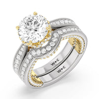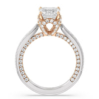This luxe engagement ring is rooted in intricate design. It features a slender cathedral shank, which is adorned with a milgrain pavé setting. Diamonds trace the arching shoulders, with additional sparkle visible from the front view. At the center, a stunning diamond is held in a 4-prong flower-shaped basket lined with more diamonds, while the brilliance continues along the bridge and sides of the band. The two-toned finish lends a modern heirloom vibe, making this a breathtaking choice for those seeking milgrain diamond engagement rings with timeless elegance.