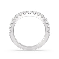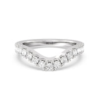 This curved diamond set wedding band is perfectly contoured to complement our the cloister ring for a simple and sophisticated look.