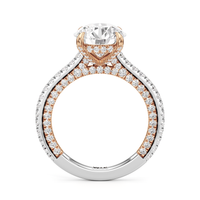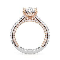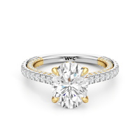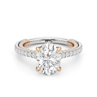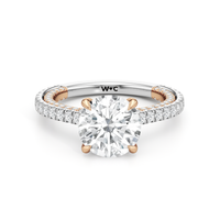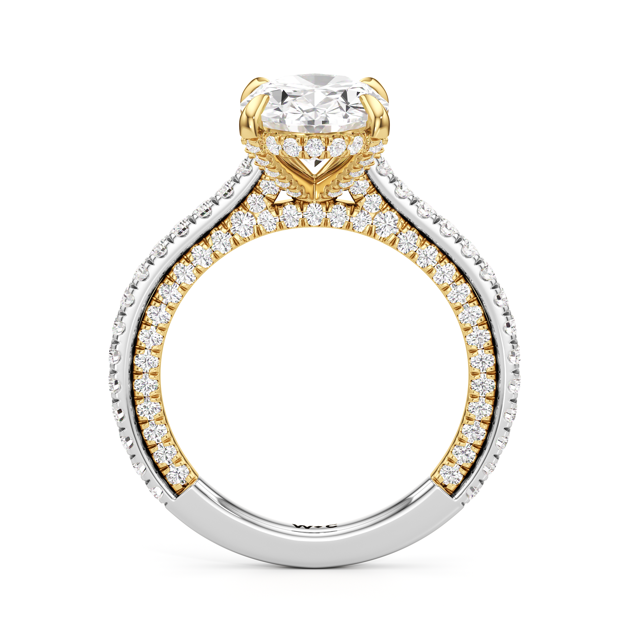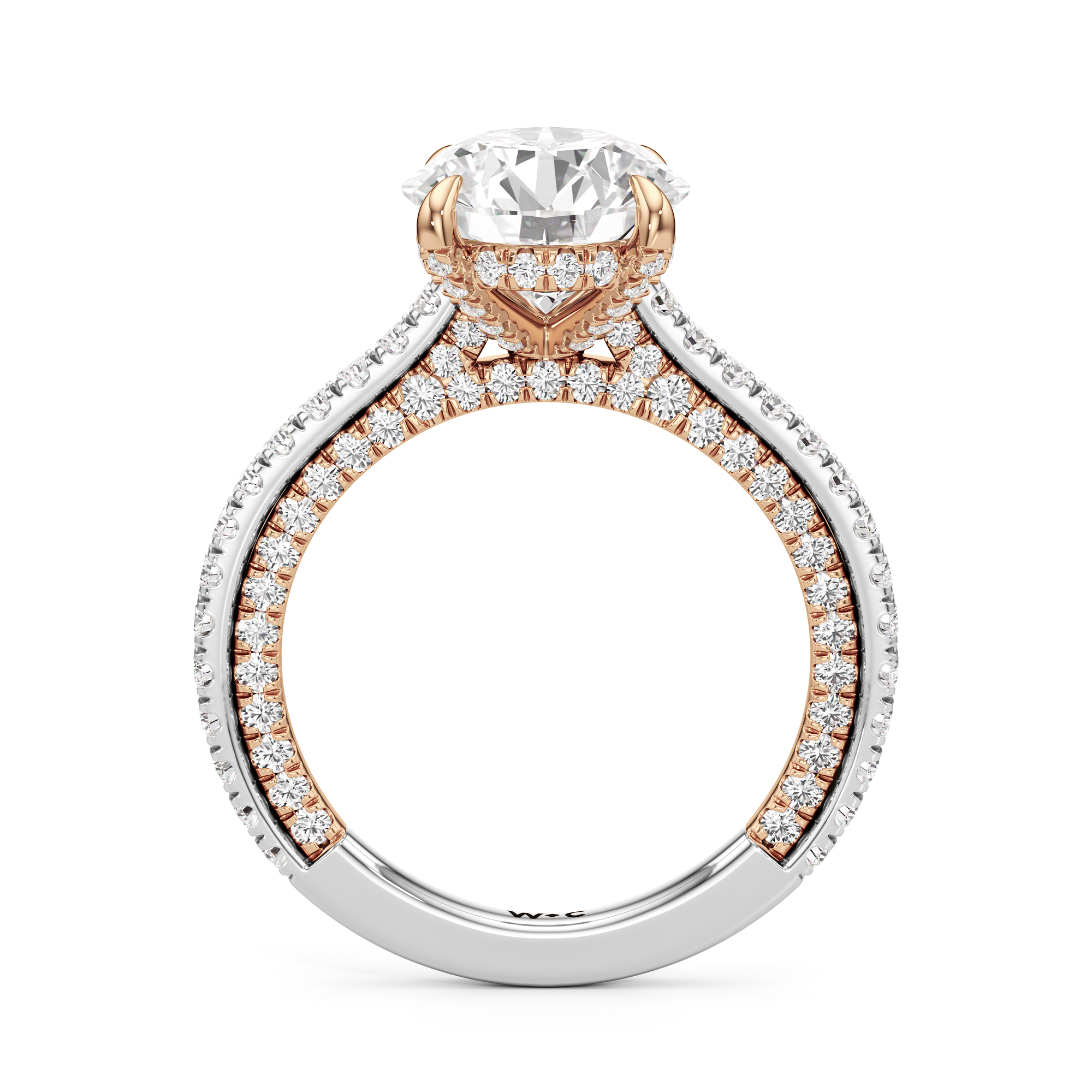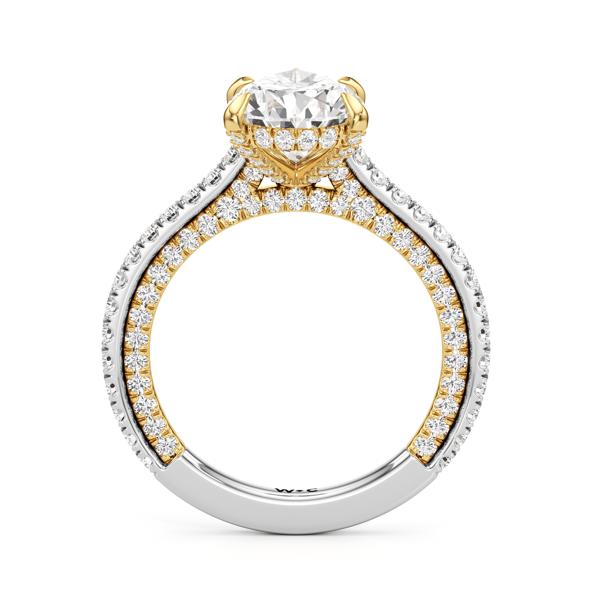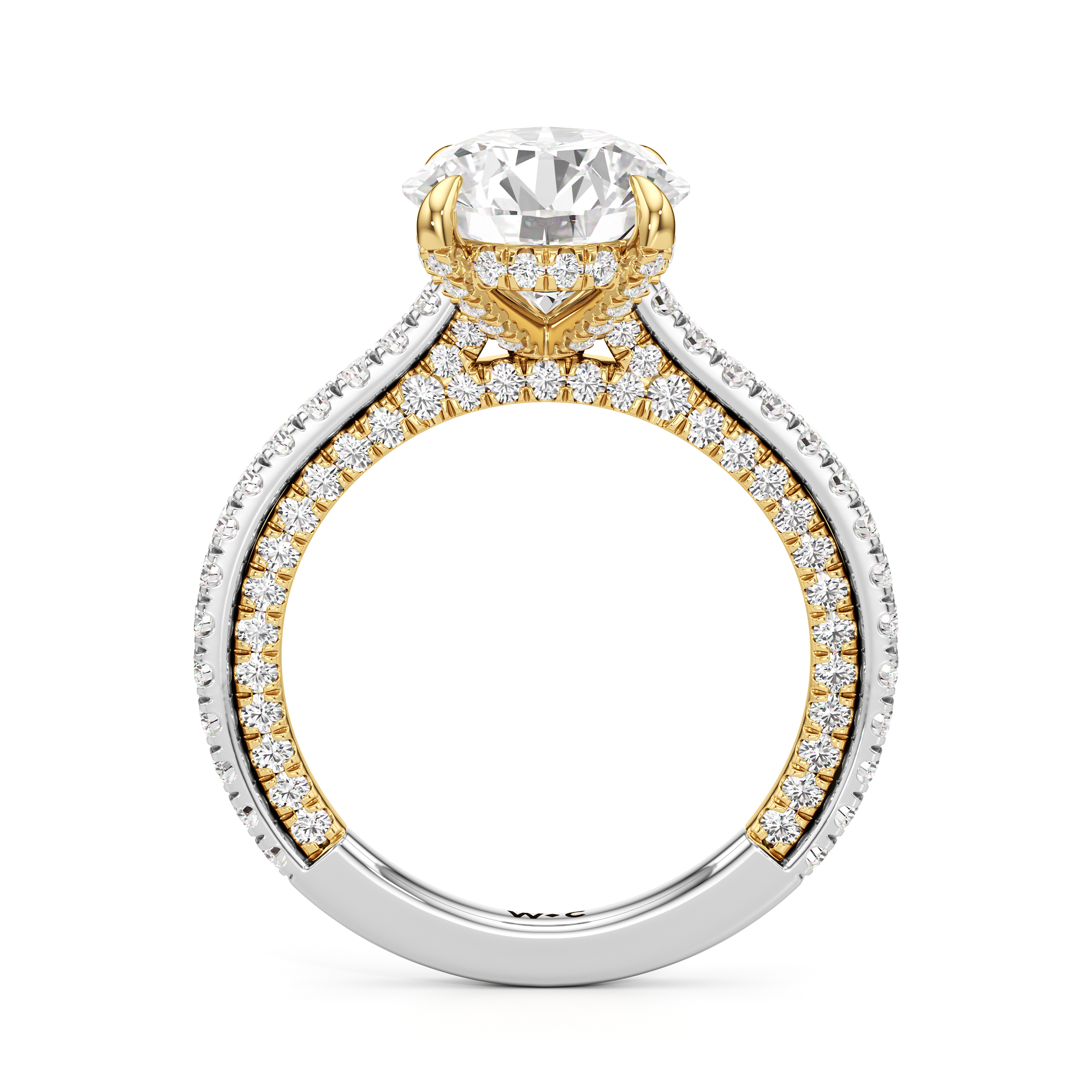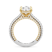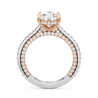 This refined two-tone engagement ring features a fully diamond-studded shank that flows into a pavé-adorned basket, highlighting the center stone with brilliance from every angle. Diamonds extend along the front and sides of the setting, creating a seamless, luminous profile with elegant contrast and timeless appeal.