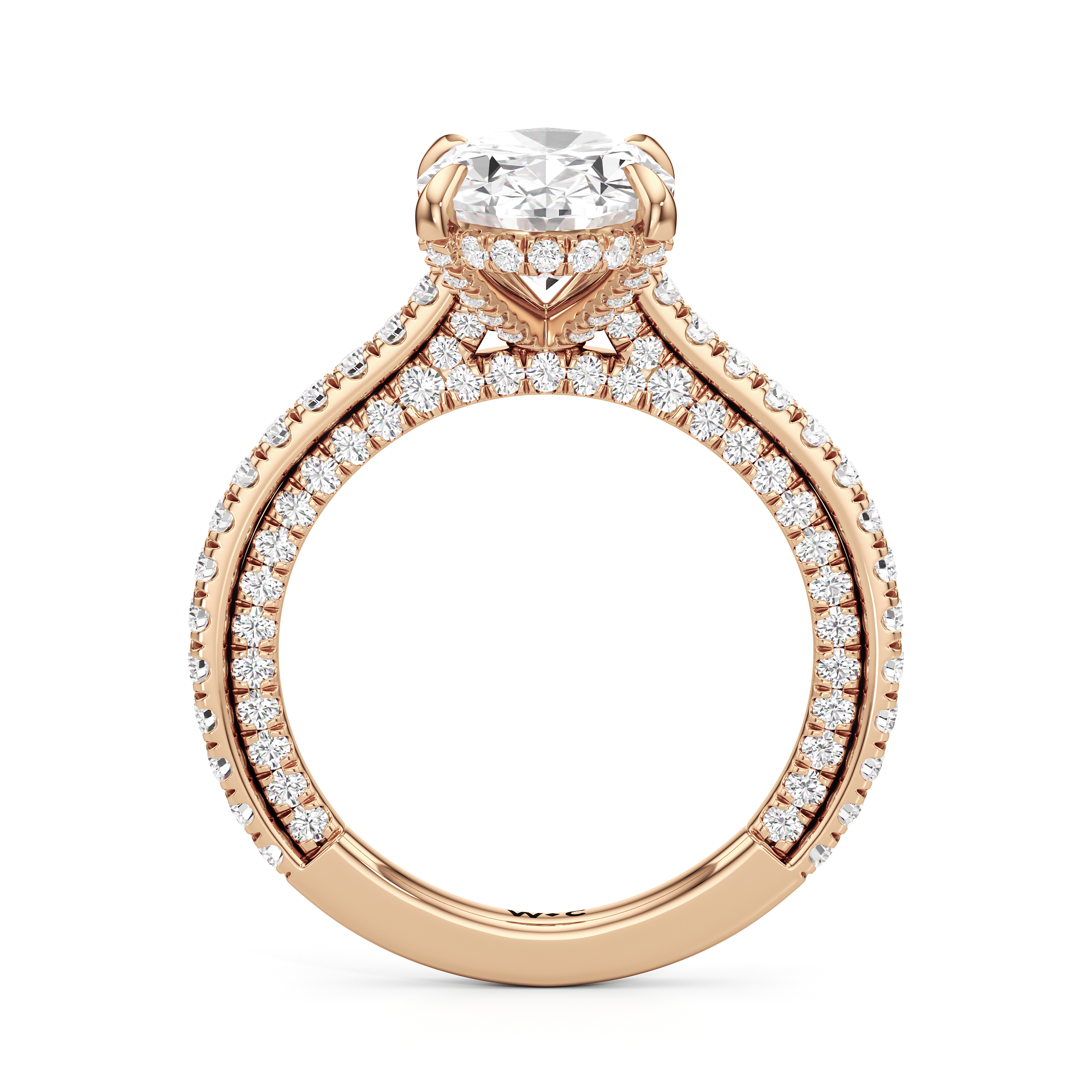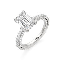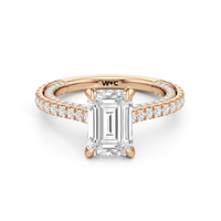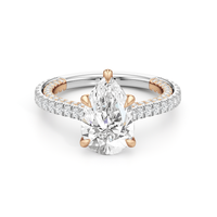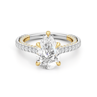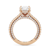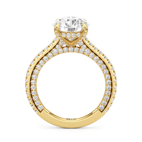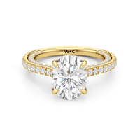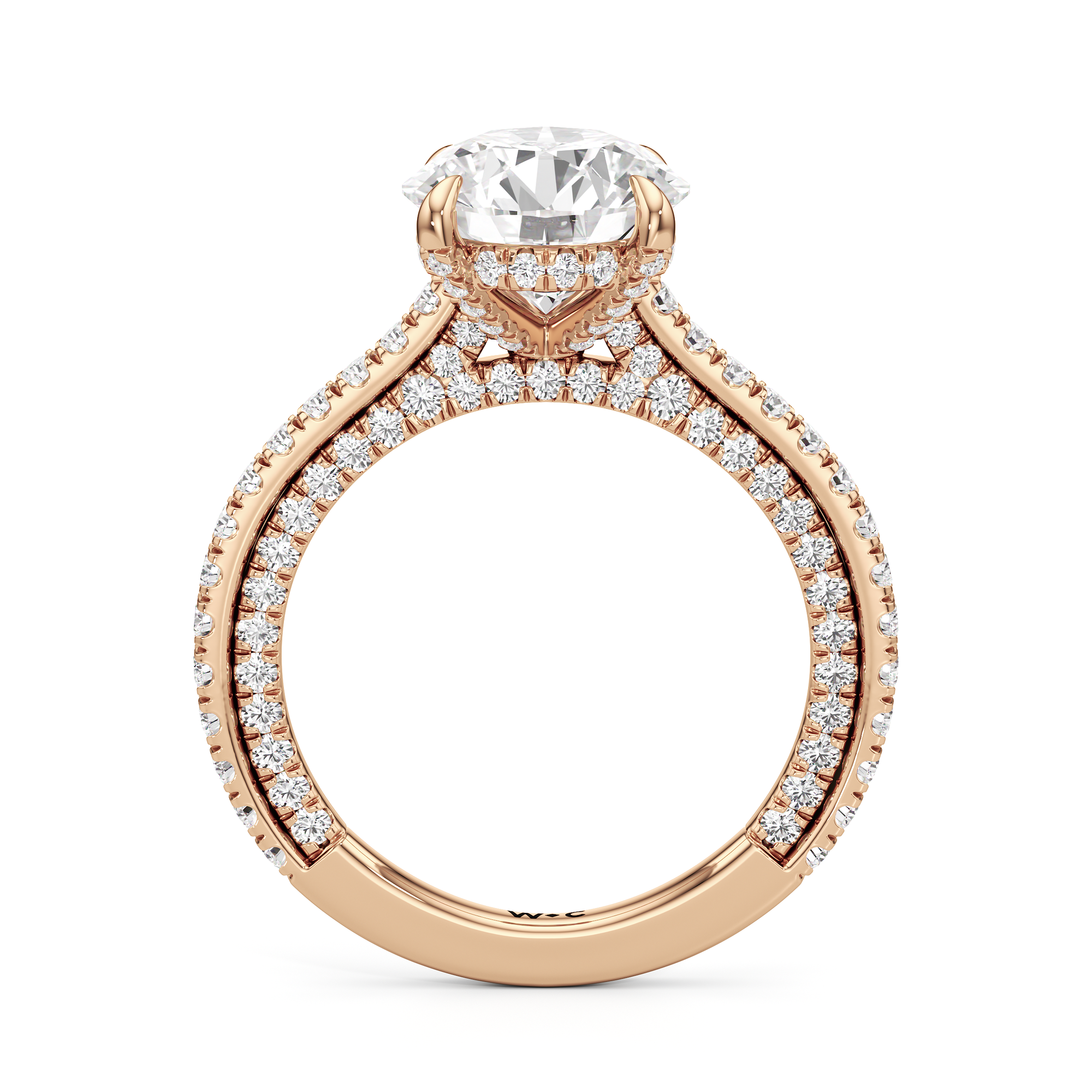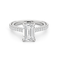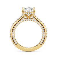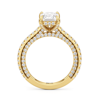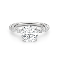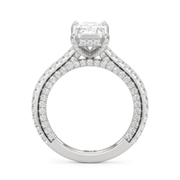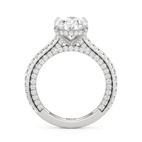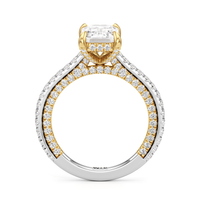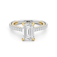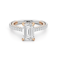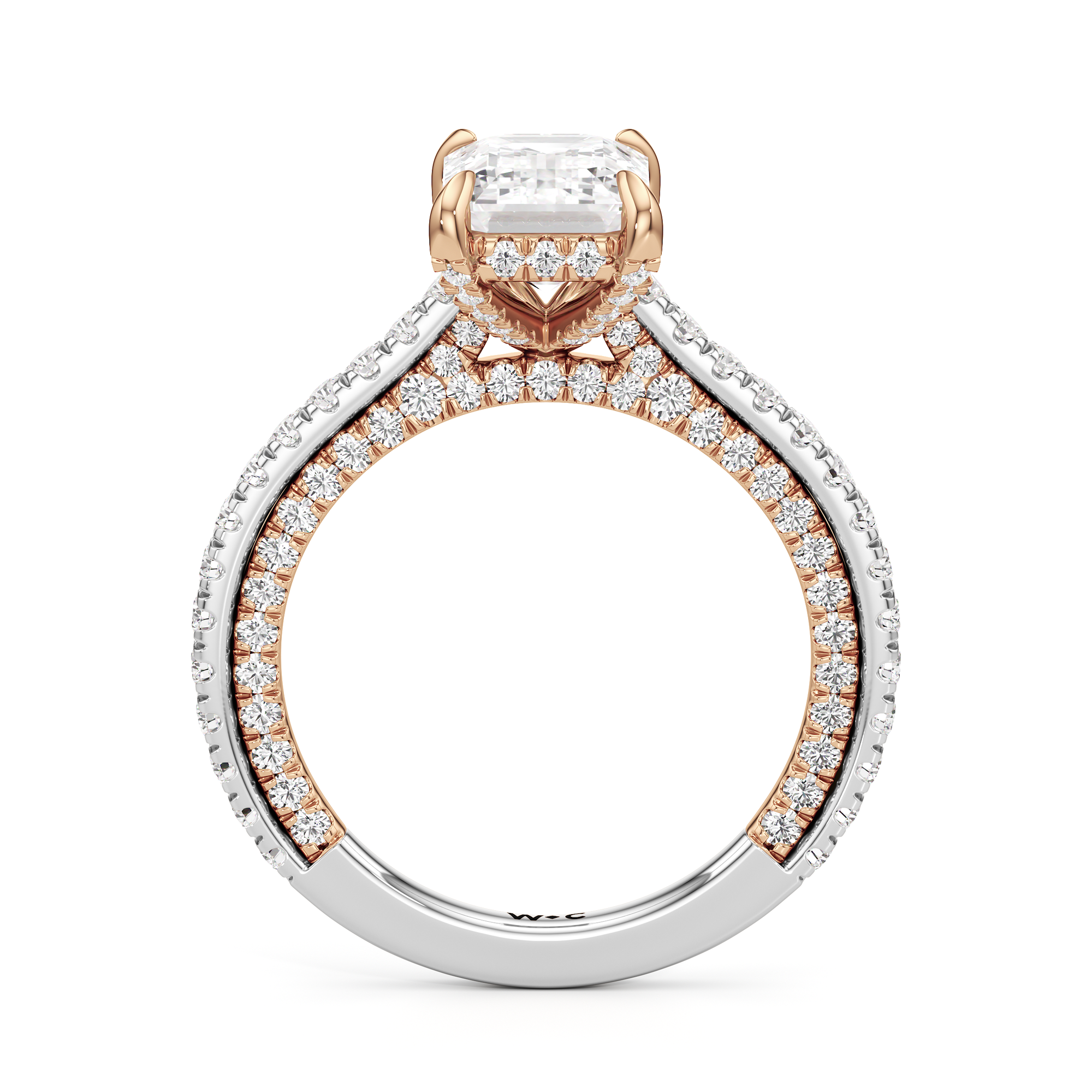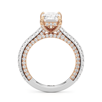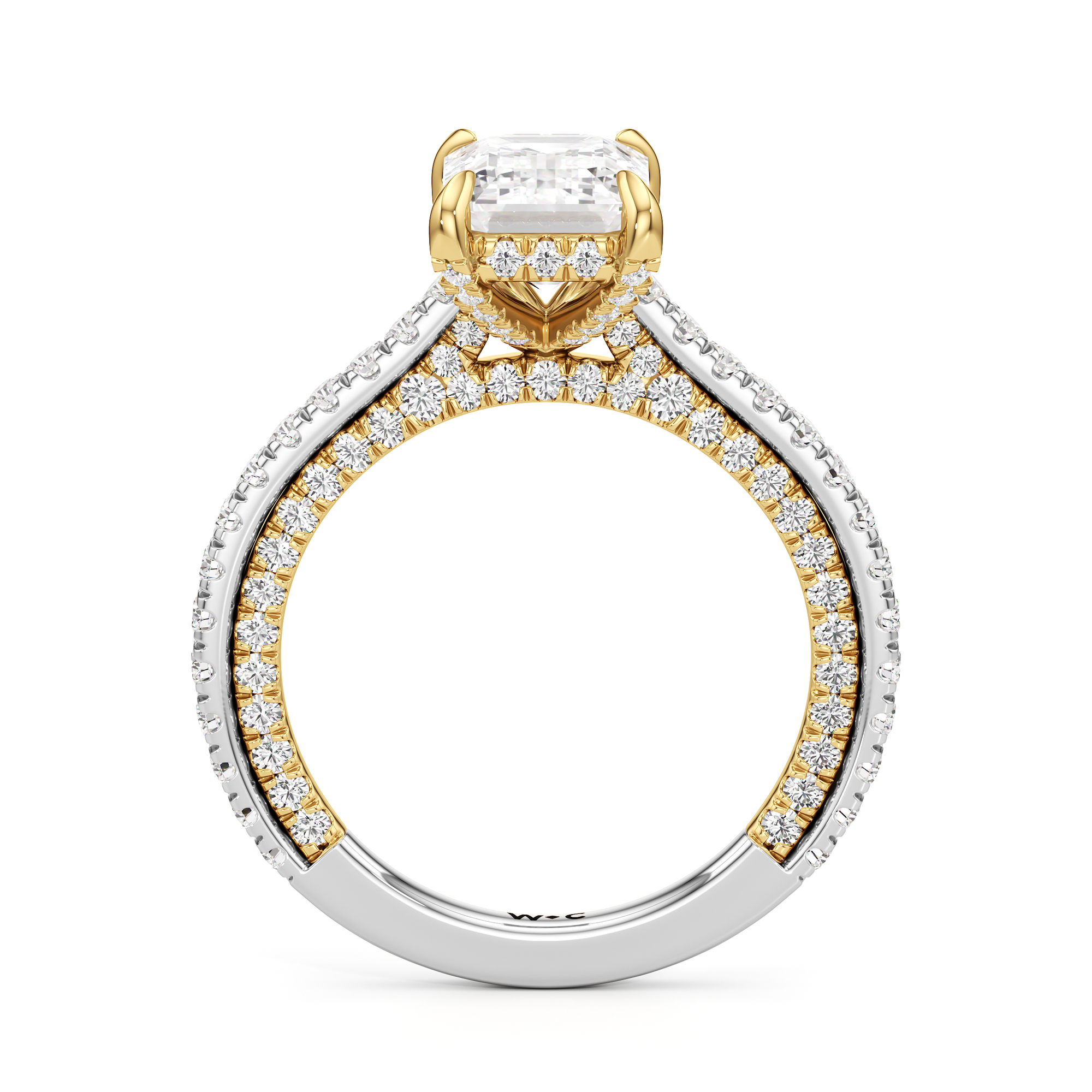 This refined two-tone engagement ring features a fully diamond-studded shank that flows into a pavé-adorned basket, highlighting the center stone with brilliance from every angle. Diamonds extend along the front and sides of the setting, creating a seamless, luminous profile with elegant contrast and timeless appeal.