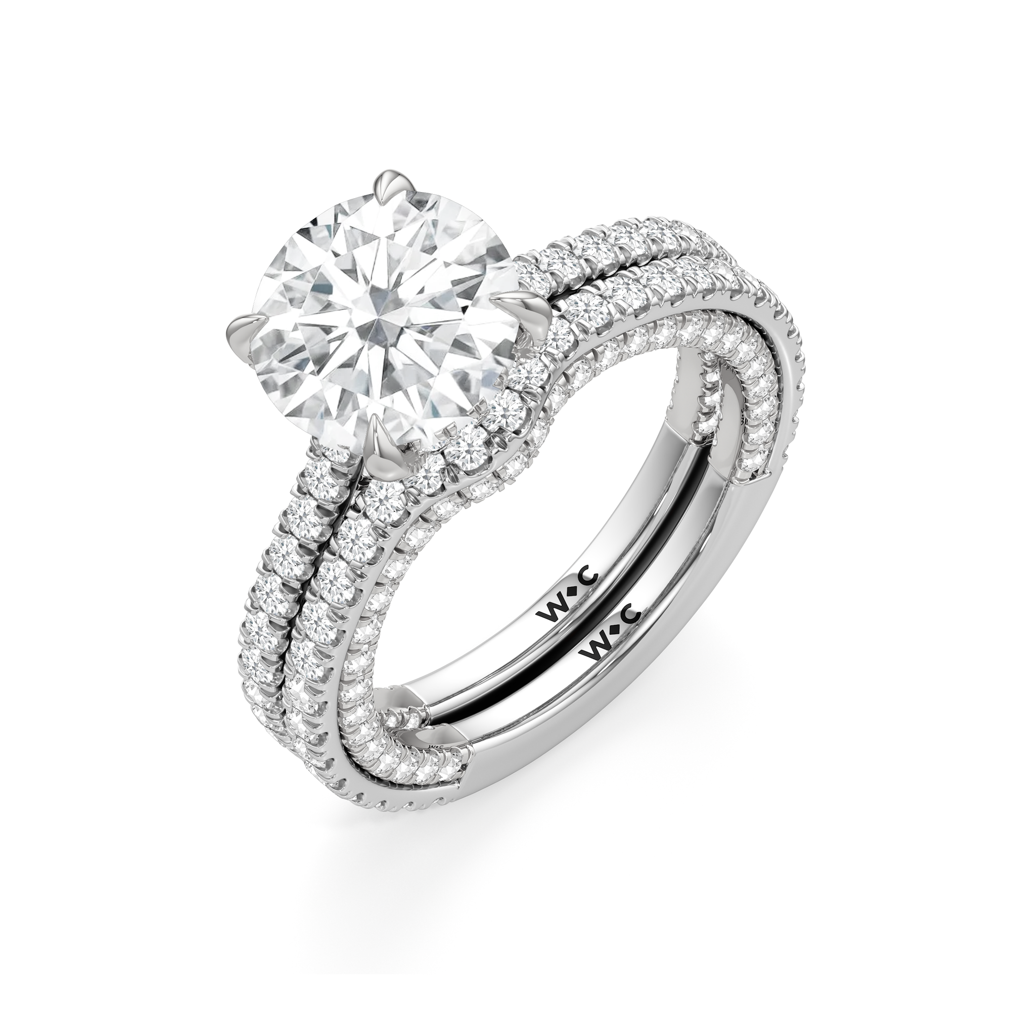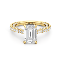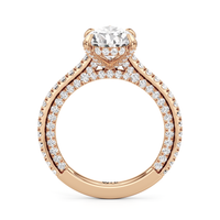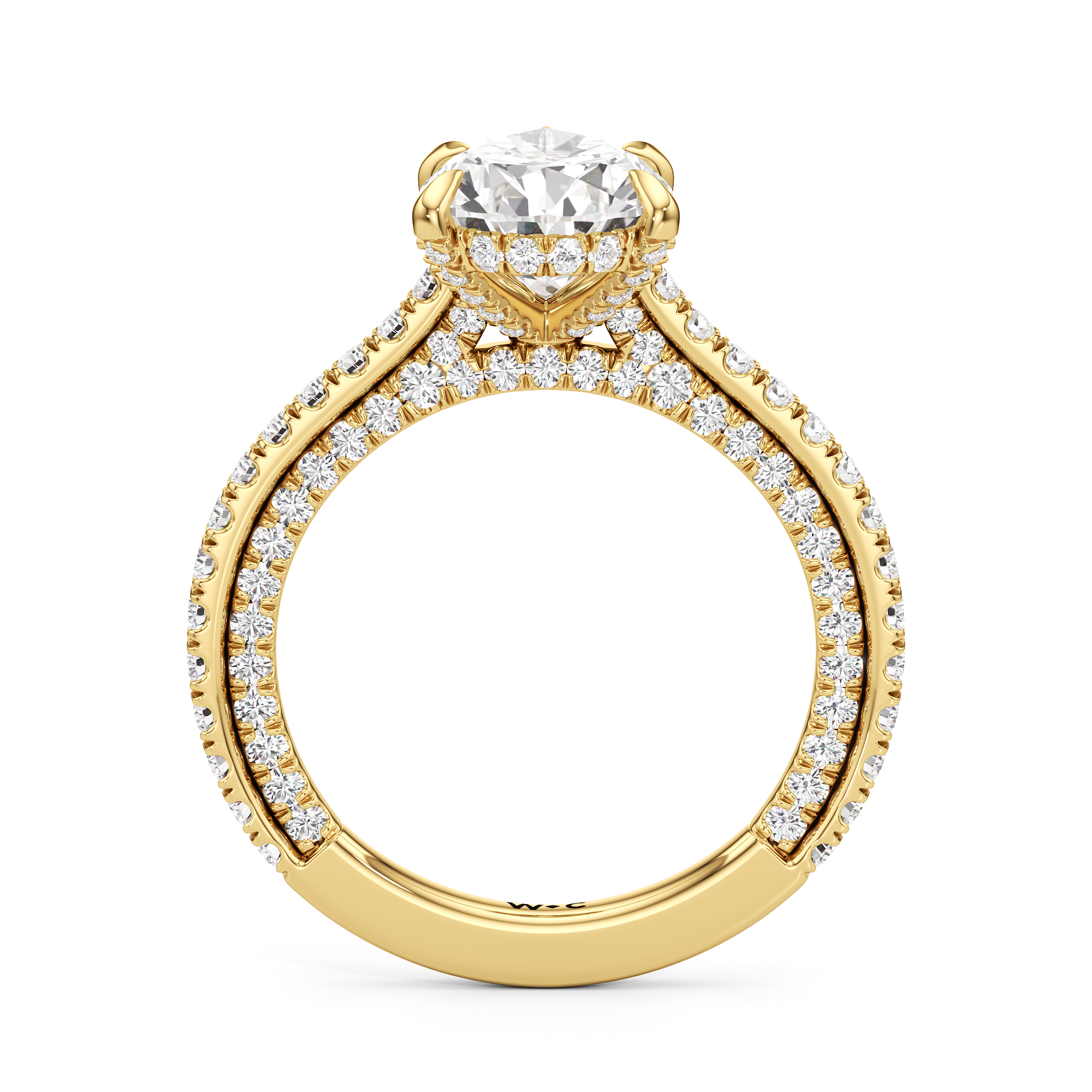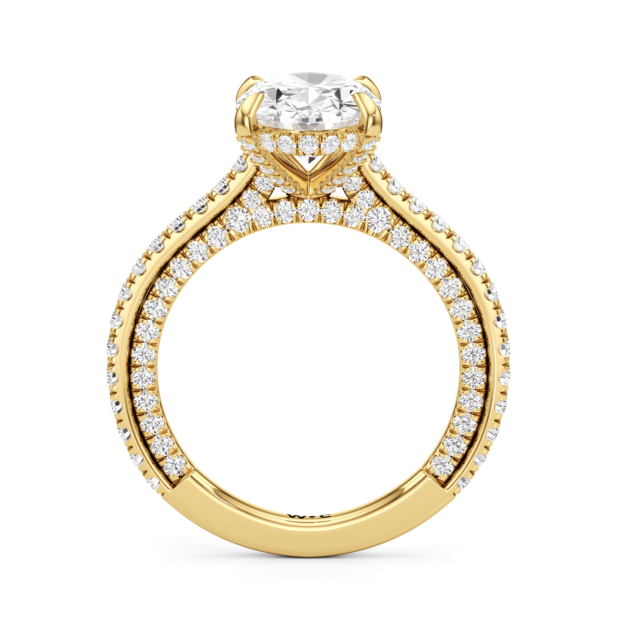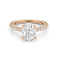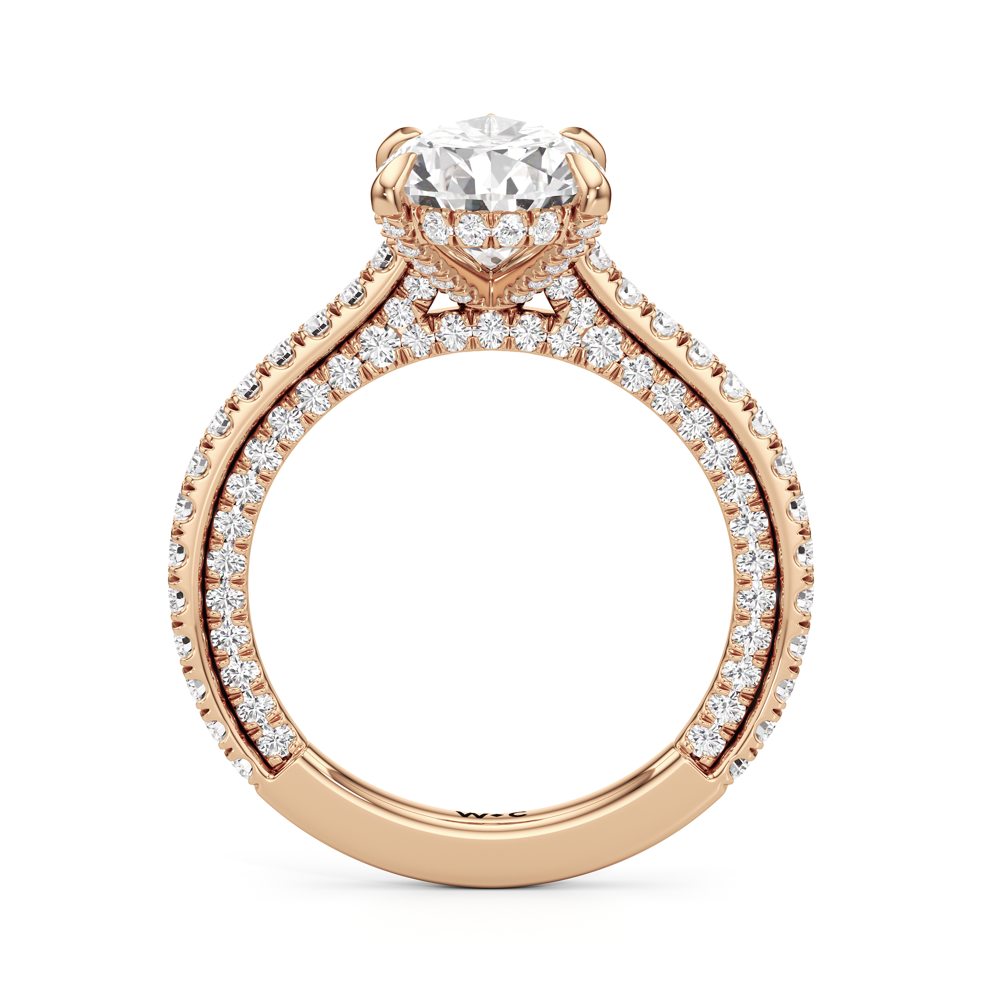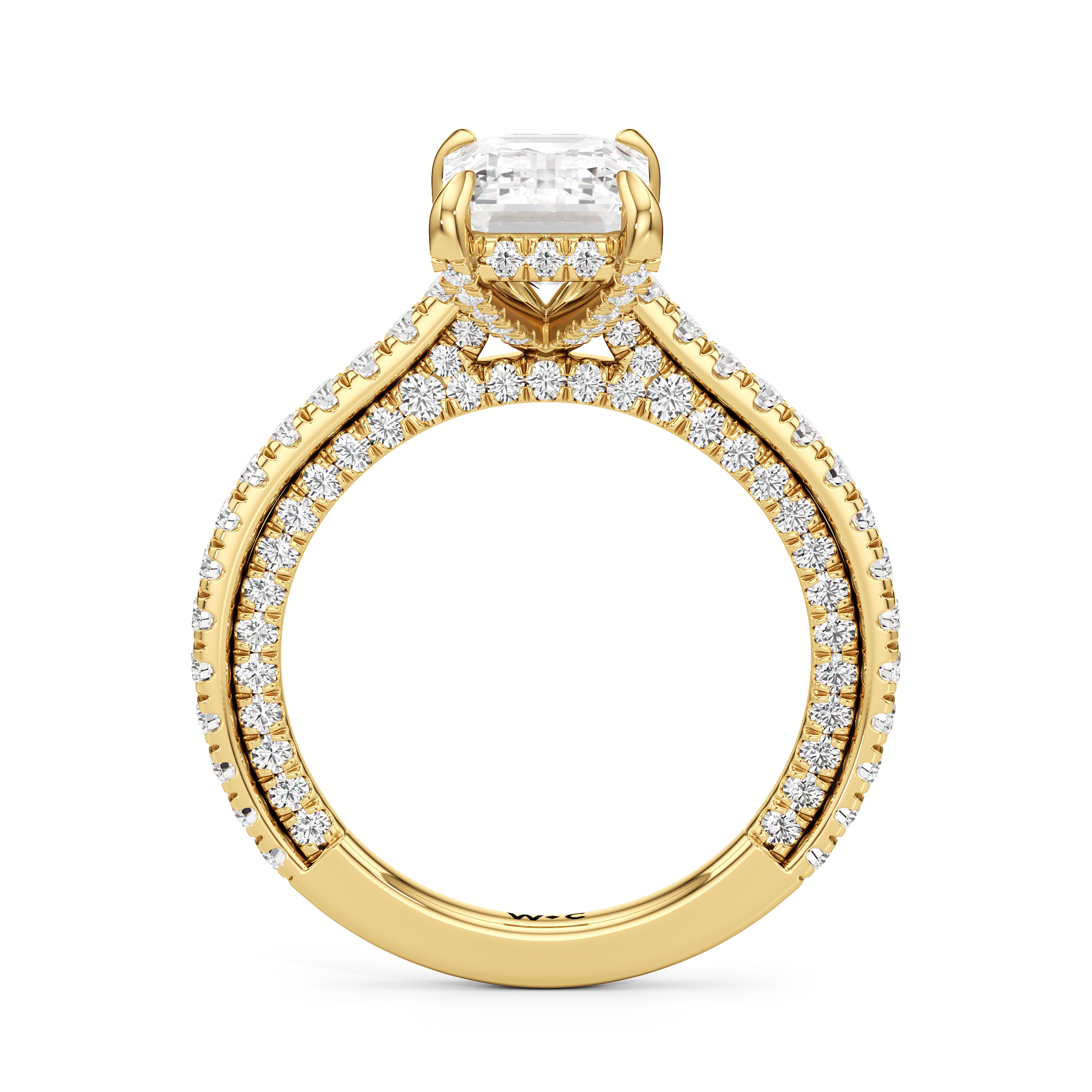 This refined two-tone engagement ring features a fully diamond-studded shank that flows into a pavé-adorned basket, highlighting the center stone with brilliance from every angle. Diamonds extend along the front and sides of the setting, creating a seamless, luminous profile with elegant contrast and timeless appeal.
