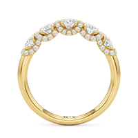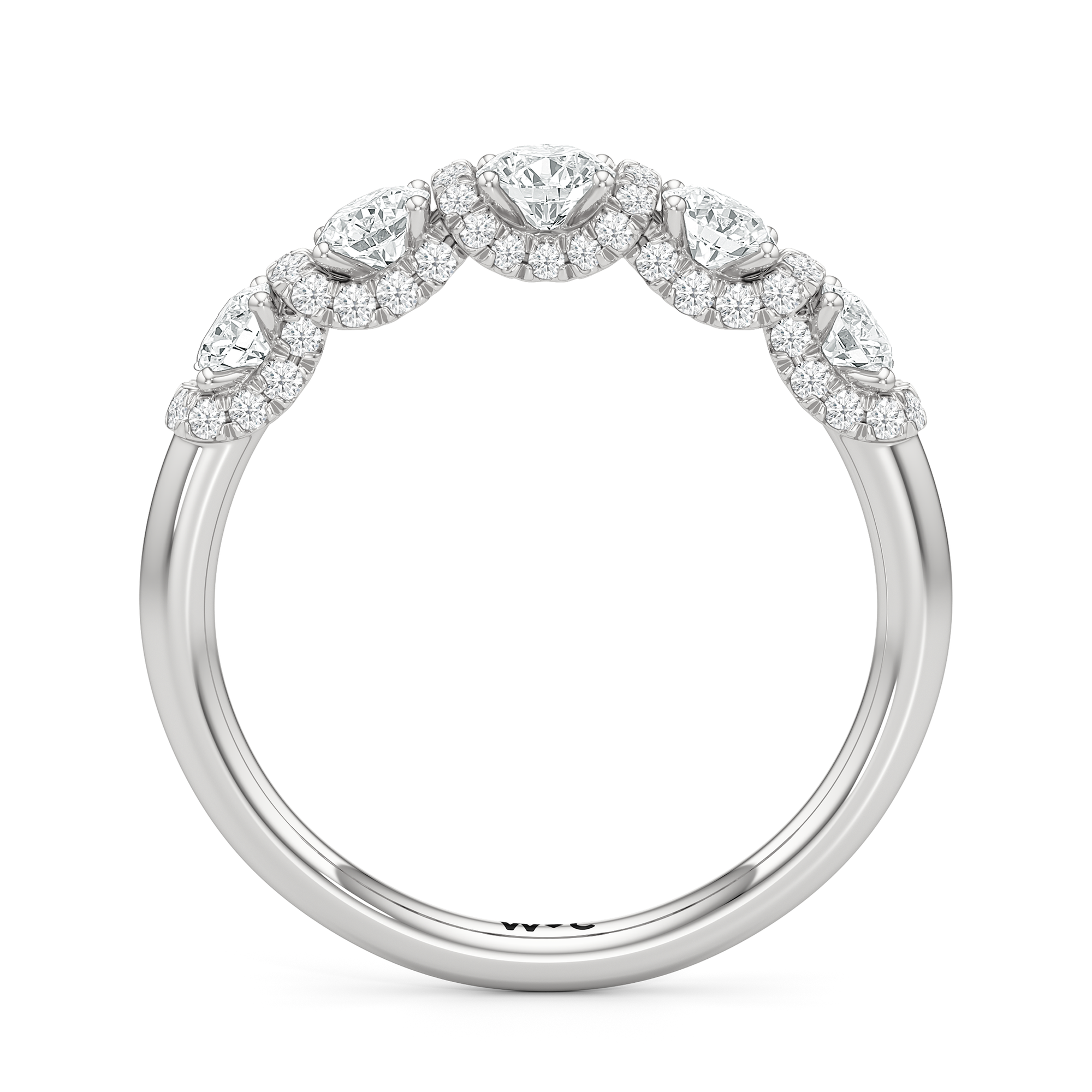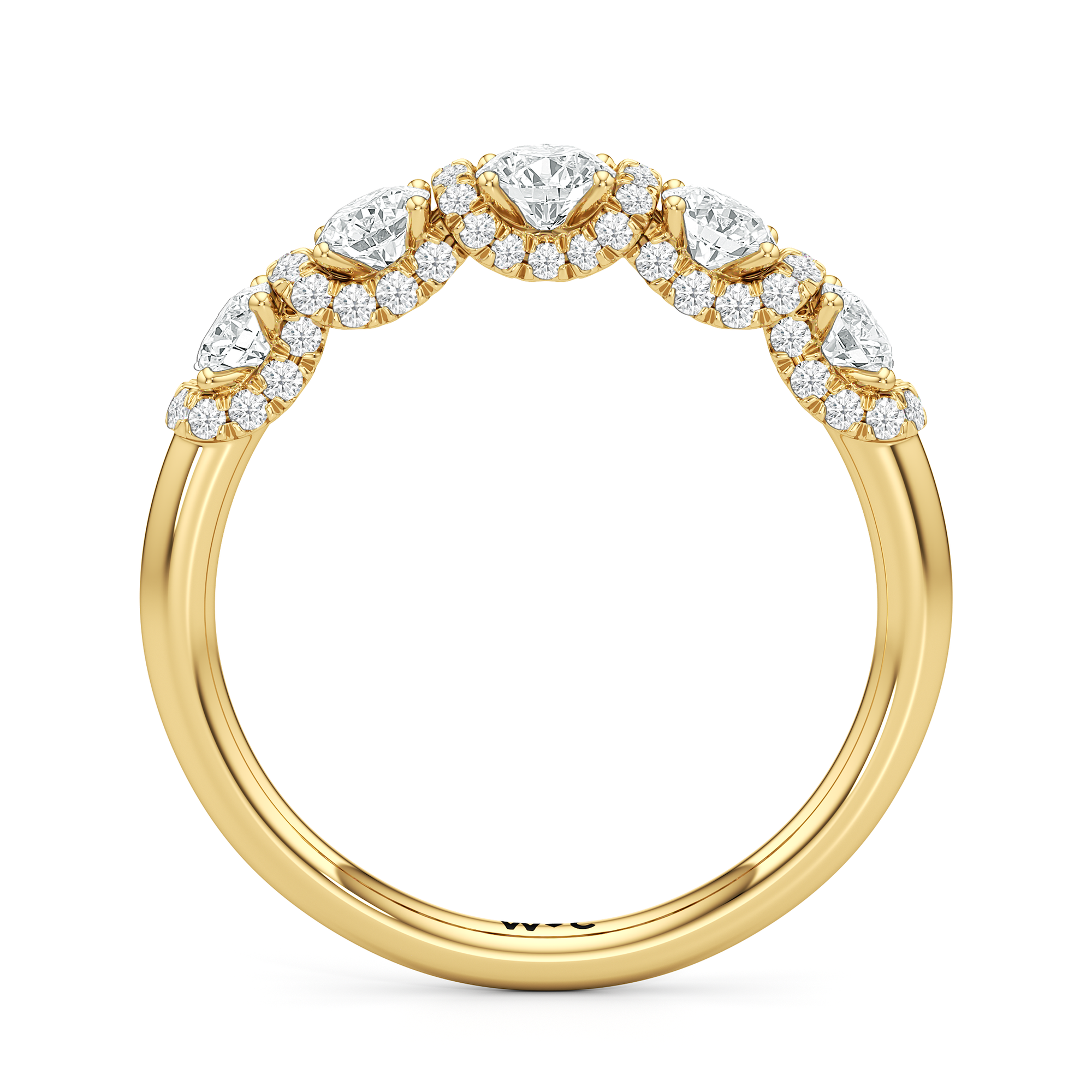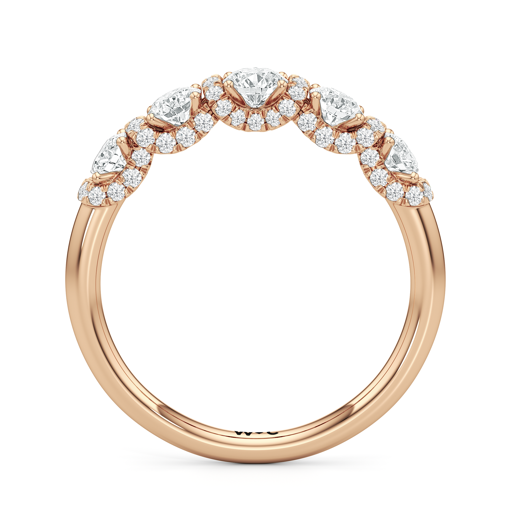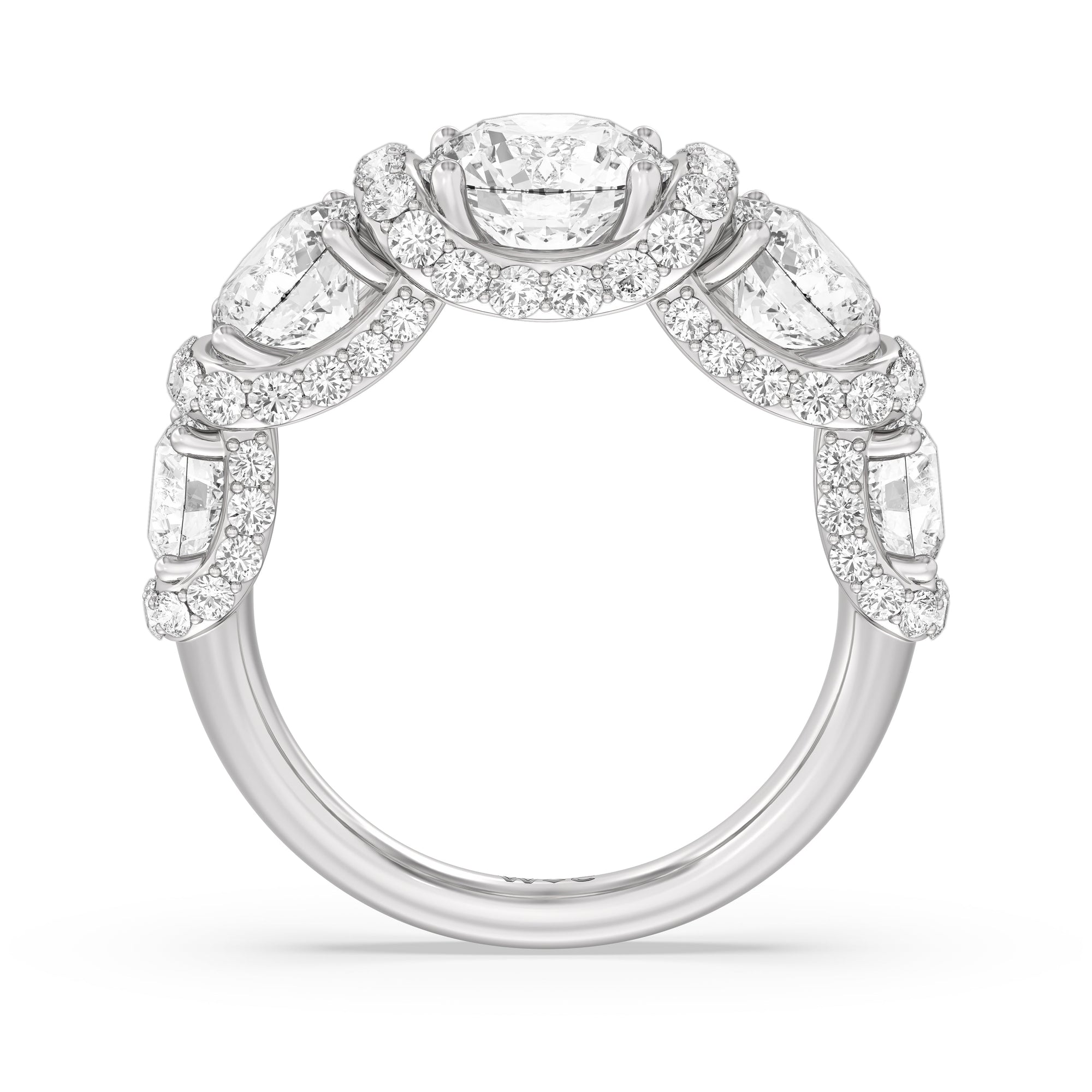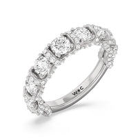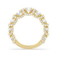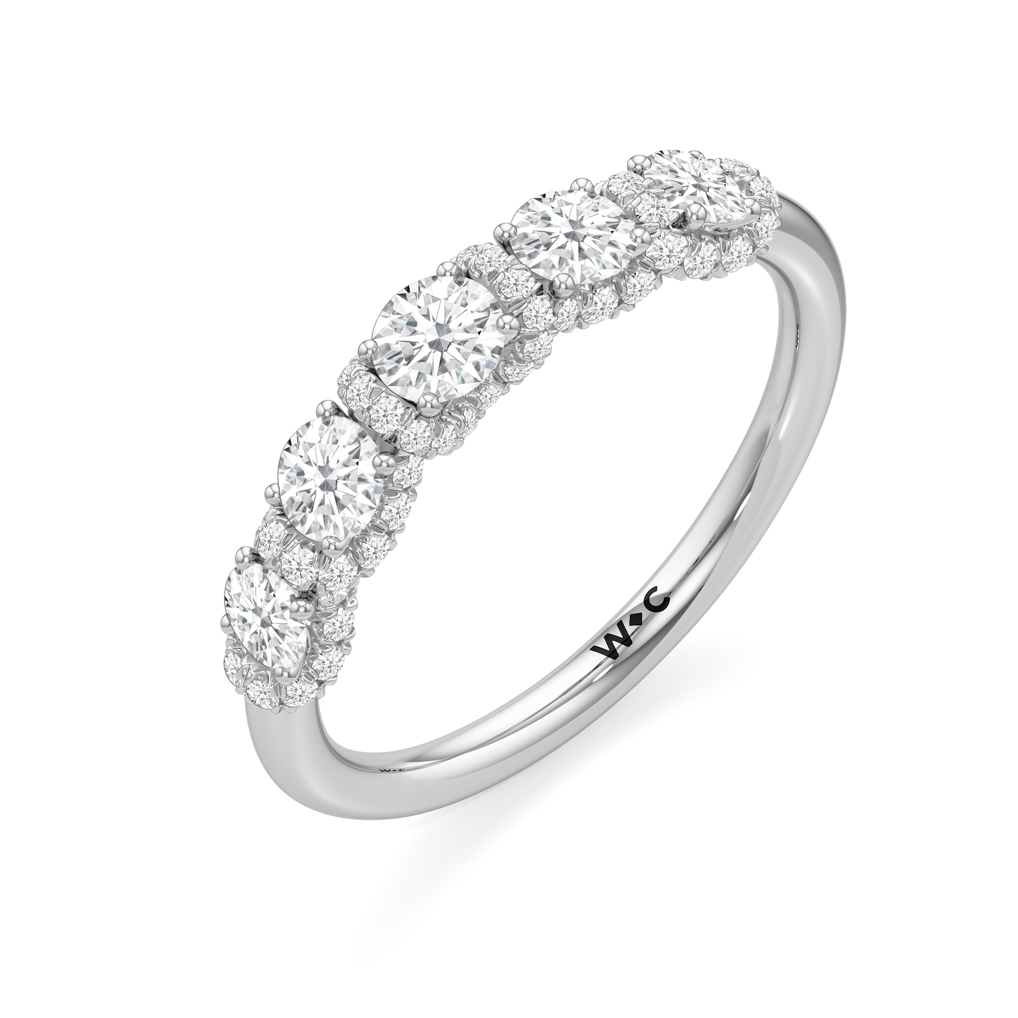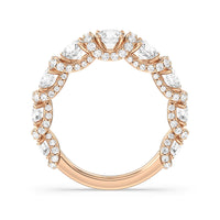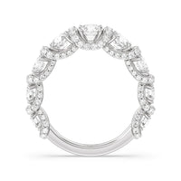 A true statement piece. This diamond ring is luxuriously decorated with more than a hundred diamonds. More than half of its polished band is dotted with round diamonds nestled within interconnected V-shaped baskets. Sweeping ribbons of petite diamonds traverse the edges and the spaces in between the round diamonds. This ring enthralls whether viewed on top or from the side.