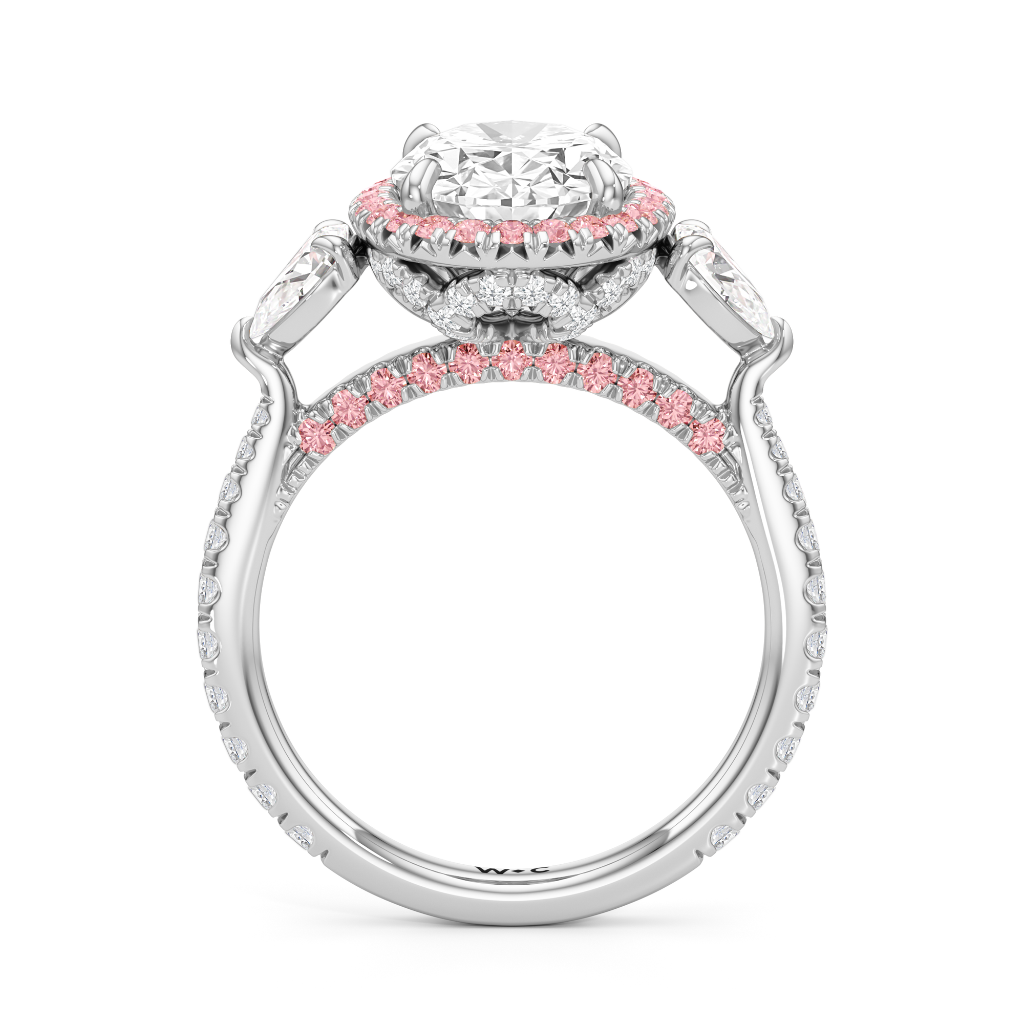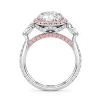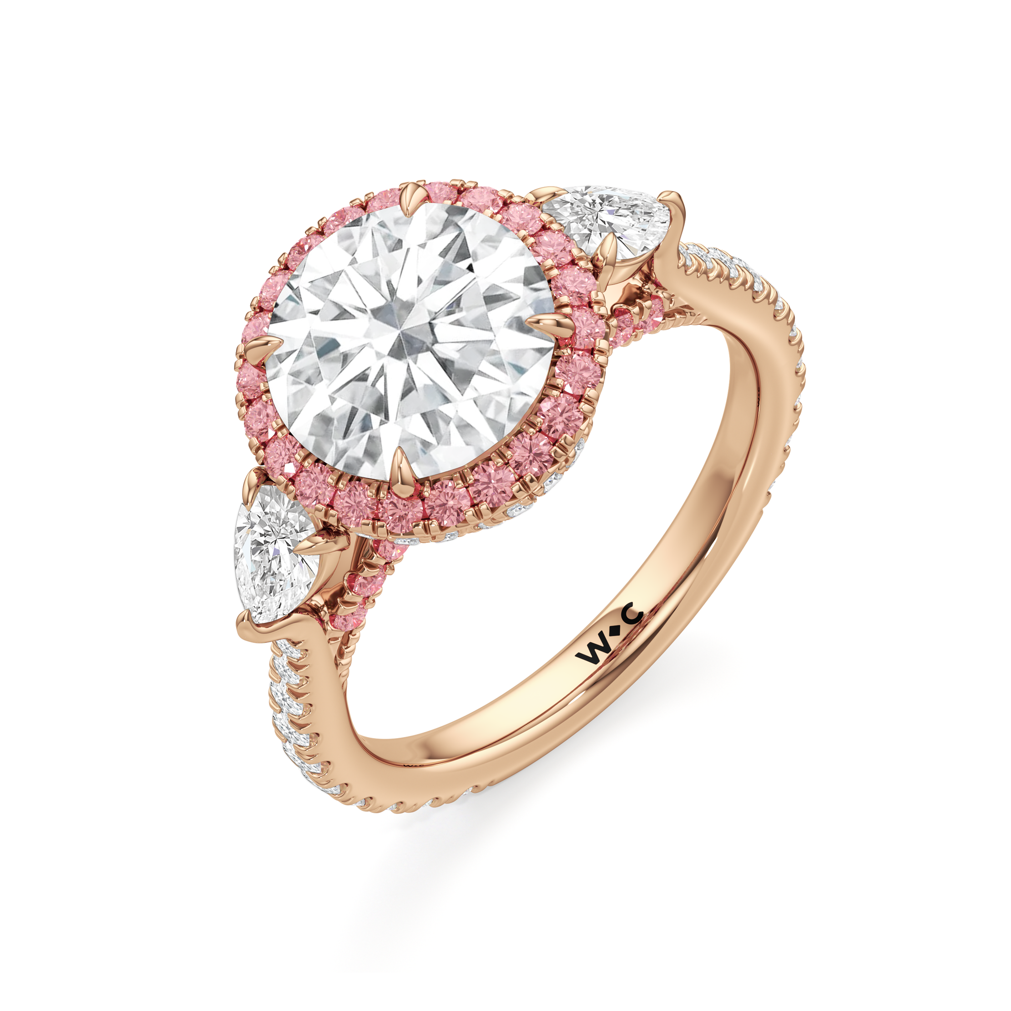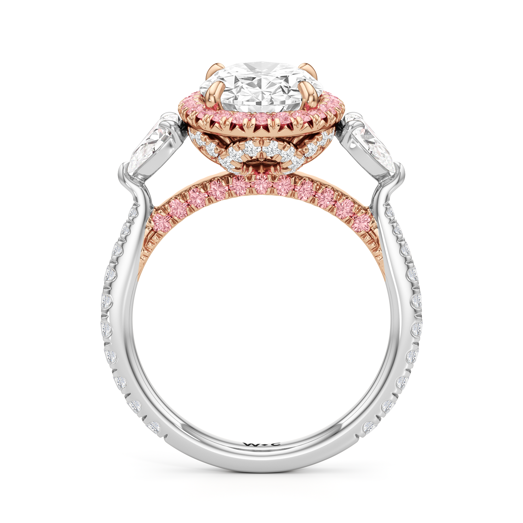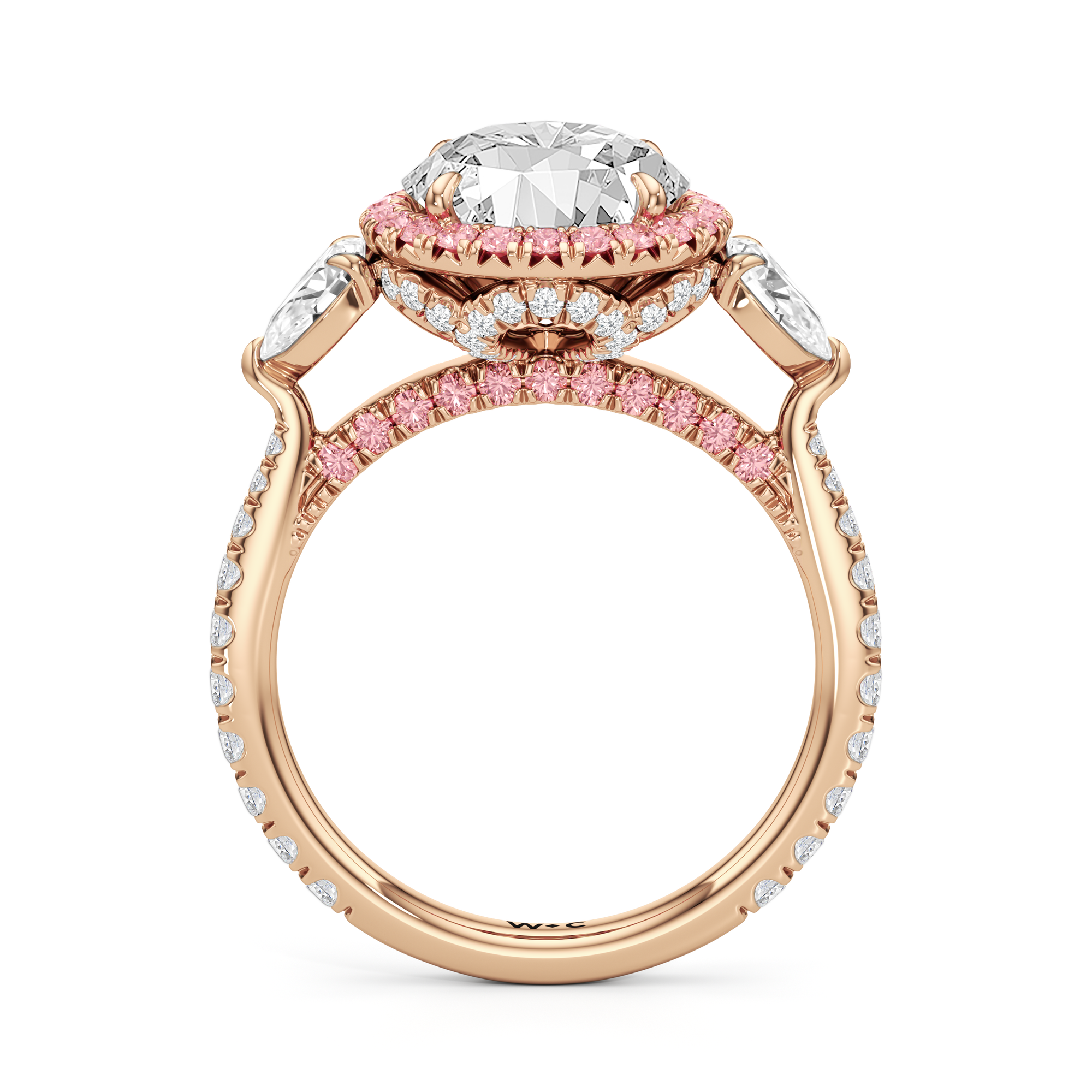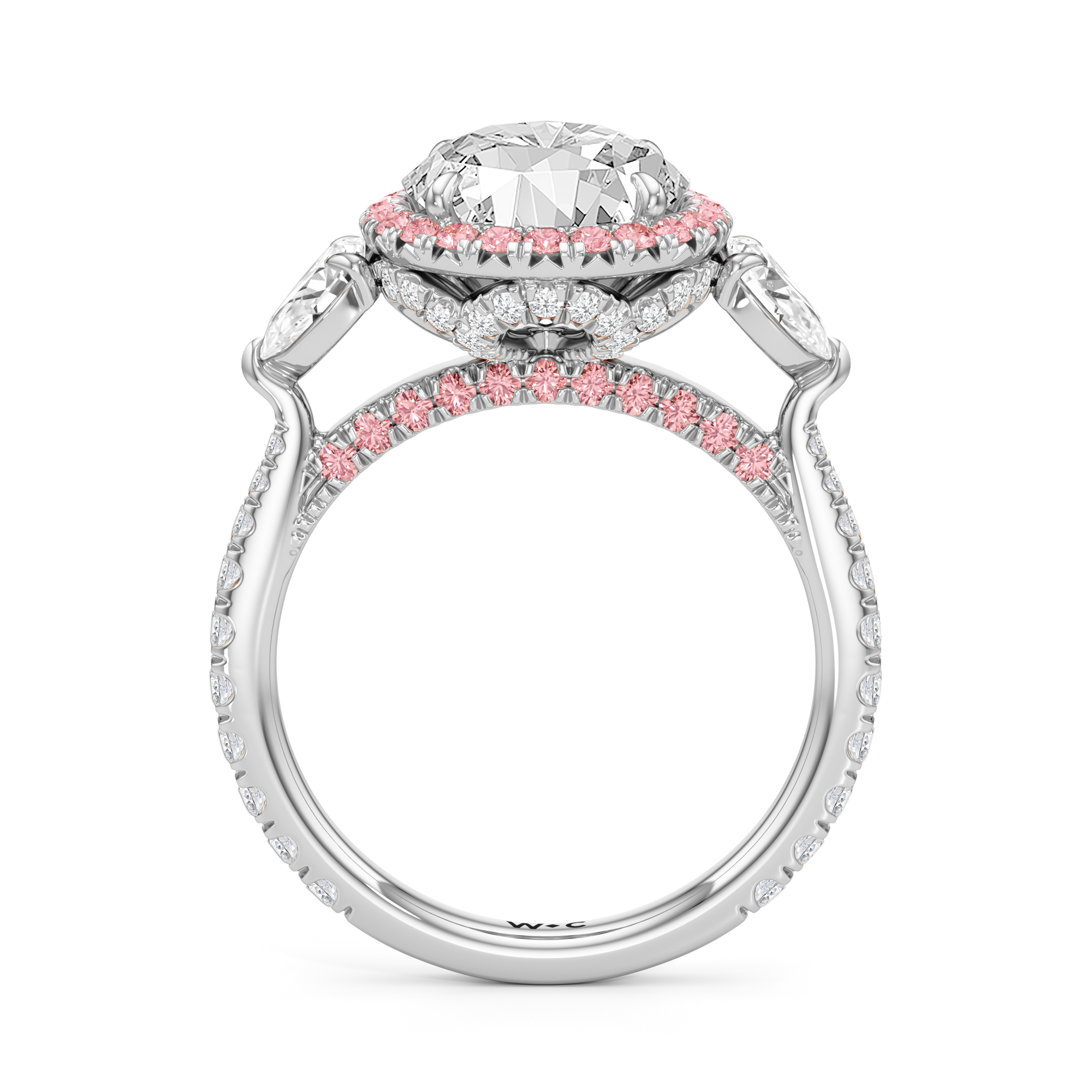 Dahlia's three-stone setting evokes an aura of heirloom beauty. The ring features diamond-set shoulders that lead the eye to a striking centerpiece. At its heart is a striking central diamond surrounded by a halo of pink diamonds on fishtail prongs. Pear-cut pink side stones flank the central gem. More pink diamonds line the bridge, while white diamonds trace the central stone's flower-inspired basket.