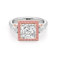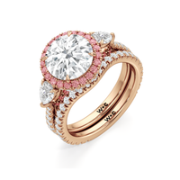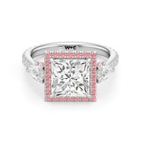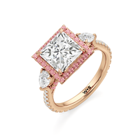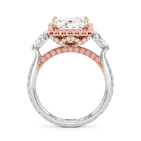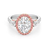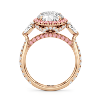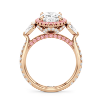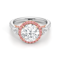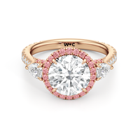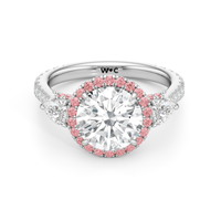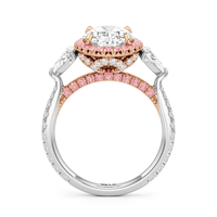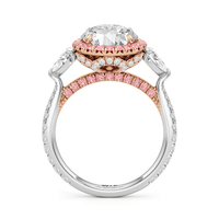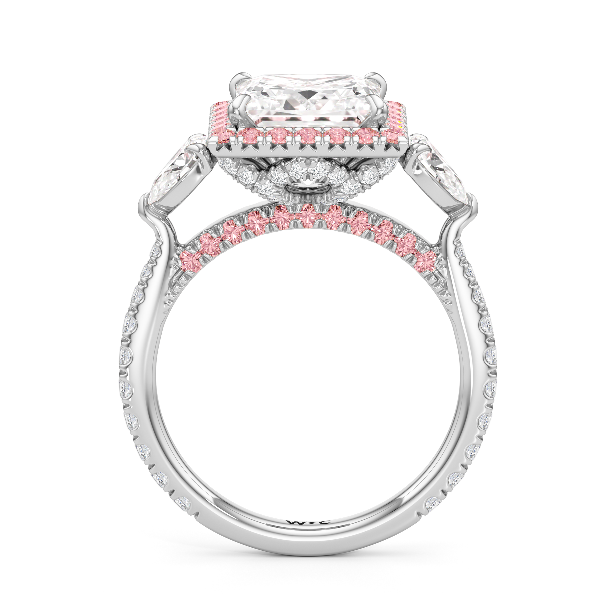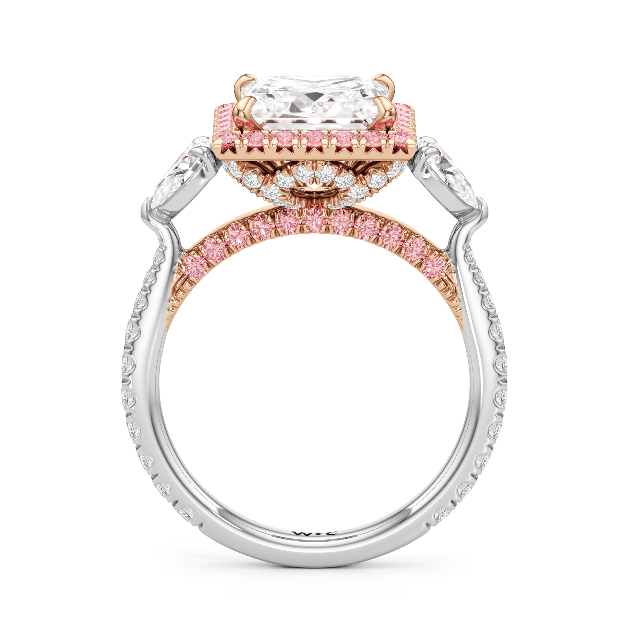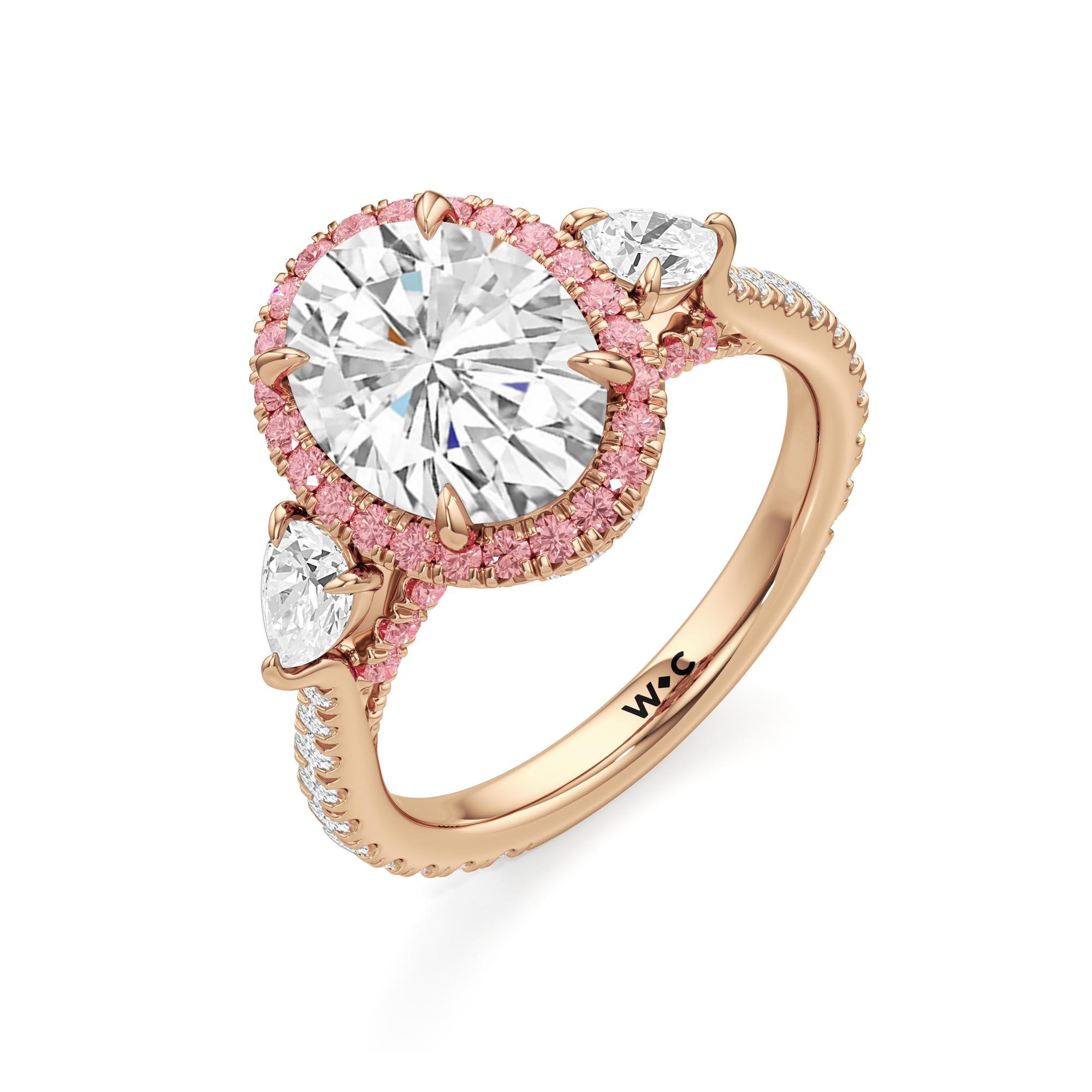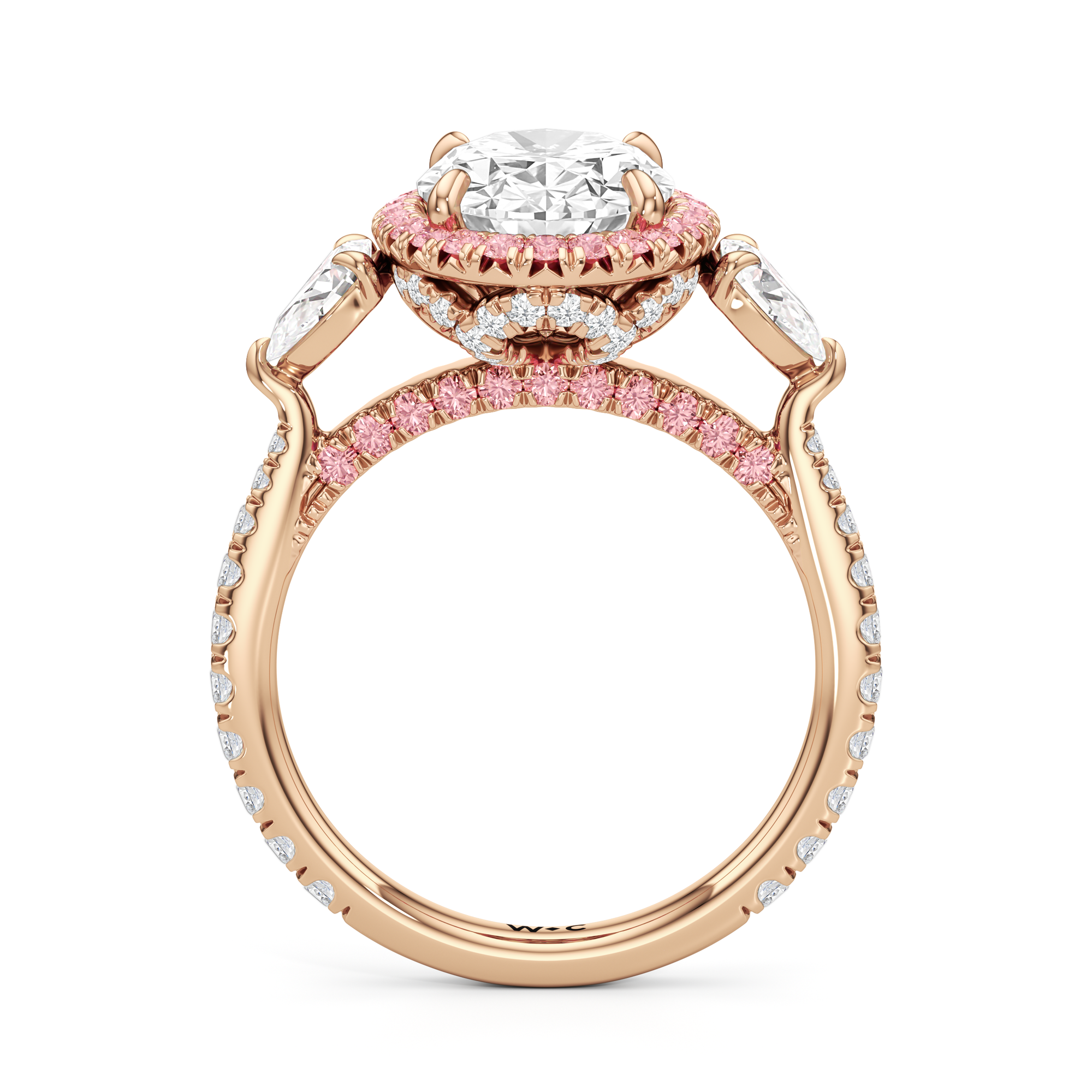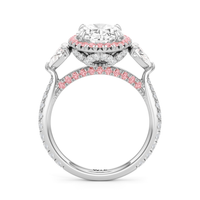 Dahlia's three-stone setting evokes an aura of heirloom beauty. The ring features diamond-set shoulders that lead the eye to a striking centerpiece. At its heart is a striking central diamond surrounded by a halo of pink diamonds on fishtail prongs. Pear-cut pink side stones flank the central gem. More pink diamonds line the bridge, while white diamonds trace the central stone's flower-inspired basket.