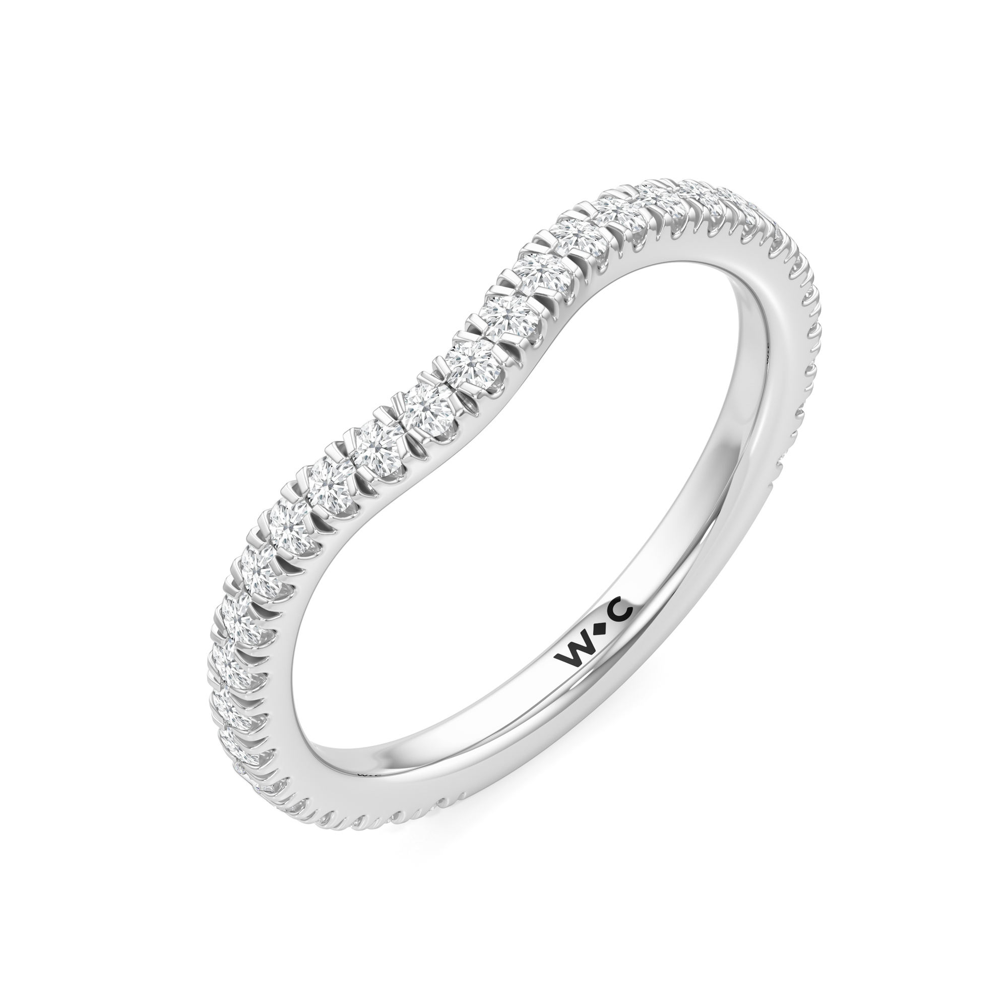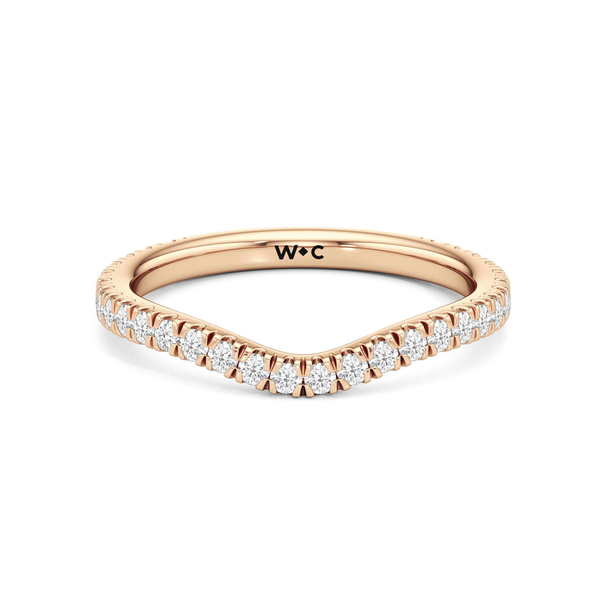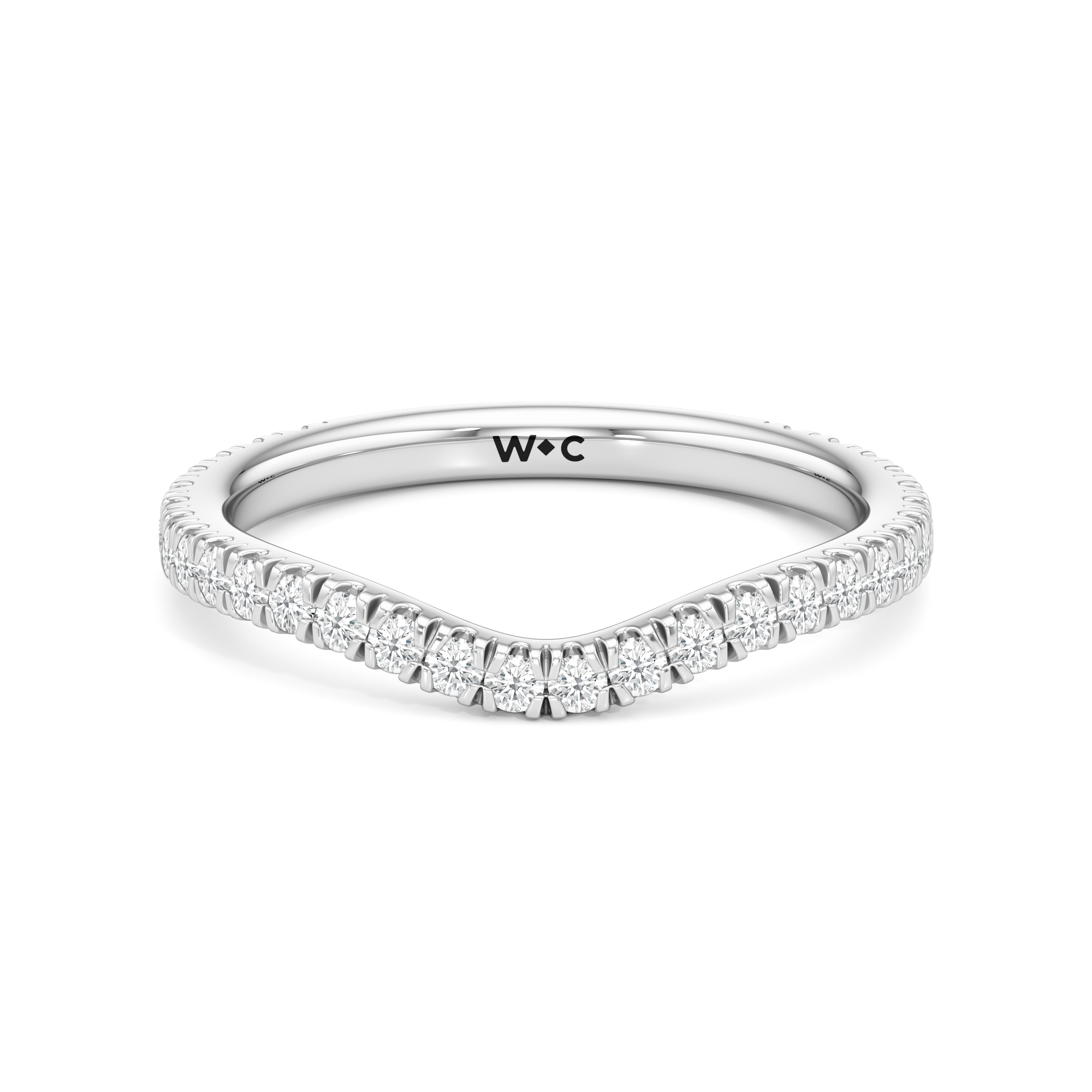 The Dahlia wedding band features a gentle chevron contour with pavé-set diamonds along the crown. Designed to nest seamlessly with its matching engagement ring, it offers a clean, sculpted finish with subtle dimension.