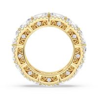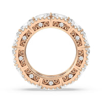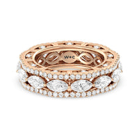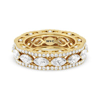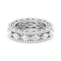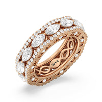 Show off your love with this ring with an unending sparkle. This white gold eternity band is decorated with a continuous row of marquise-cut diamonds set on shared prongs. The scalloped profile of this central row is bordered by petite round diamonds in micro-pave setting. To give the ring an elegant finish, the sides feature a carved filigree pattern with milgrain detailing and additional diamond embellishments.