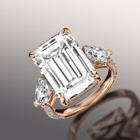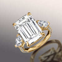 Known for its glittering salute to yesterday, today, and tomorrow, this three-stone ring boasts a dominant emerald-cut diamond center stone set in between pear diamonds. The main stone is secured by cross-over prongs for added style. For added brilliance, the band's shoulders are fully covered with rows of round diamonds that all create a meaningful token of your promise and commitment.