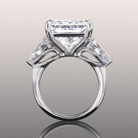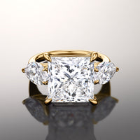 Delve into romantic and feminine craftsmanship that makes an enchanting declaration of love and devotion. This luxurious three-stone ring boasts a marvelous pear diamond center stone flanked by two sleek marquise diamonds. The beguiling central gem sits on a five-claw-prong setting, while the marquise diamonds rest on a three-prong setting lifted from the band's bridge by a lotus-inspired open gallery.