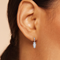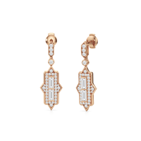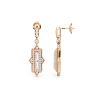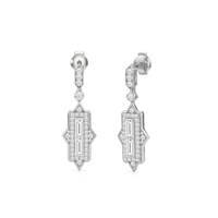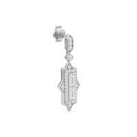 These diamond dangler earrings echo the graceful bends and sculpted angles of iconic Art Deco architecture. At the center, a duo of north-south oriented baguette diamonds evokes sleek vertical lines, surrounded by prong-set round diamonds in a crisp, geometric frame detailed with fine milgrain accents. The structured base and articulated drop reflect the angular elegance and refined craftsmanship of the era, capturing both bold form and delicate ornamentation. The result is a design that feels timeless yet modern, infused with vintage sophistication and architectural clarity.
