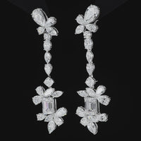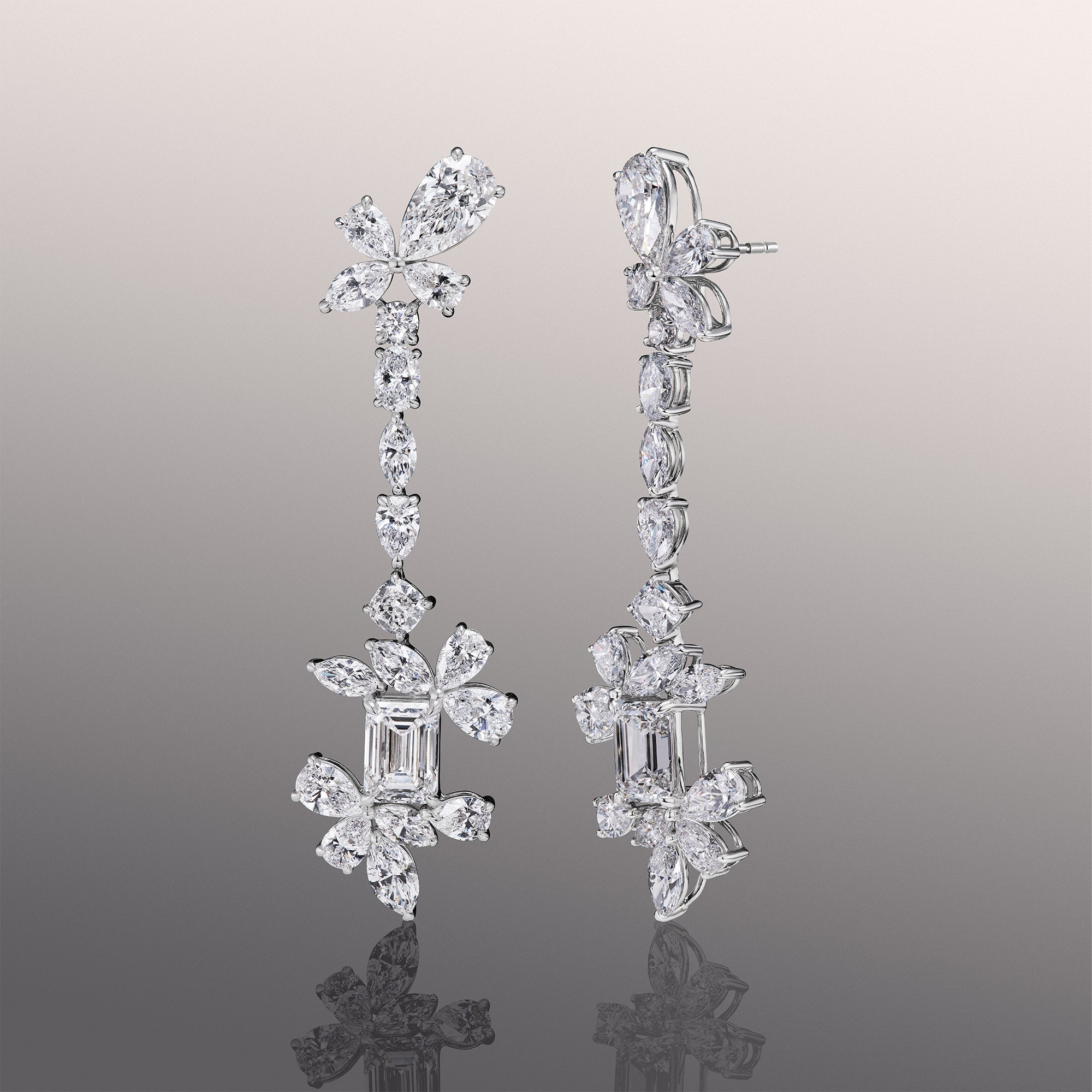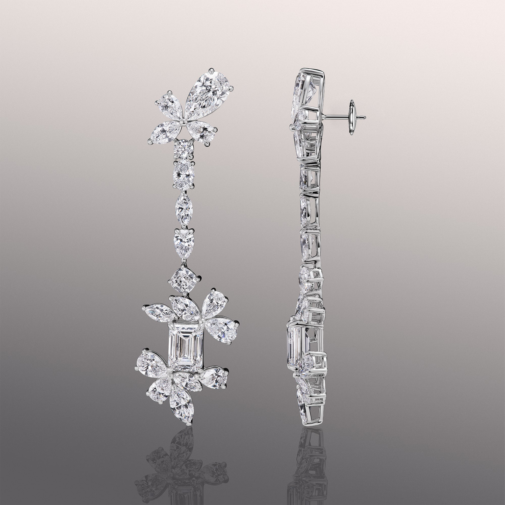 Turn heads with exquisite precision and the seamless interplay of depth. These drop earrings boast a captivating combination of emerald, pear, cushion, marquise, oval, and round diamonds. Breathtakingly stunning and enviable, these earrings mark moments you want to remember forever.