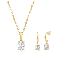 The Drop Oval Set is a classic duo that you can never go wrong with. This set includes a pair of drop earrings and a necklace. The ear sparklers are designed with C-hoops and an oval diamond drop. The necklace carries an oval solitaire pendant that is minimalist enough for layering and daily wear.