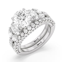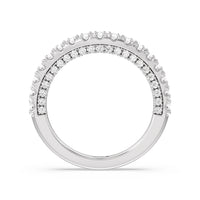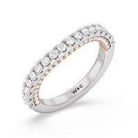 This curved diamond set wedding band is perfectly contoured to complement our heritage trellis side stones engagement ring for a simple and sophisticated look.