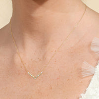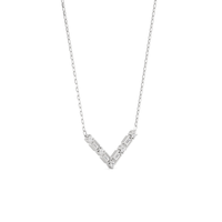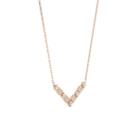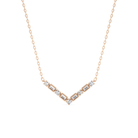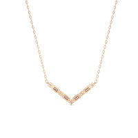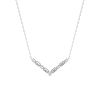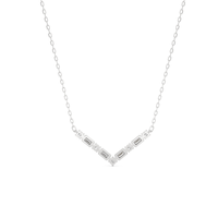 A piece that proudly displays the edgy side of sophistication, perfect for those who embrace both confidence and grace. The pendant is designed with a V-shaped pattern composed of alternating round diamonds on four prongs and bezel-set baguette diamonds.