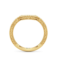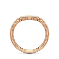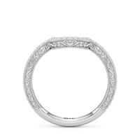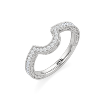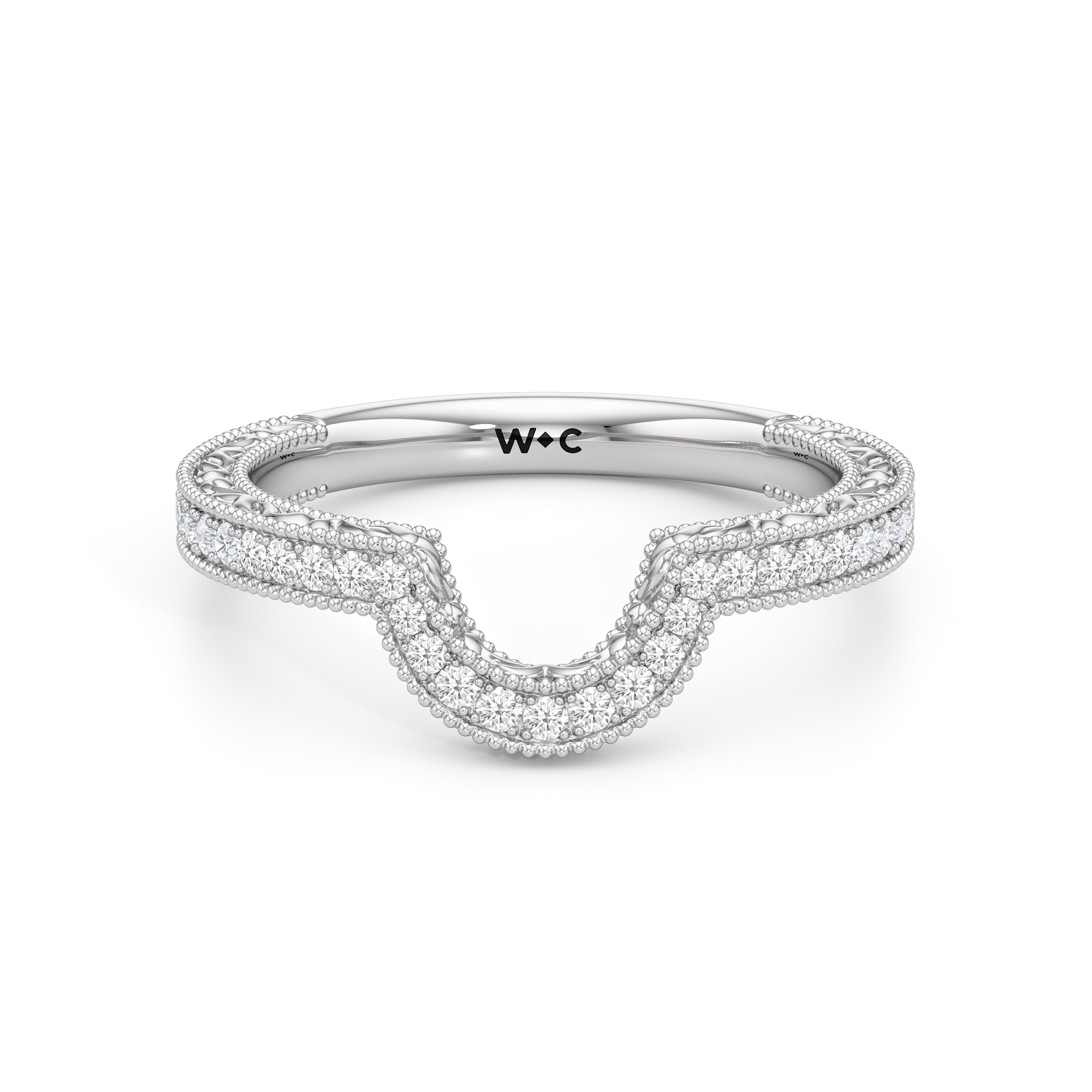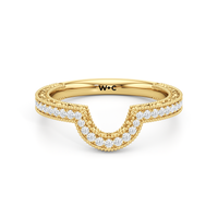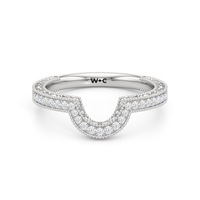 This curved diamond set wedding band is perfectly contoured to complement our the elodie ring for a simple and sophisticated look.