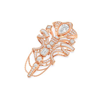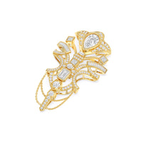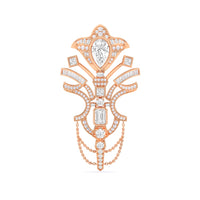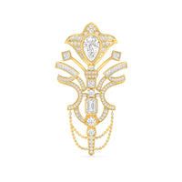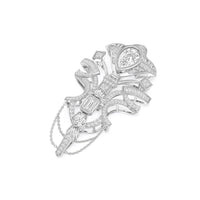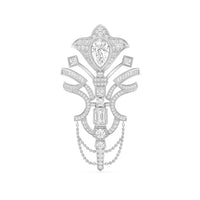 Inspired by the iconic art deco architecture of 1920s New York City, The Empire Brooch embodies the era’s bold elegance. Echoing the grandeur of landmarks like the Chrysler Building and Rockefeller Center, it features geometric precision, symmetry, and opulent details. A stunning pear-cut diamond takes center stage, accented by princess, radiant, round, and baguette-cut diamonds. The interplay of strong lines and shimmering facets creates a striking contrast, celebrating innovation and timeless glamour.
