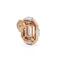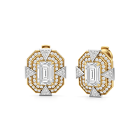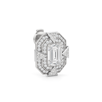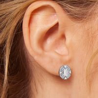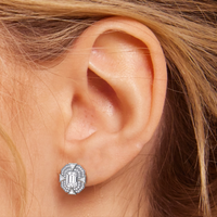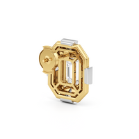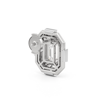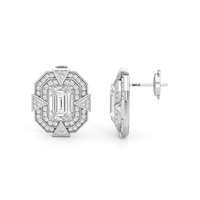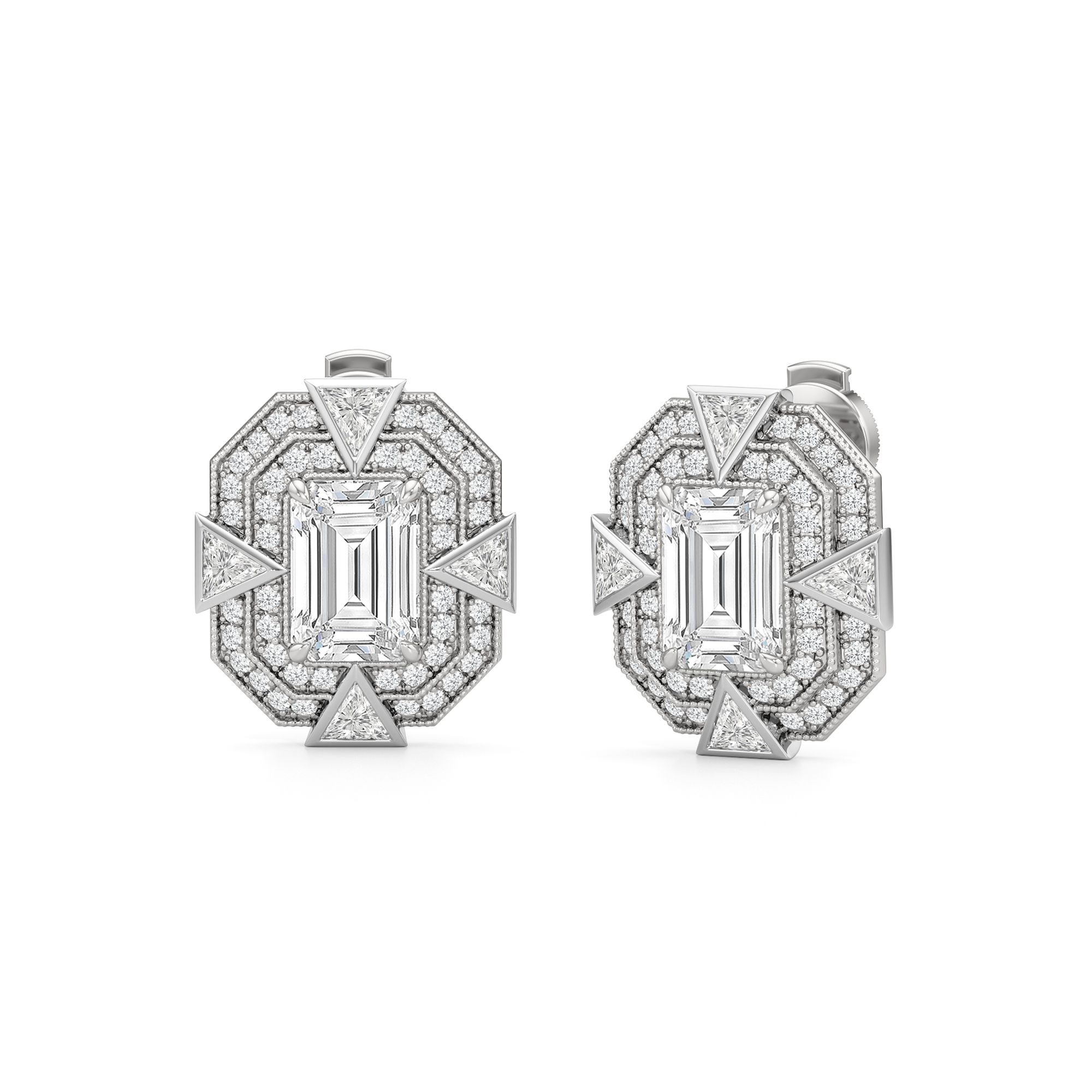 The Empire Earrings' design is set to remind you of the sophistication of the Art Deco era and the glamour of the Roaring Twenties. An emerald-cut stone sits at the center of each earring, framed by a double octagonal halo of round diamonds in baby pavé setting. Four bezel-set trillion-cut diamonds, arranged in a compass setting, adorn each stud and bring a sense of symmetry and architectural strength to the design. Milgrain beading weaves through the layers, adding texture and a touch of vintage charm to the earrings' bold, geometric silhouette.