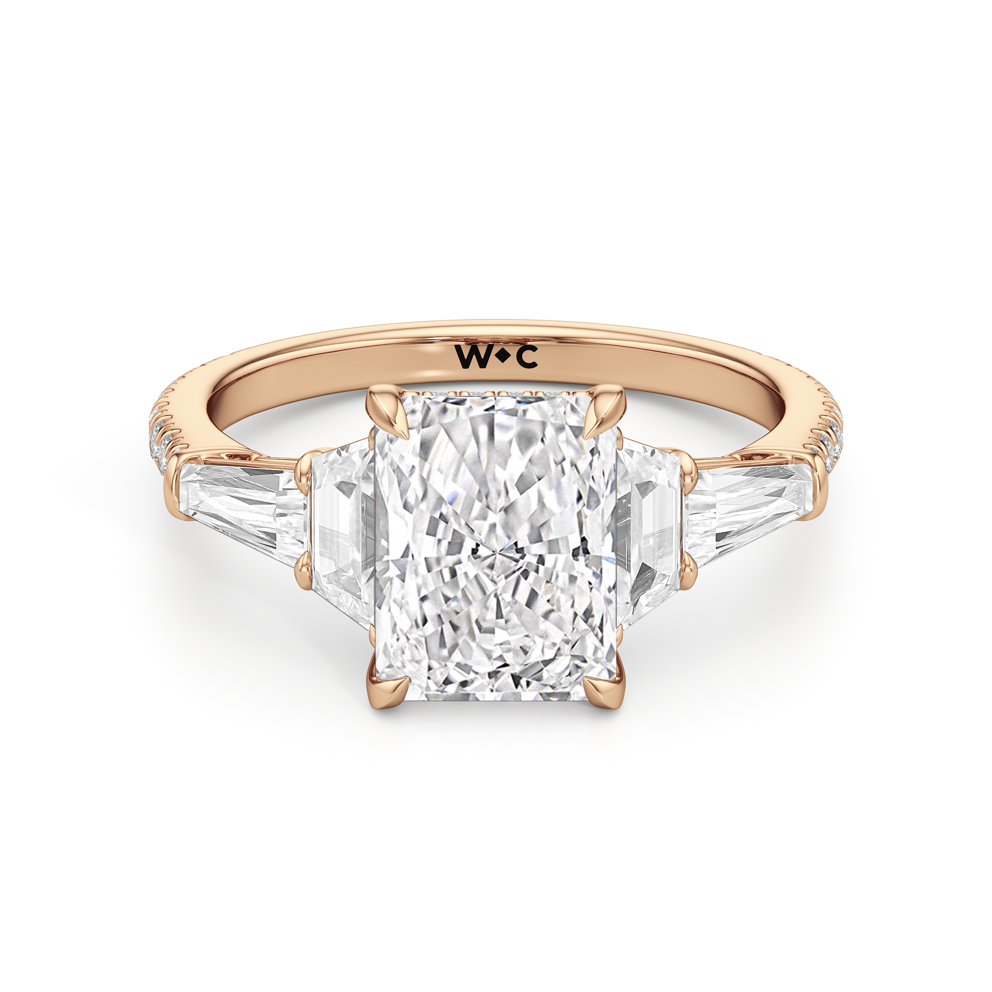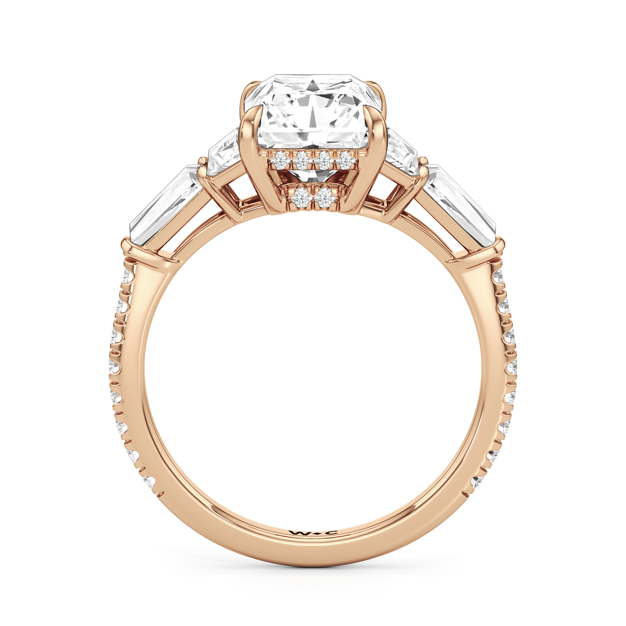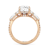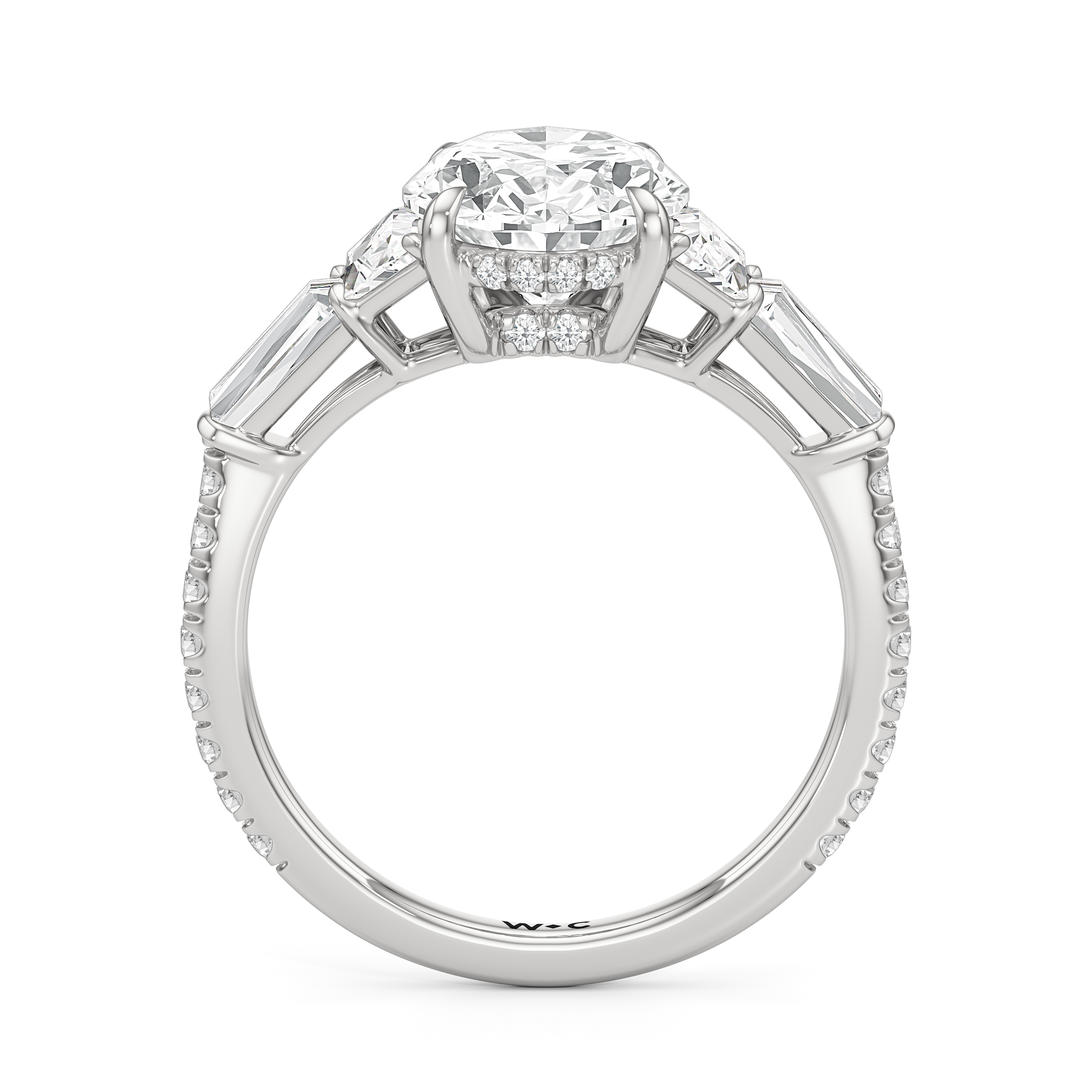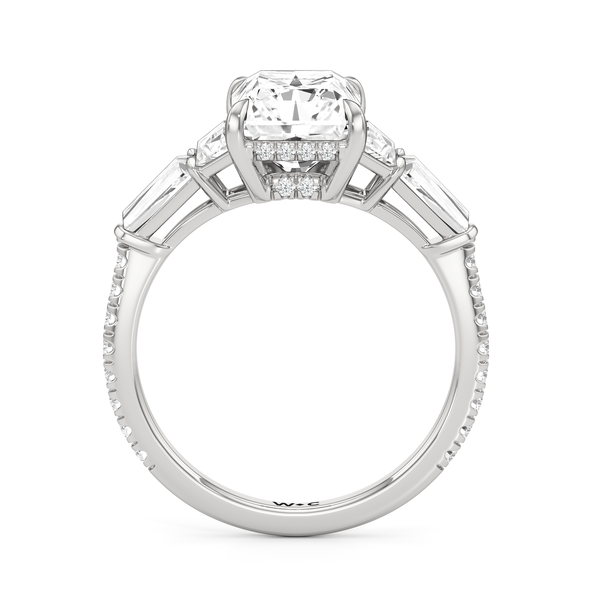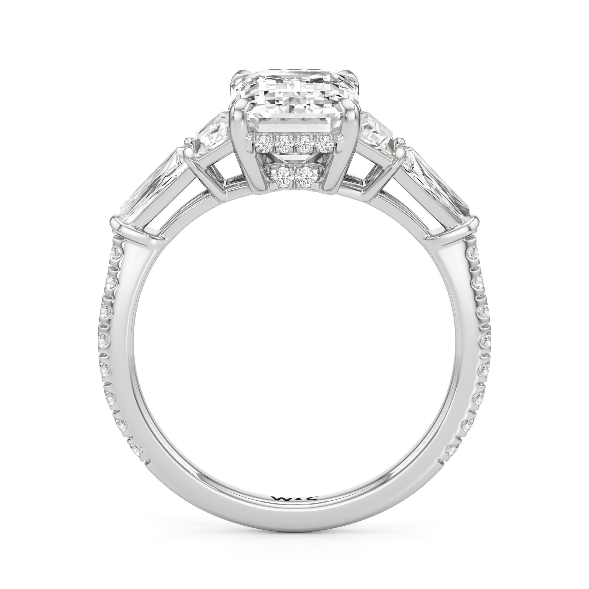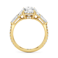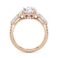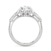 Minimalist and defined. The center stone secured by four prongs is flanked by trapezoid side diamonds that step down into tapered baguettes, creating a sharp, tiered silhouette. This geometric descent is softened by a trail of round diamonds running down the shank, blending precision with continuous scintillation.