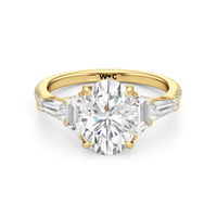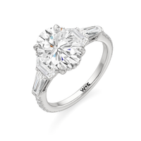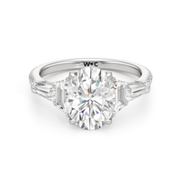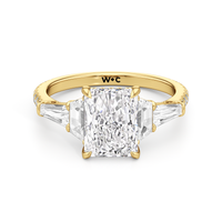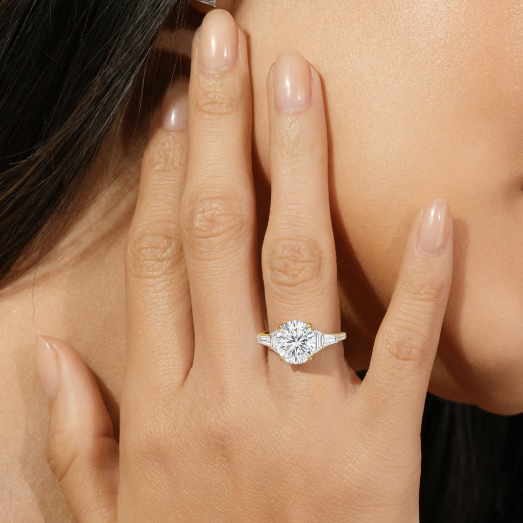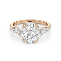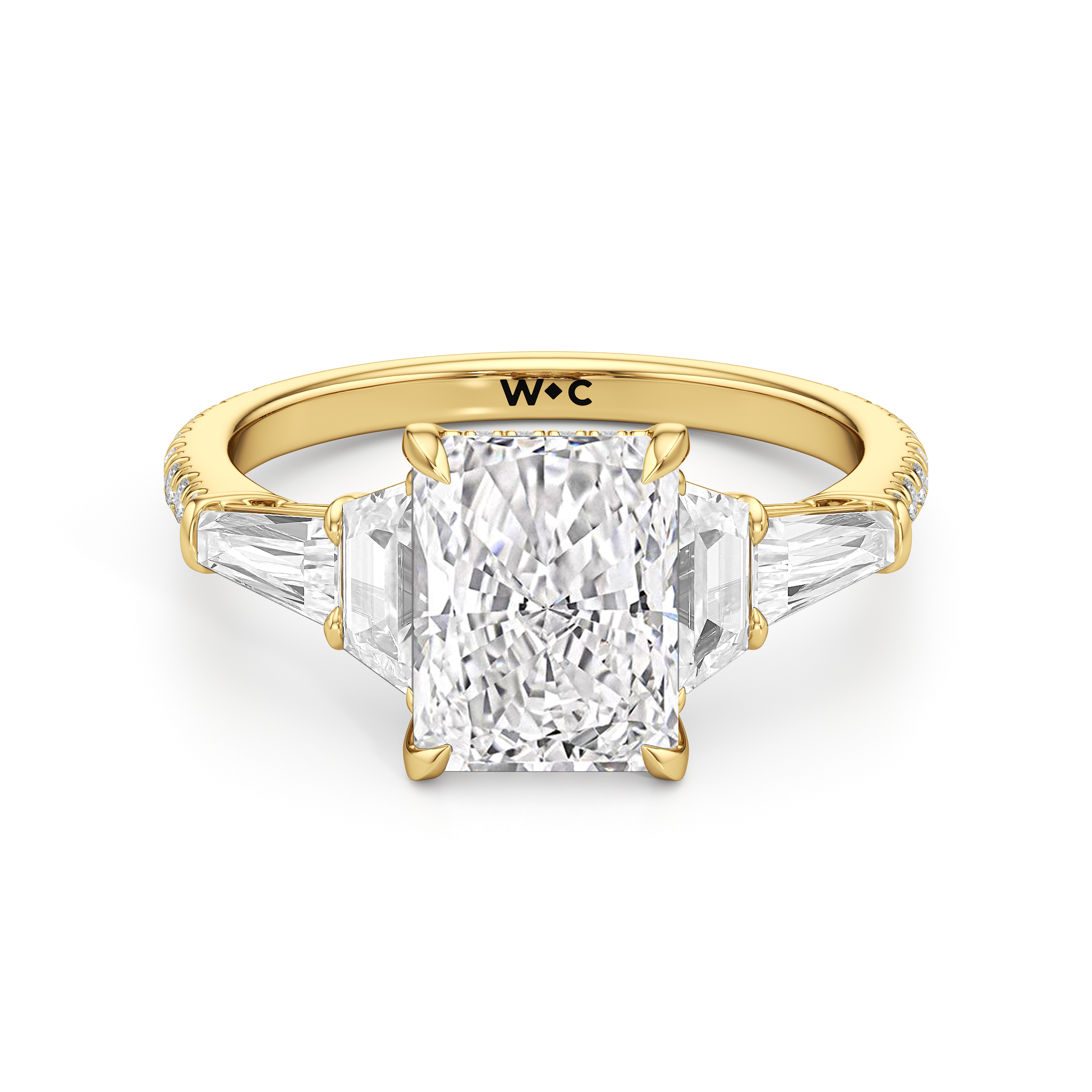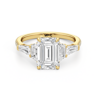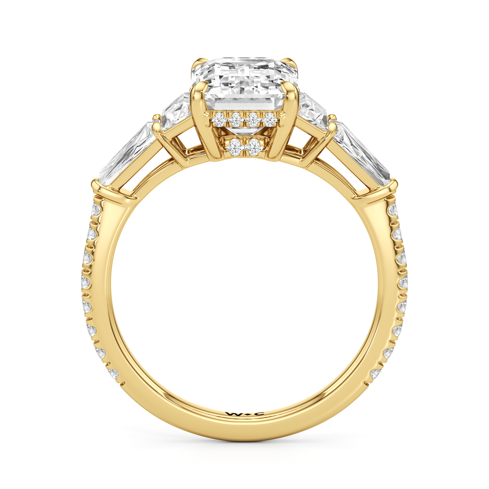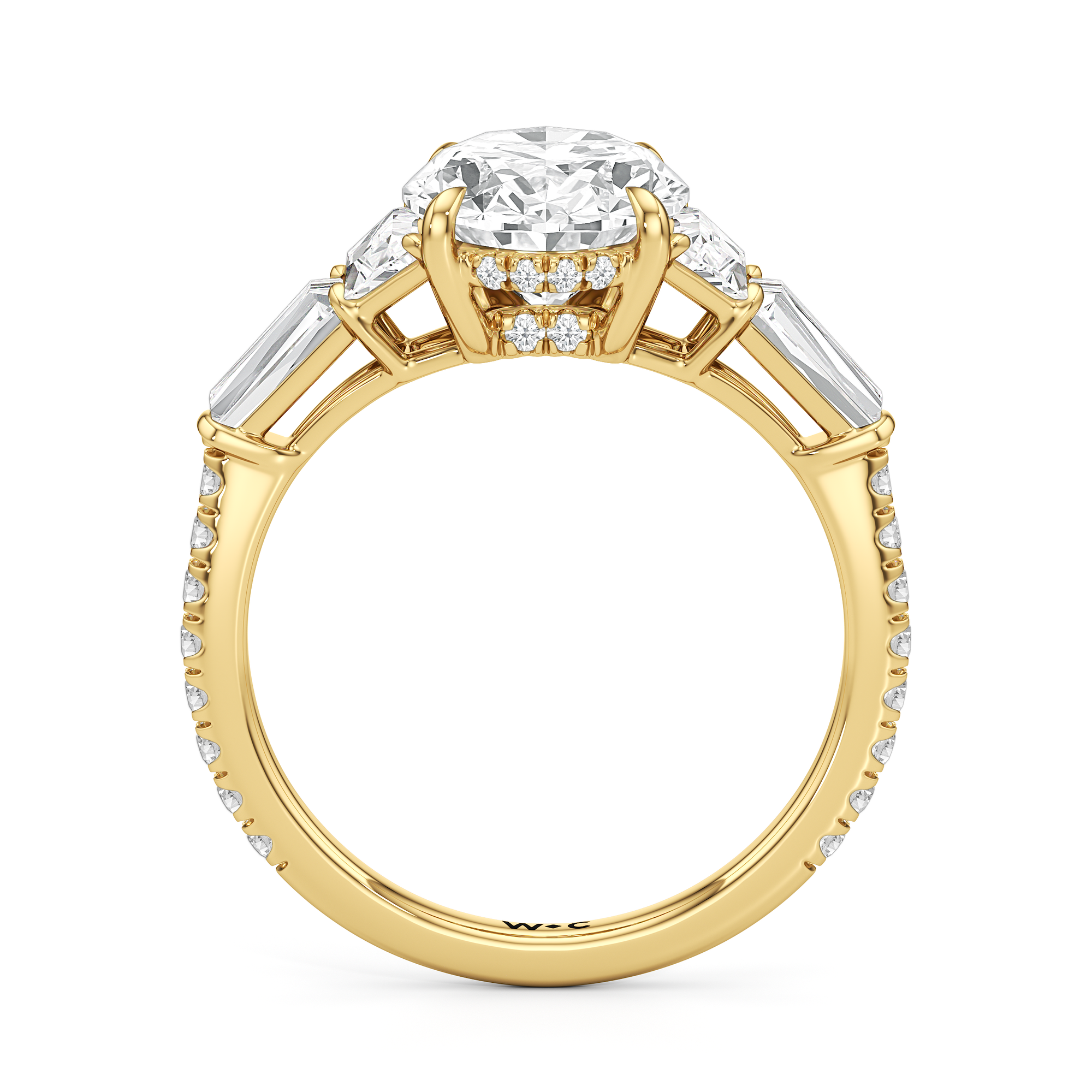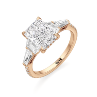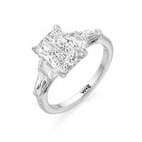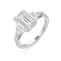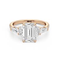 Minimalist and defined. The center stone secured by four prongs is flanked by trapezoid side diamonds that step down into tapered baguettes, creating a sharp, tiered silhouette. This geometric descent is softened by a trail of round diamonds running down the shank, blending precision with continuous scintillation.