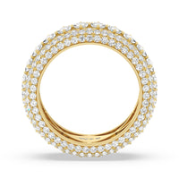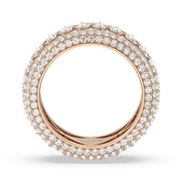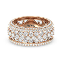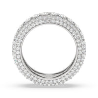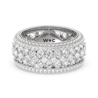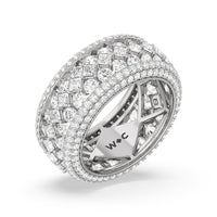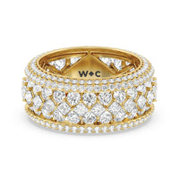 Nothing says forever quite like this broad eternity ring. With paved stones on its edges and three rows of diamonds around its entire circumference, this stunning sparkler in gold radiates unceasing brilliance as constant as your love.
