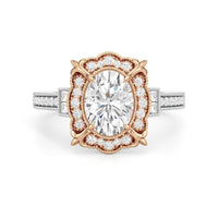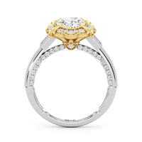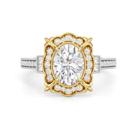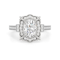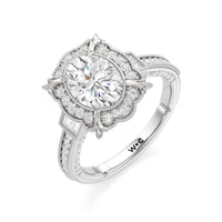 A luxurious ring presenting a design inspired by Art Deco's showcase of industrial might and delicate artistry. This architectural jewel features a prong-set center stone surrounded by a decorative frame with milgrain outline. A fleur-de-lis motif sits on each of the four corners of the frame, mirroring how the Chrysler Building’s gargoyles accentuate its iconic silhouette. More diamonds cascade from the center like a glowing skyline, starting with a pair of baguette side stones and continuing with round diamonds flowing gracefully along the cathedral shank. And like the unexpected details of the Chrysler Building, this ring also features hidden diamonds on the bridge ready to be discovered by those who look closer.