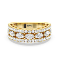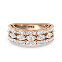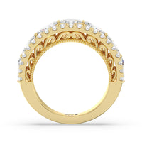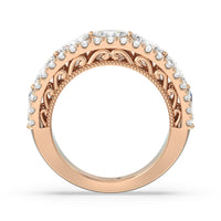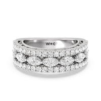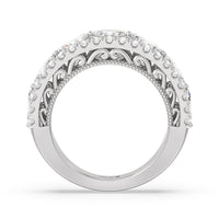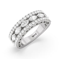 This ring captivates with an abundance of sparkle. It features a white gold band that tapers toward the back for a comfortable fit. The top half of the shank features an open-worked center traced by a dazzling row of marquise-cut diamonds in east-west setting. Framing the edges are prong-set round diamonds reflecting their impeccable brilliance. To give the ring a vintage flair, an attractive filigree gallery with milgrain detailing can be seen from the side of the ring.