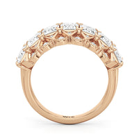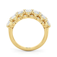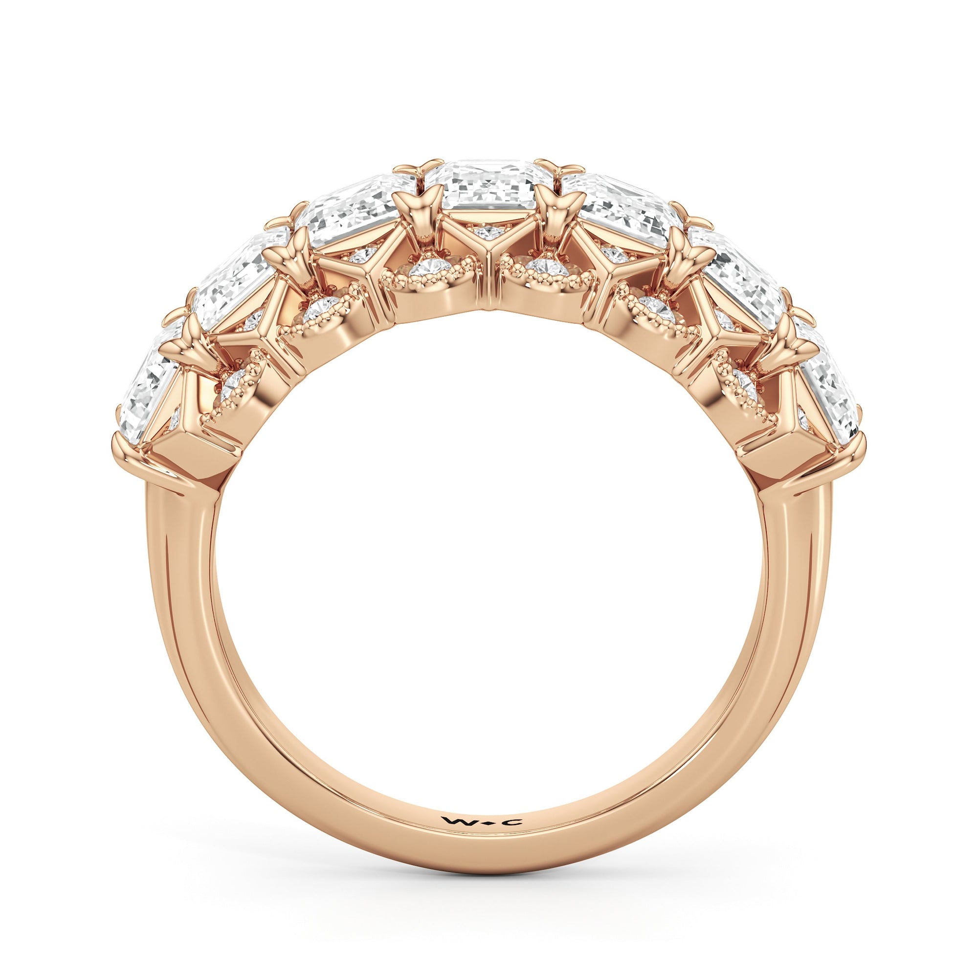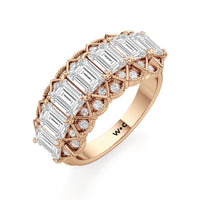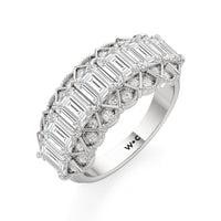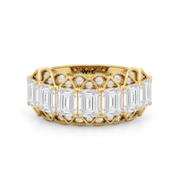 Designed to capture the timeless allure of Art Deco design, each detail in this anniversary ring is a tribute to harmony and beauty that stands the test of time. It features a bold and architectural centerpiece, with step-cut diamonds on one line and round diamonds illuminating a continuous chevron pattern. A delicate scallop border softens the design, echoing the graceful curves of Art Deco's most famous masterpieces. Fine milgrain detailing completes the vintage charm of the ring. This piece glows with brilliance, much like golden light reflecting off a grand frieze at sunset.