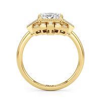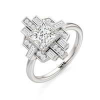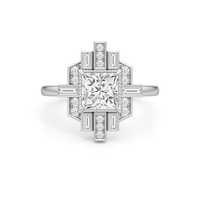 Inspired by the marvelous Art Deco of Rockefeller Center, this ring showcases a captivating design defined by artistic refinement and architectural grandeur. Its sleek, unadorned band directs all attention to the stunning centerpiece—a princess-cut diamond framed by a captivating mix of round diamond duos and baguette diamonds. The round diamond pairs are set in a vertical style, a hallmark of Art Deco design. The step-cut baguette diamonds are set in vertical and horizontal orientations, creating a clean, strong, and symmetrical look that echoes the geometric precision of Art Deco architecture.