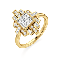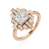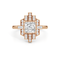 Inspired by the marvelous Art Deco of Rockefeller Center, this ring showcases a captivating design defined by artistic refinement and architectural grandeur. Its sleek, unadorned band directs all attention to the stunning centerpiece—a princess-cut diamond framed by a captivating mix of round diamond duos and baguette diamonds. The round diamond pairs are set in a vertical style, a hallmark of Art Deco design. The step-cut baguette diamonds are set in vertical and horizontal orientations, creating a clean, strong, and symmetrical look that echoes the geometric precision of Art Deco architecture.