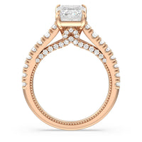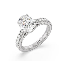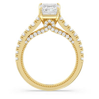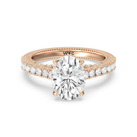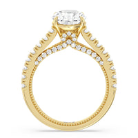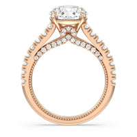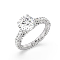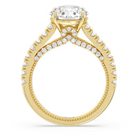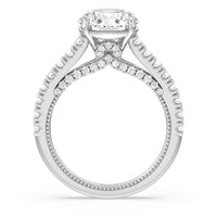 An undeniable showstopper, this diamond engagement ring boasts a crystal clear central diamond on an imposing cathedral shank. The band has its sides and bridge studded with glittering diamonds for a sparkle that never ends. With delicate swirls and a graceful shine, this stunner will resonate with classic brides-to-be who know elegance when they see it.