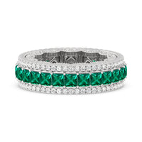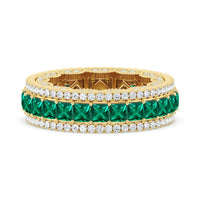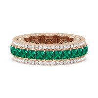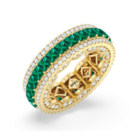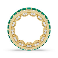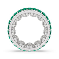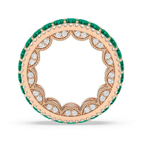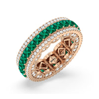 This dazzling ring showcases a magnificent combination of vintage femininity and royal opulence. The entire circumference of the ring is meticulously covered with diamonds. Laid at the center are prong-set created Emerald princess, bordered on two sides with petite round diamonds on micro prongs. The inner edge of the ring is decorated with a scalloped detail traced by tiny milgrain beads and punctuated by more round diamonds.
