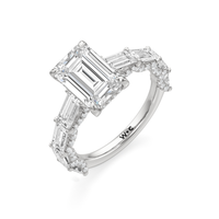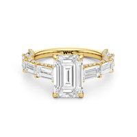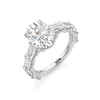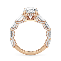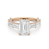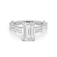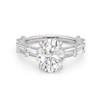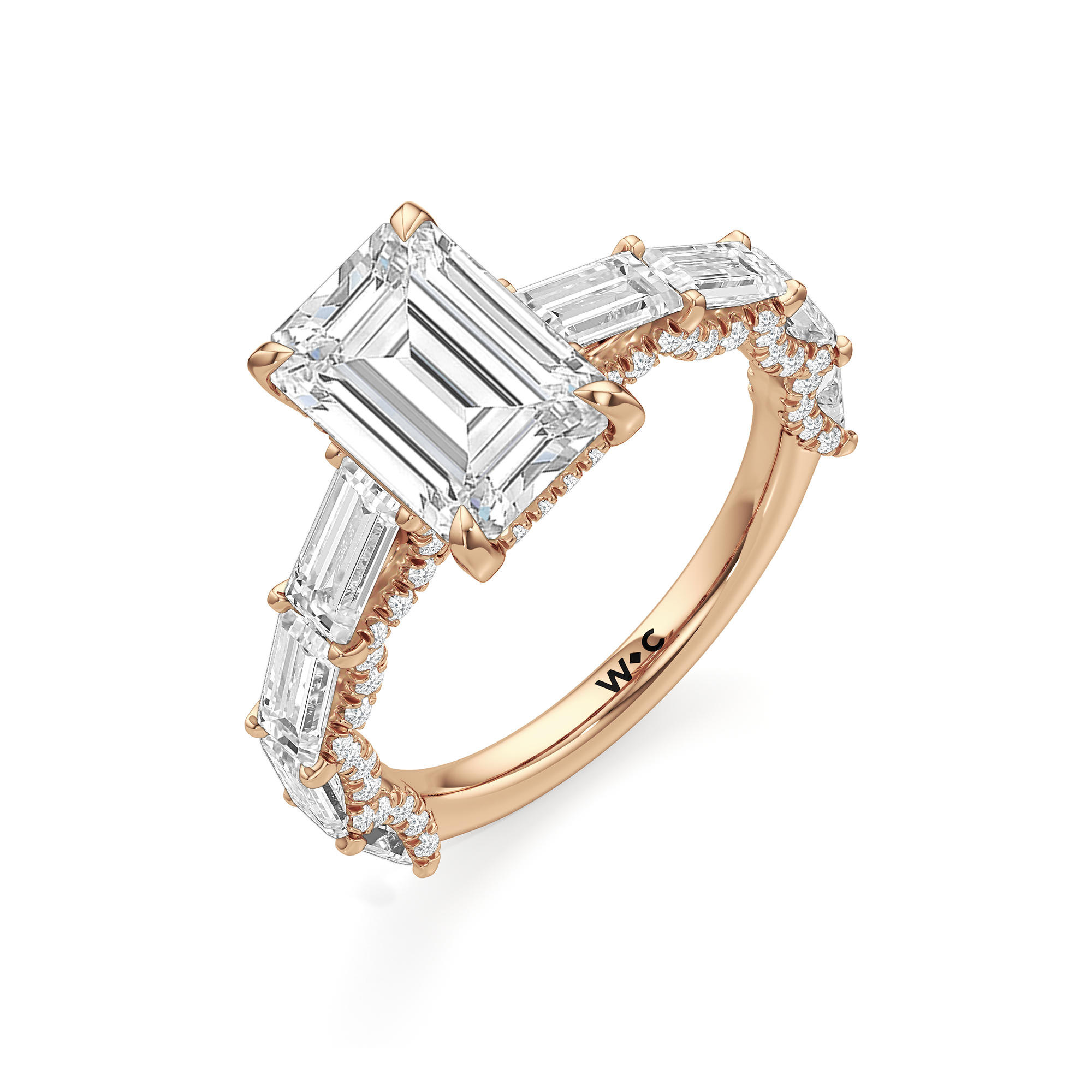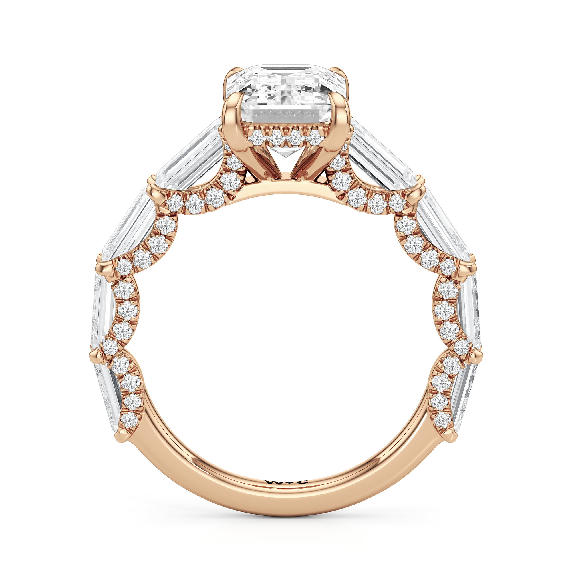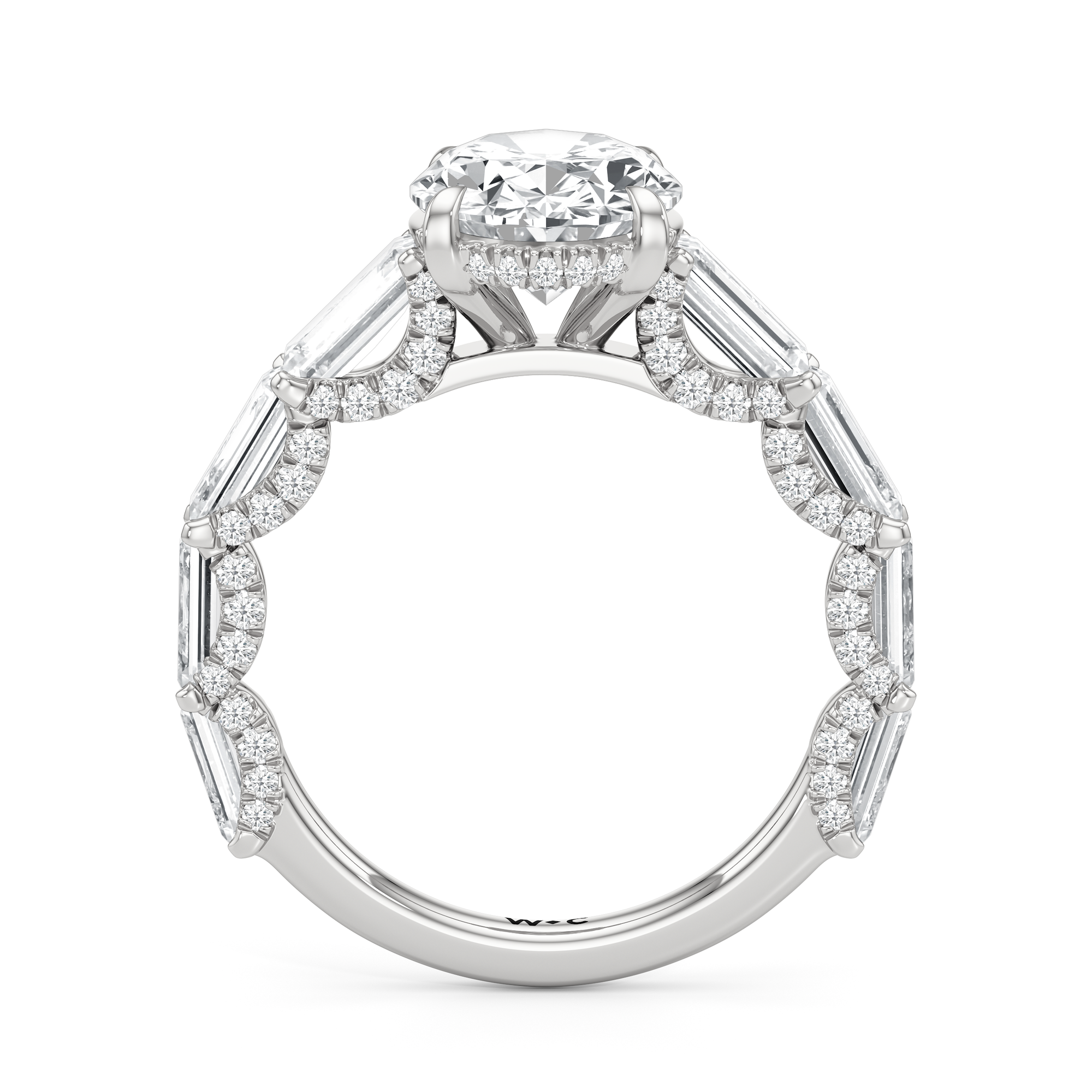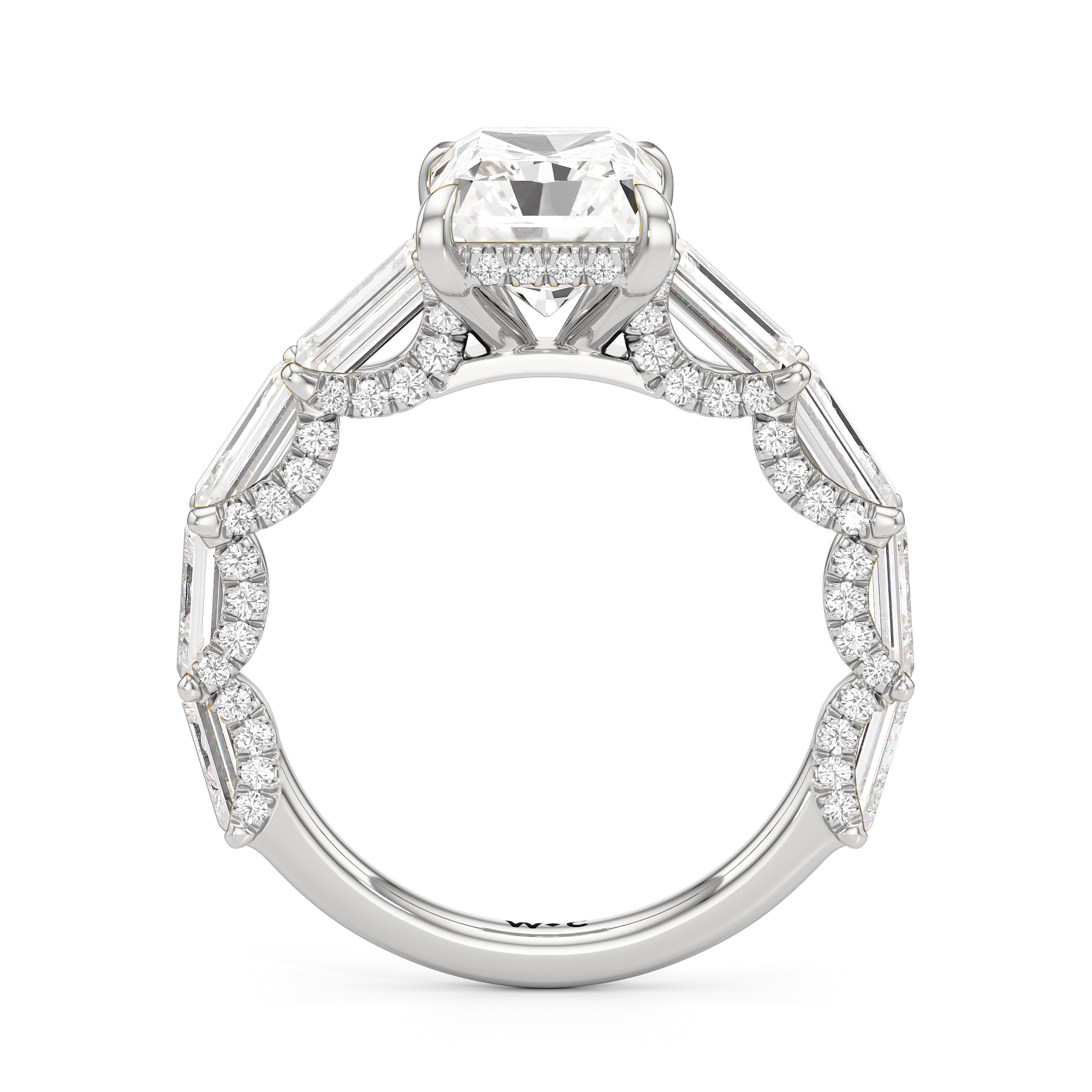 Elusively elegant. A row of baguette diamonds on shared prongs shapes the shank, leading to a center stone held by sharp but refined claw prongs. From the side, an ornate, diamond-dotted scalloped gallery reveals a hidden complexity.