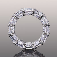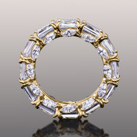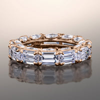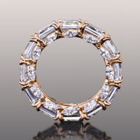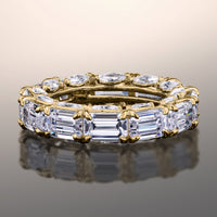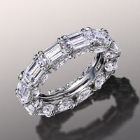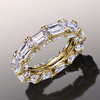 Though simple at first glance, this ring is elegantly daring in detail. It features an arrangement of emerald-cut diamonds encircling the band's circumference. Each step-cut gem is mounted on a u-shaped claw-prong setting. The inward curve of every u-shaped setting is punctuated by a slanted marquise diamond for added brilliance, making it an breathtaking piece.