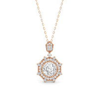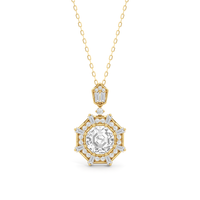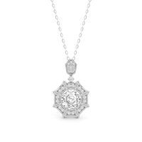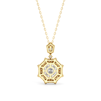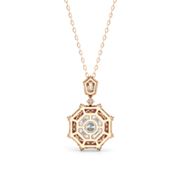 The design of the Guardian Necklace draws inspiration from the bold geometric form of the south tower of Detroit's Guardian Building, a prominent 40-story Art Deco structure. This piece features an octagon-cut stone resting within an eight-sided frame. The frame is detailed with radiating baguette-cut diamonds set between pairs of round diamonds. The striking octagonal pendant is linked to a round diamond, which elegantly suspends from a polygonal bail adorned with additional baguette and round diamonds. Together, these elements create a piece that captures the graphic clarity of Art Deco design.