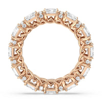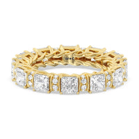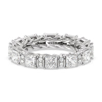 Here is an eternity ring infused with whimsical fairytale romance. This stunner features princess-cut stones on four-prong baskets lining the entire circumference of the band. In between each princess-cut stones is a collar of petite round diamonds. Beneath the stones is a trellis-style precious metal setting that gives the ring a unique and charming look.