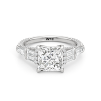 Brilliant and multifaceted. Mirroring its namesake's legacy of glamour, the design features the hidden complexity of a true icon. Baguette diamonds are arranged in a tiered orientation, acting as structural side stones that frame a prong-set center stone. A sweeping ribbon of petite diamonds lines the profile and crosses the centerpiece in a brilliant collar. A delicate trail of diamonds traces the shank toward a polished back.