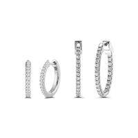 Everyone needs their go-to pair of hoops. This ear stack features two pairs of diamond hoop earrings. One has a classic design and the other has a modern inside-out diamond embellishment. These hoops' versatile style makes them suitable for various settings, from business to after-office, and everything in between.