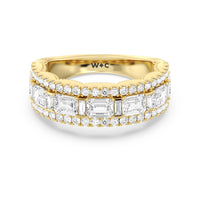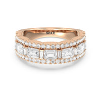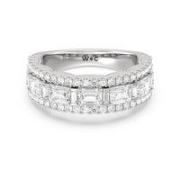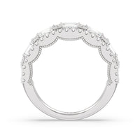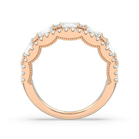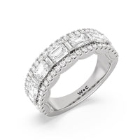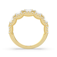 Equal parts romantic and elegant, this anniversary ring will really sweep your beloved off her feet. This ring with a scalloped and milgrain-detailed gallery features a central row of alternating emerald-cut stones and channel-set baguette-cut stones. Framing them are round stones lining the edges.