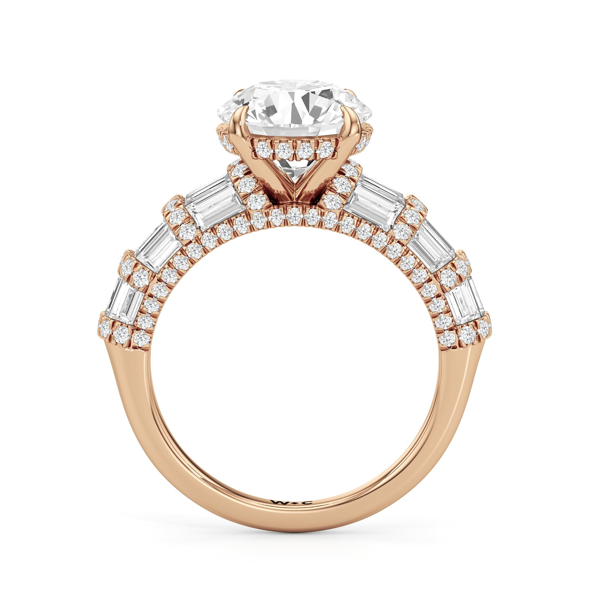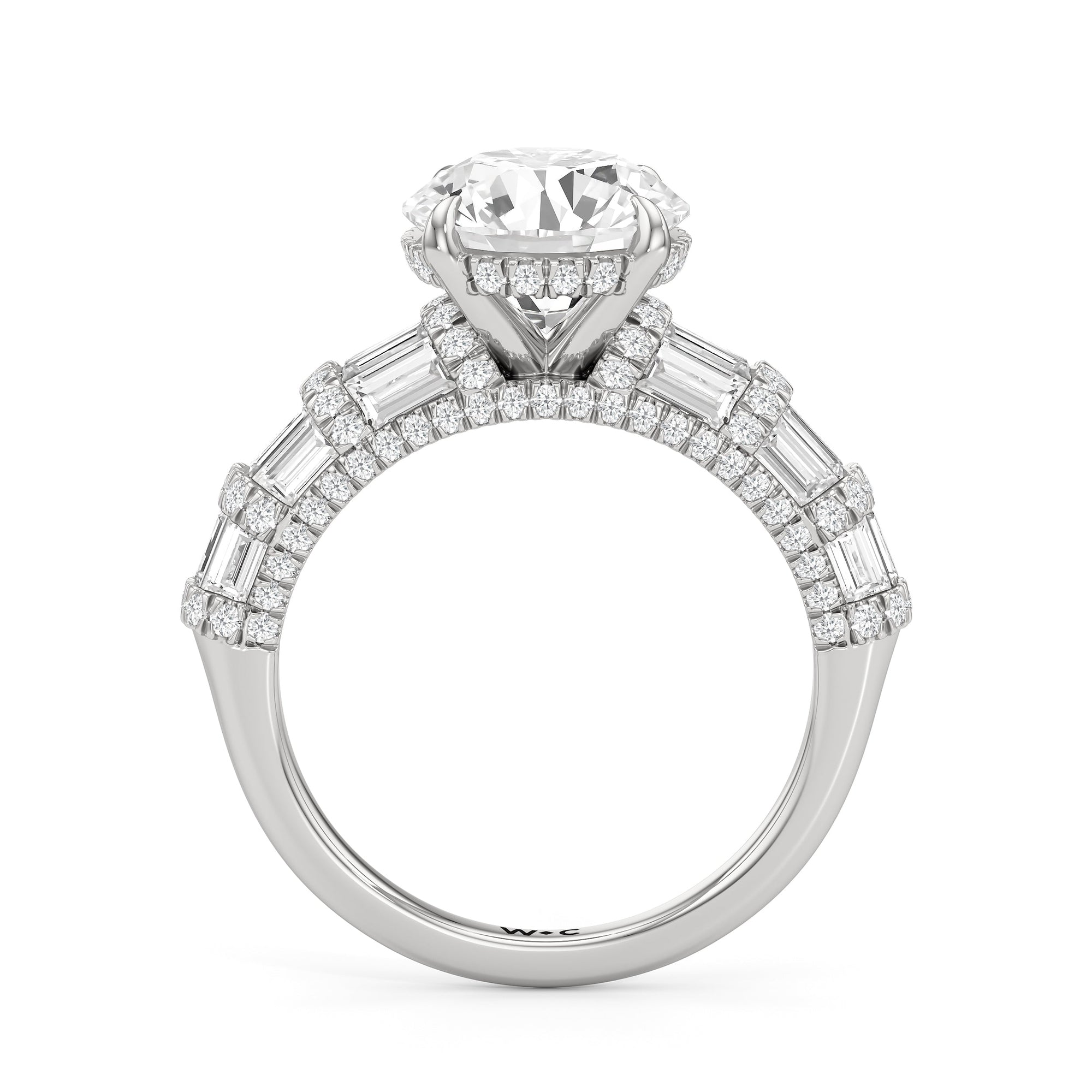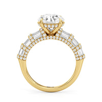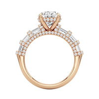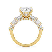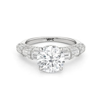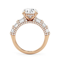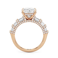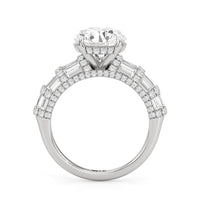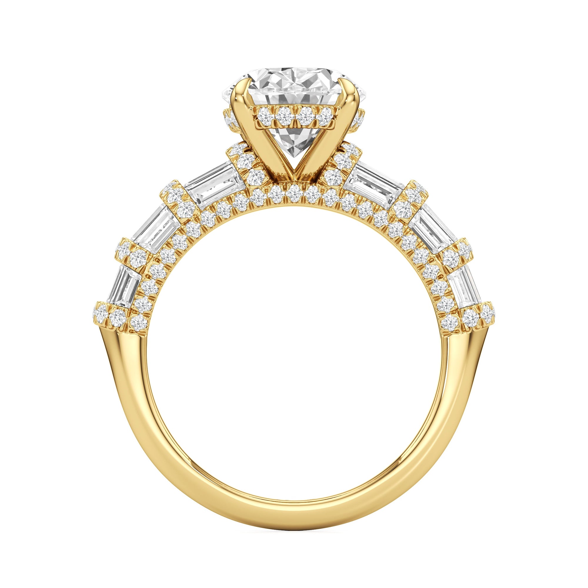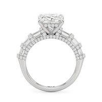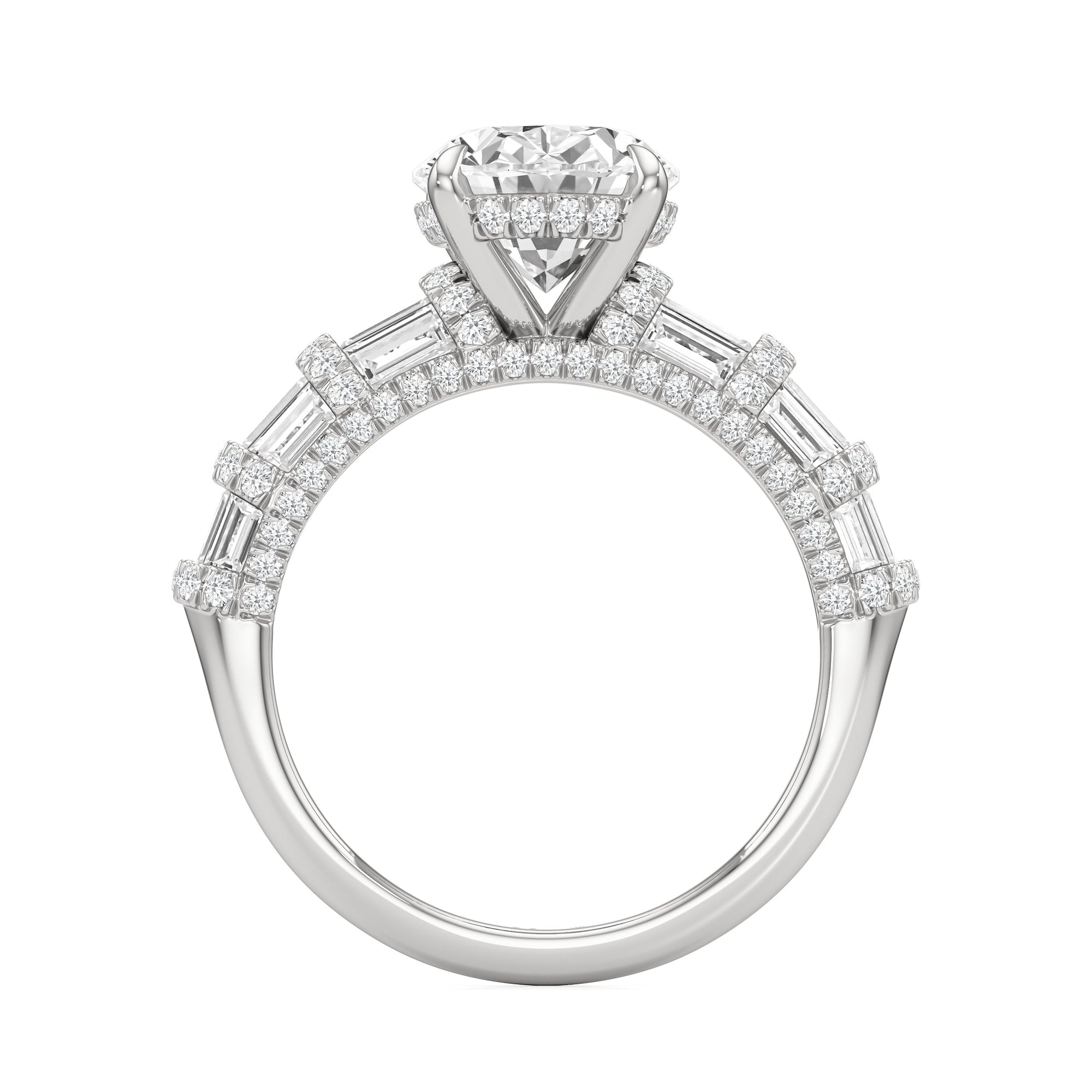 Architectural and graceful. Tapered baguette diamonds form a soft dome along the shoulders, creating a tiered effect separated by diamond collars. A diamond-studded basket secures the center stone, while a scalloped arc of petite diamonds traces the gallery for a hidden glow.