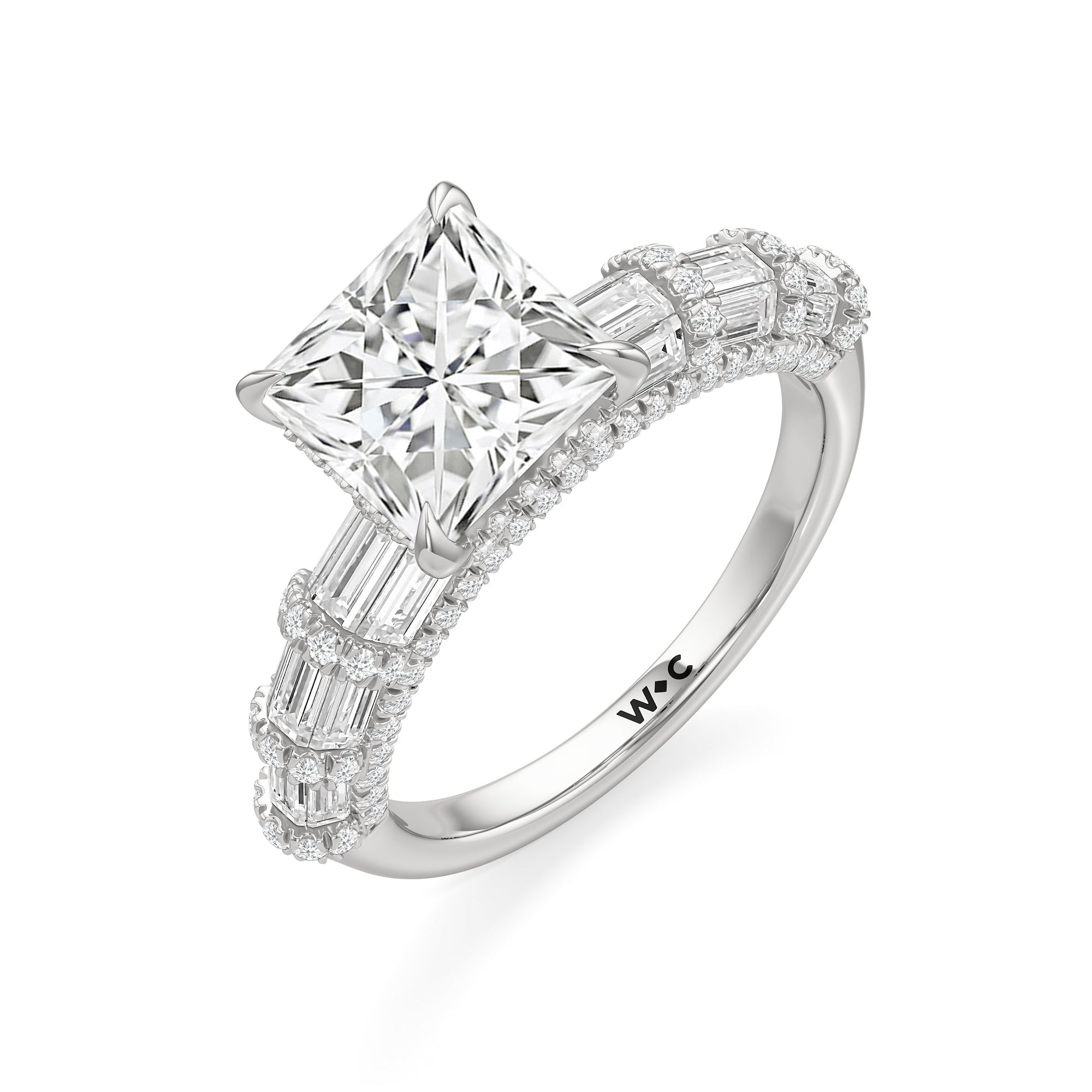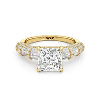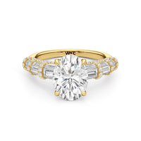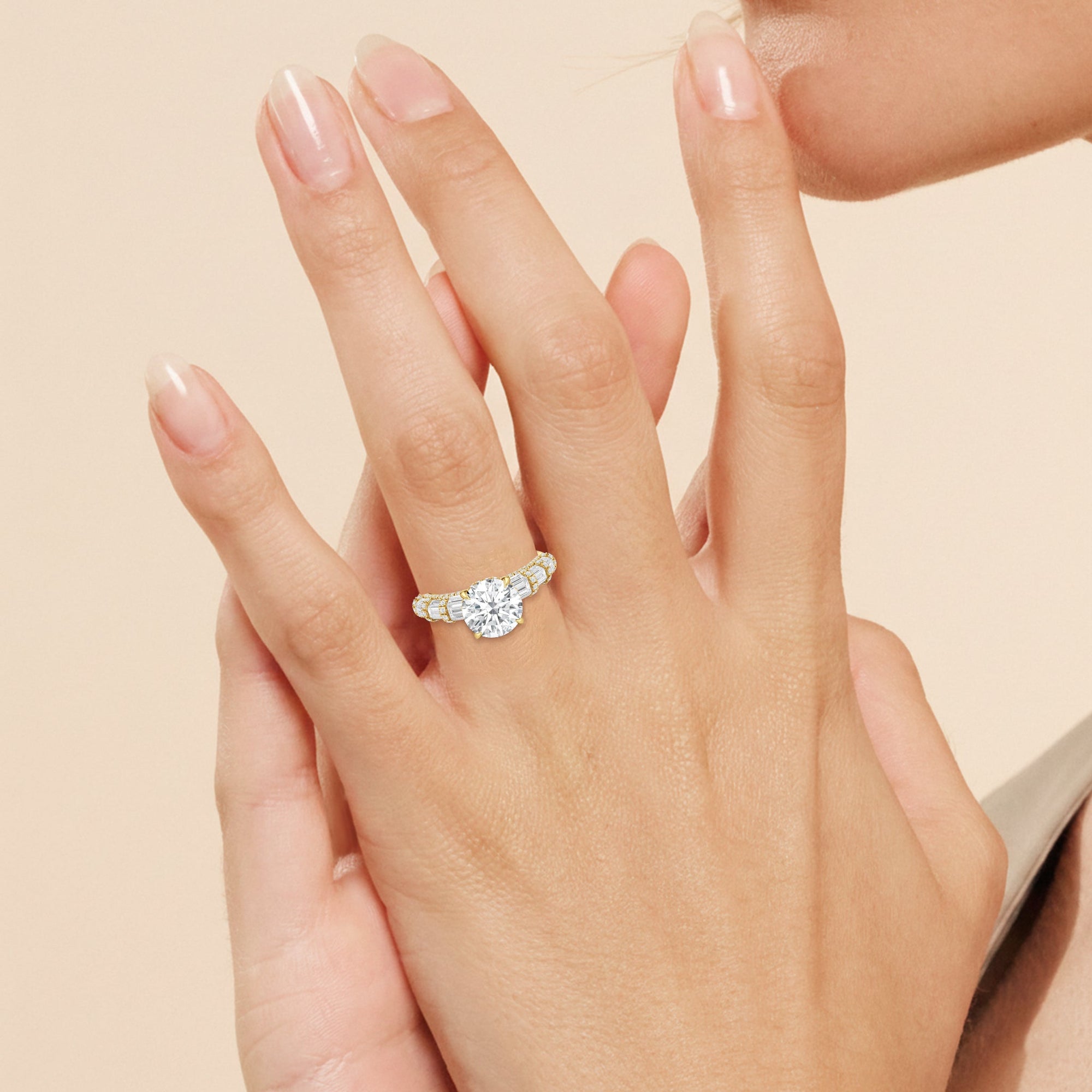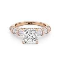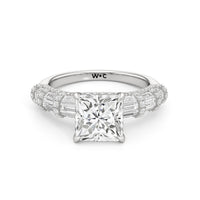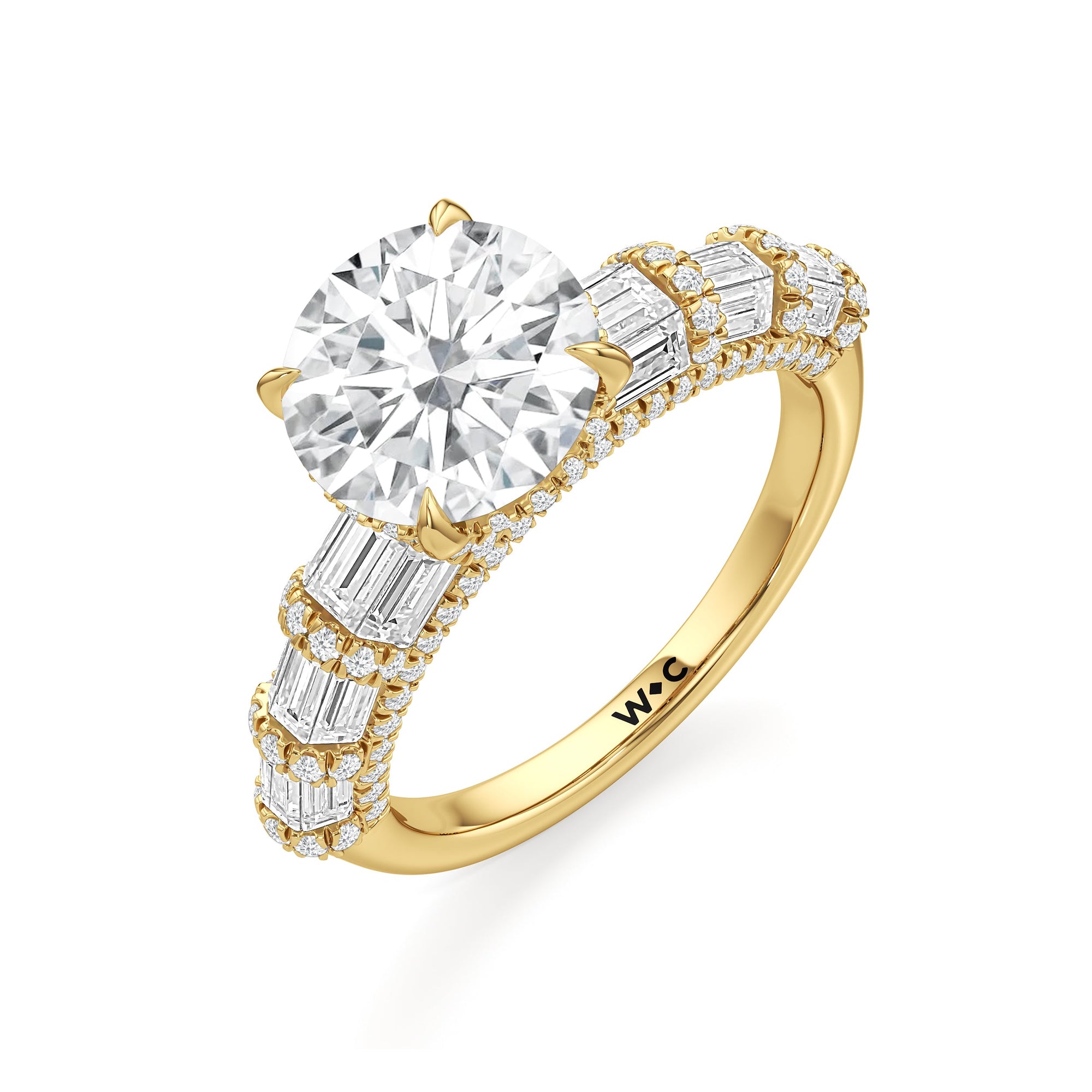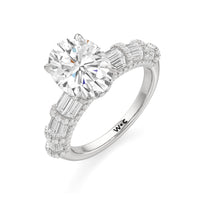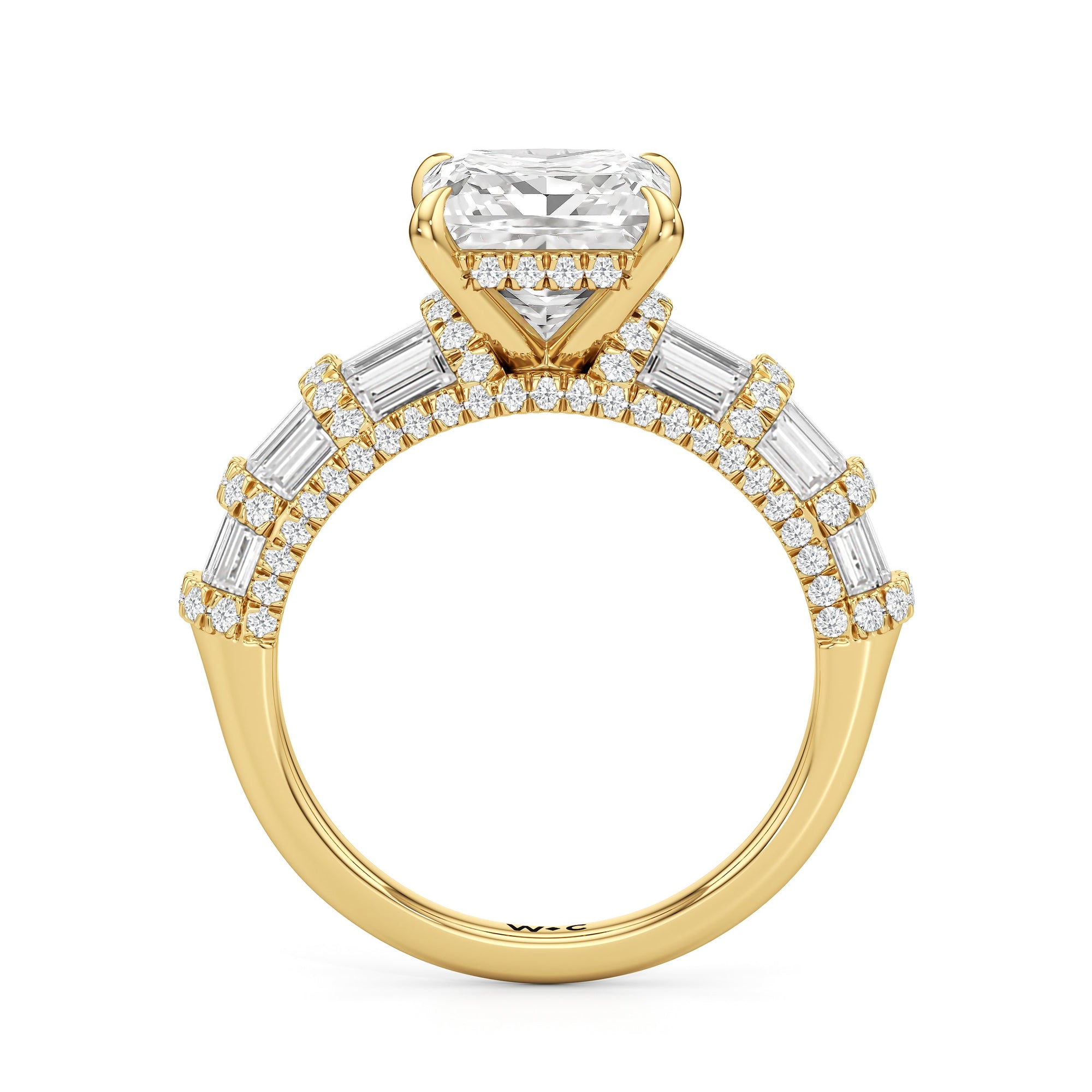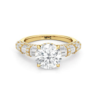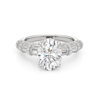 Architectural and graceful. Tapered baguette diamonds form a soft dome along the shoulders, creating a tiered effect separated by diamond collars. A diamond-studded basket secures the center stone, while a scalloped arc of petite diamonds traces the gallery for a hidden glow.