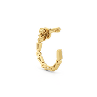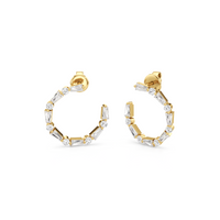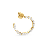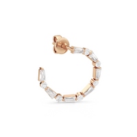 A well-rounded beauty. These earrings showcase an elegant row of round and tapered baguette diamonds, creatively and precisely set in an alternating pattern. Their sculptural simplicity creates a graceful curve, forming an almost complete circle.