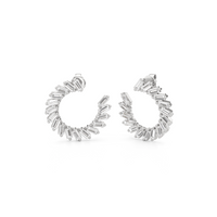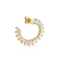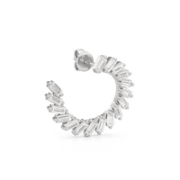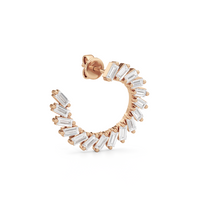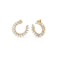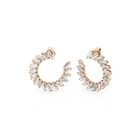 Crafted with precision, this pair of diamond earrings balances classic elegance with modern edge. It features a spiraling circle of baguette diamonds, with their stepped facets delivering linear flashes of light and a sleek, mirror-like shine.