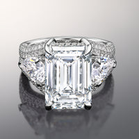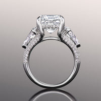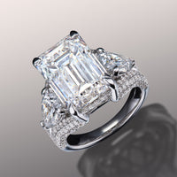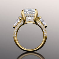 Embrace meticulous handwork with a mesmerizing blend of individuality that mirrors your unique love story. Exuding glamour, this ring features a shimmering split pave band that leads to a jaw-dropping emerald-cut diamond center stone. Right in the middle of each splitting shoulder is a pear diamond that also serves as a side stone. The rail that secures the central gem is also lined with petite round diamonds for a sparkle that never ends.