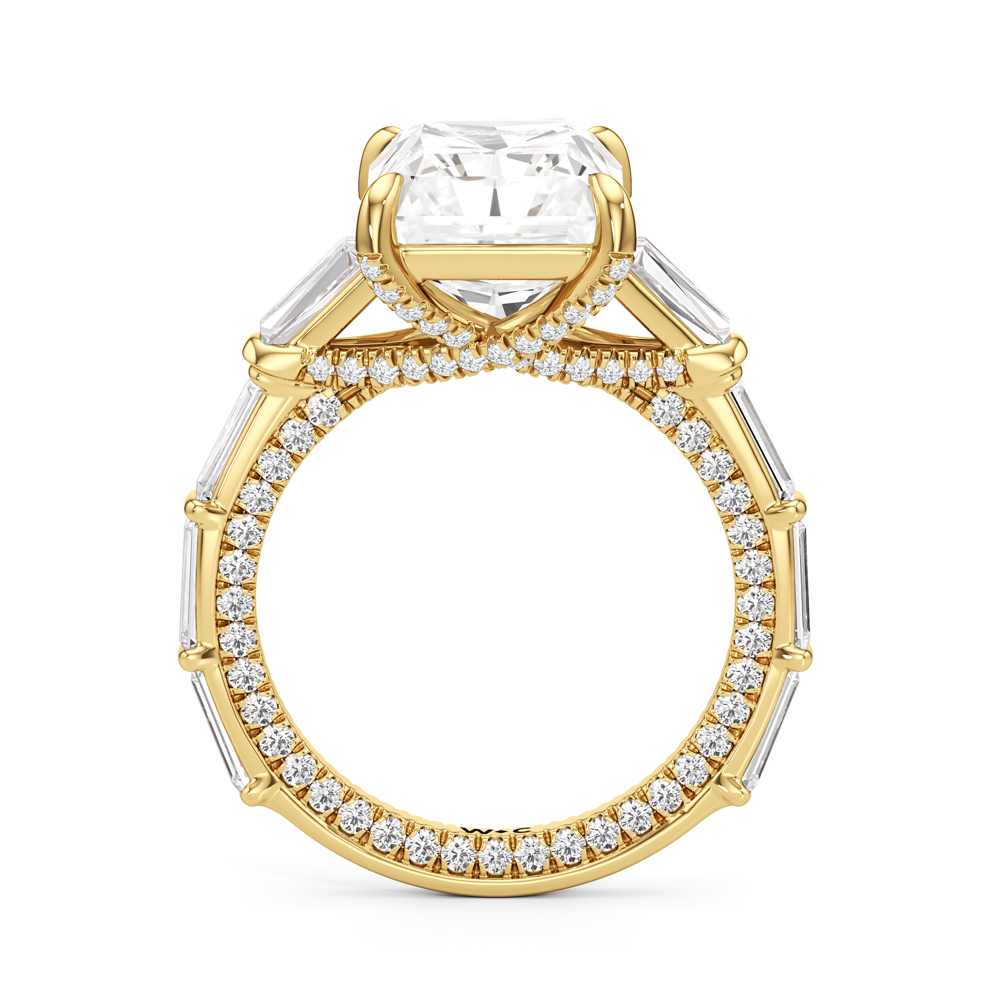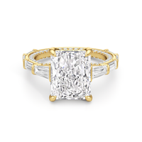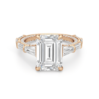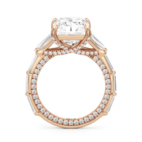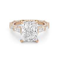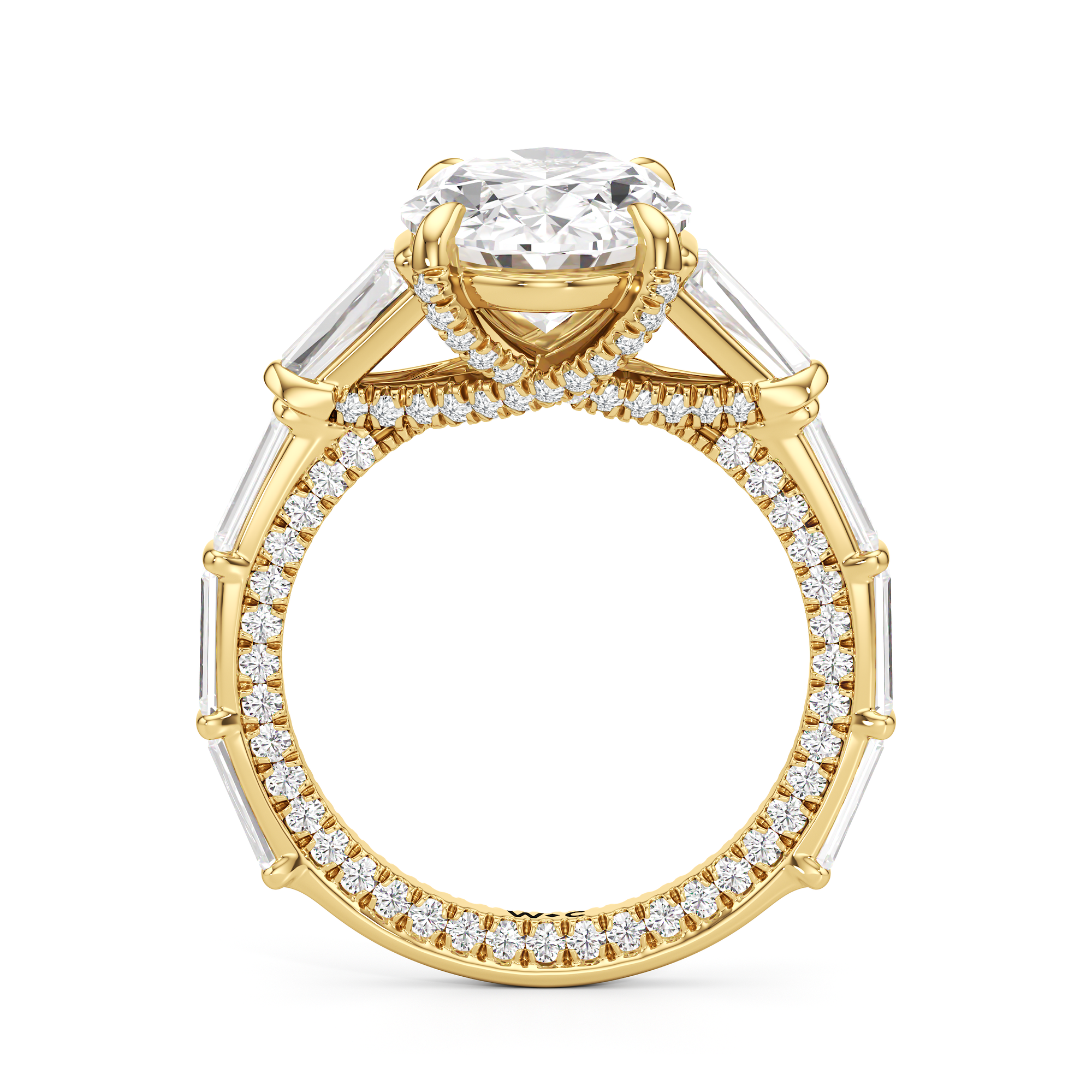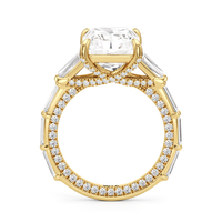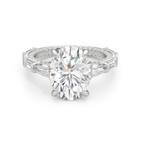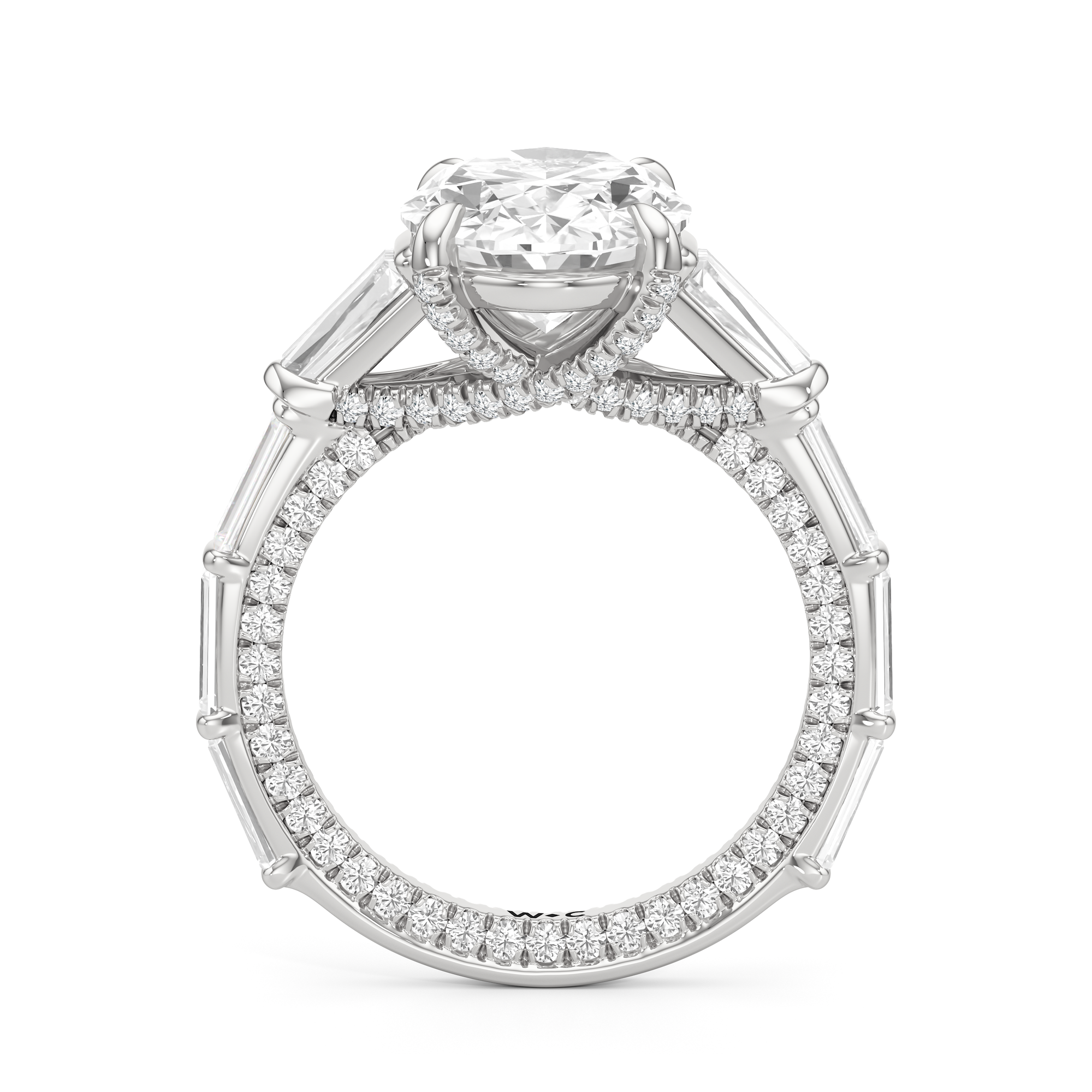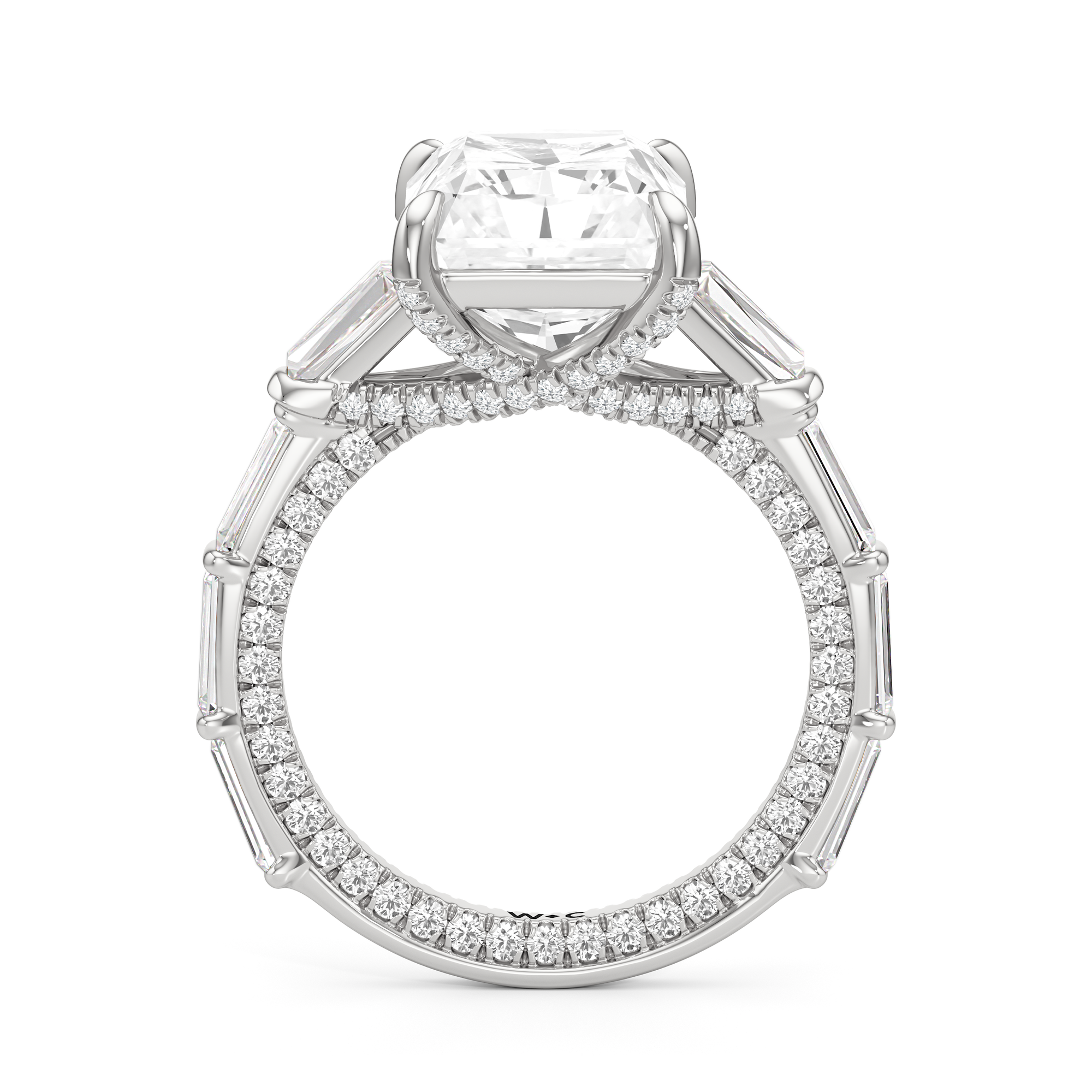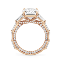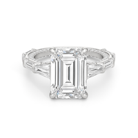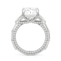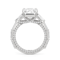 Statuesque but refined. Tapered baguettes flank the luminous center, tracing the shank in a continuous stream of light. From the side, petite round diamonds drape the gallery like fine lace, offering an ornate detail for the wearer alone.